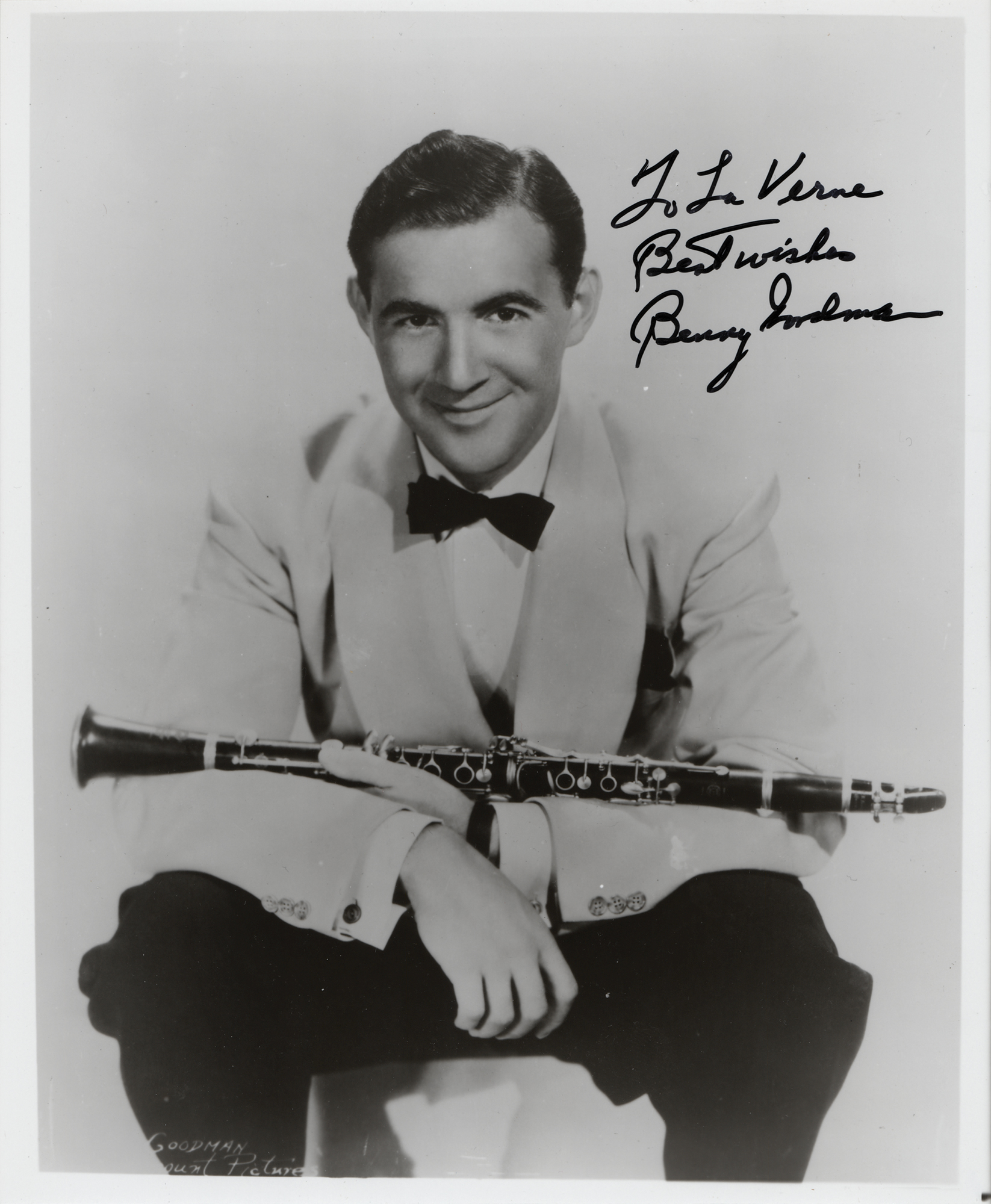 Glossy 8 x 9.75 photo of Goodman seated and posing with his clarinet across his lap, signed and inscribed in black felt tip, "To LaVerne, Best Wishes, Benny Goodman." In fine condition.