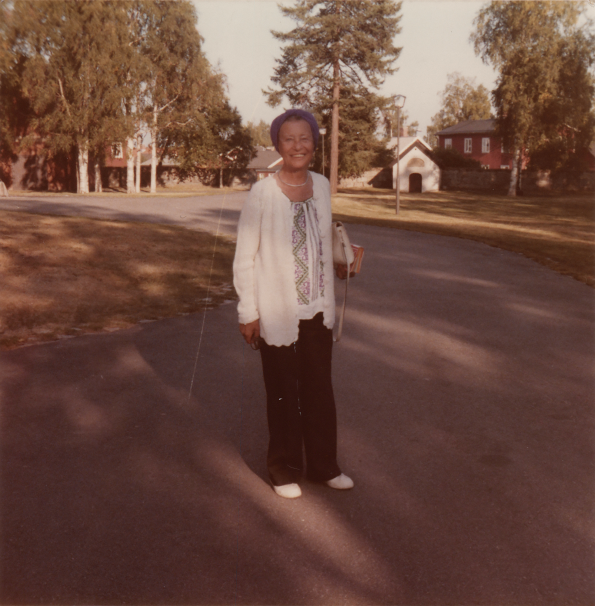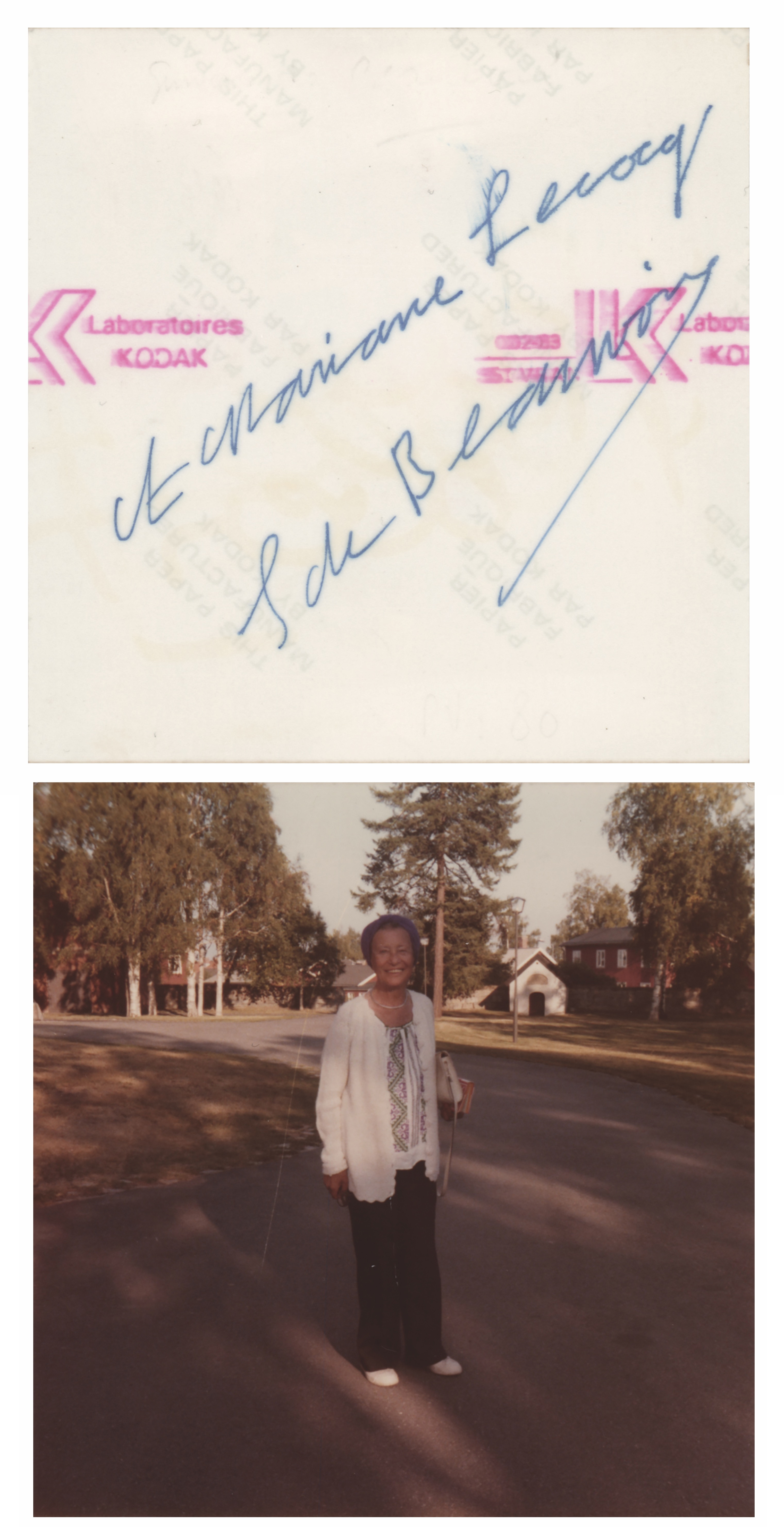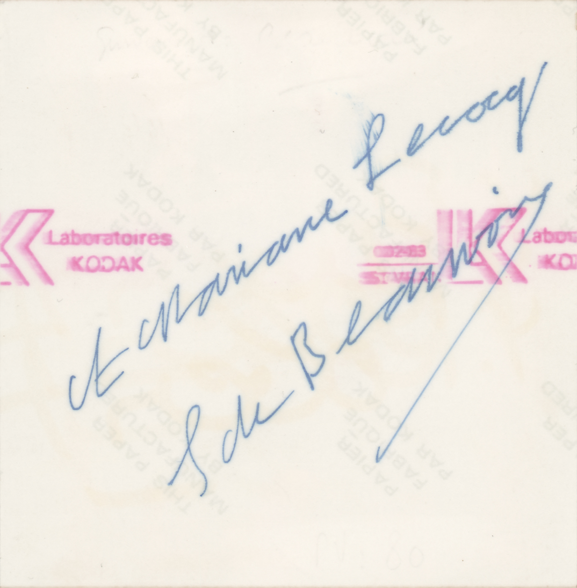 French existentialist, writer, and social essayist (1908–1986). Color glossy 3.5 x 3.75 candid photo of Simone de Beauvoir posing in a driveway, signed and inscribed on the reverse in blue ink, "A Mariane Lecocq, S. de Beauvoir." In very fine condition.