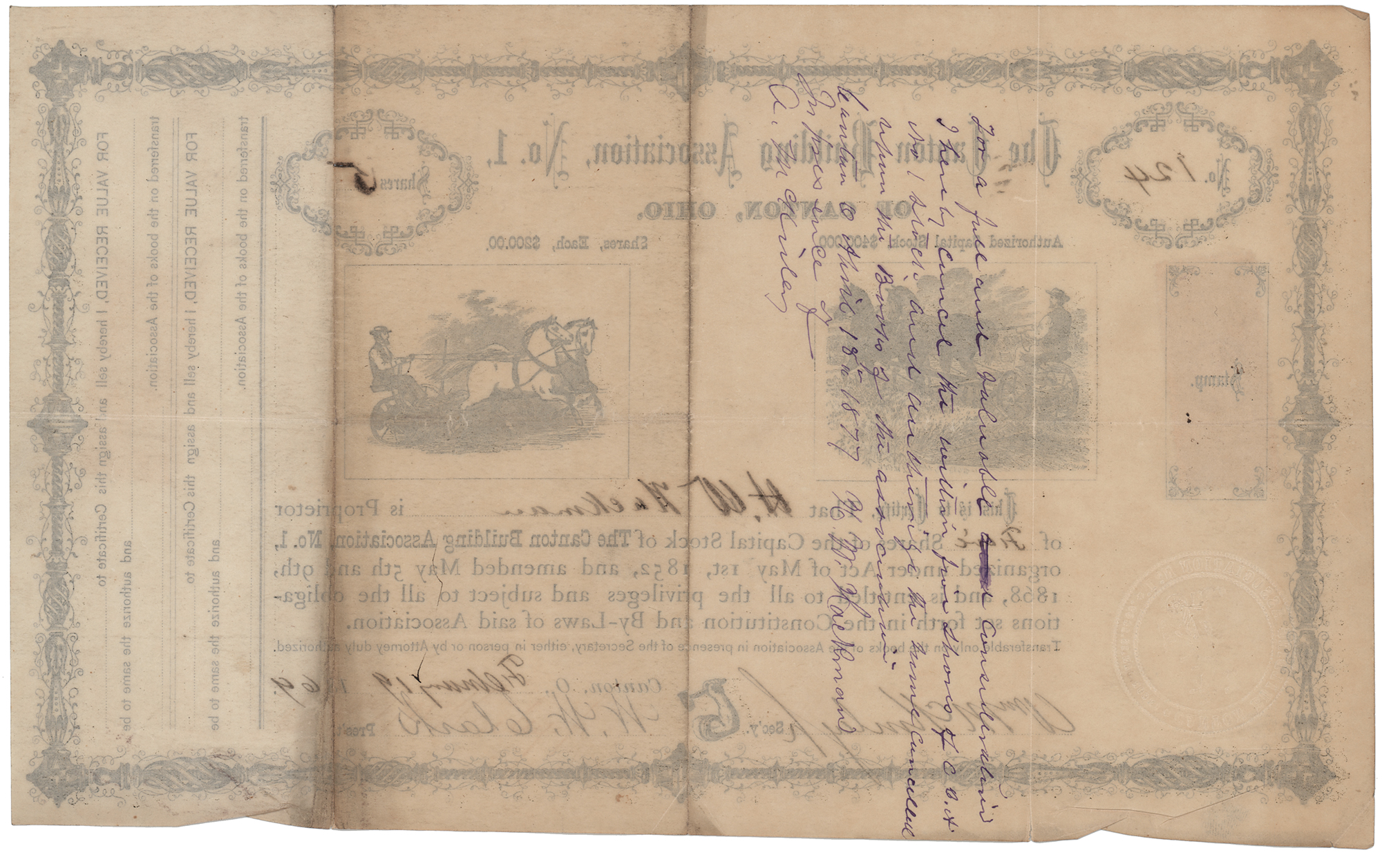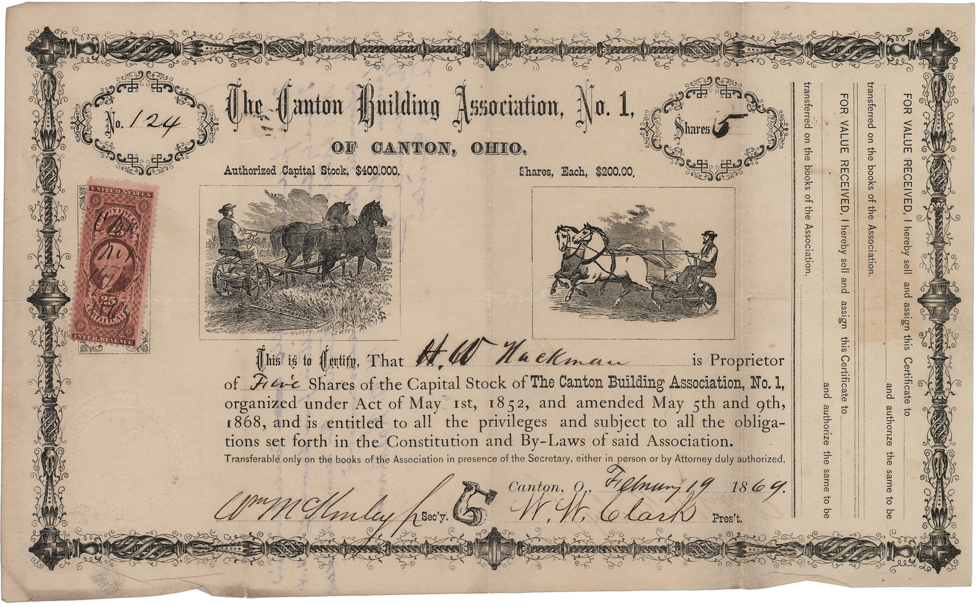 Partly-printed DS, signed “Wm. McKinley, Jr.,” one page, 11.75 x 7.25, February 19, 1869. Stock certificate for five shares in the Canton Building Association, No. 1, of Canton, Ohio, issued to H. W. Hackman, signed at the conclusion in ink by William McKinley as secretary and W. W. Clark as the organization's president. In fine condition. Organized in 1869, the Canton Building Association was the first savings and loan association established in Canton, Ohio; William McKinley, then just 26 years old, was chosen unanimously as its first secretary.