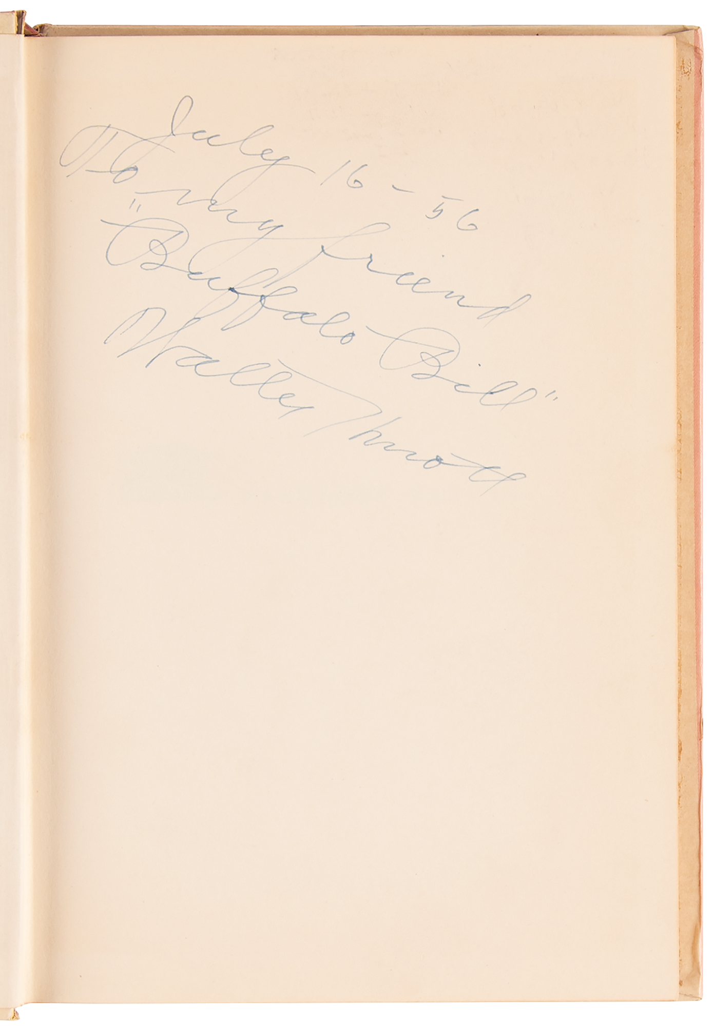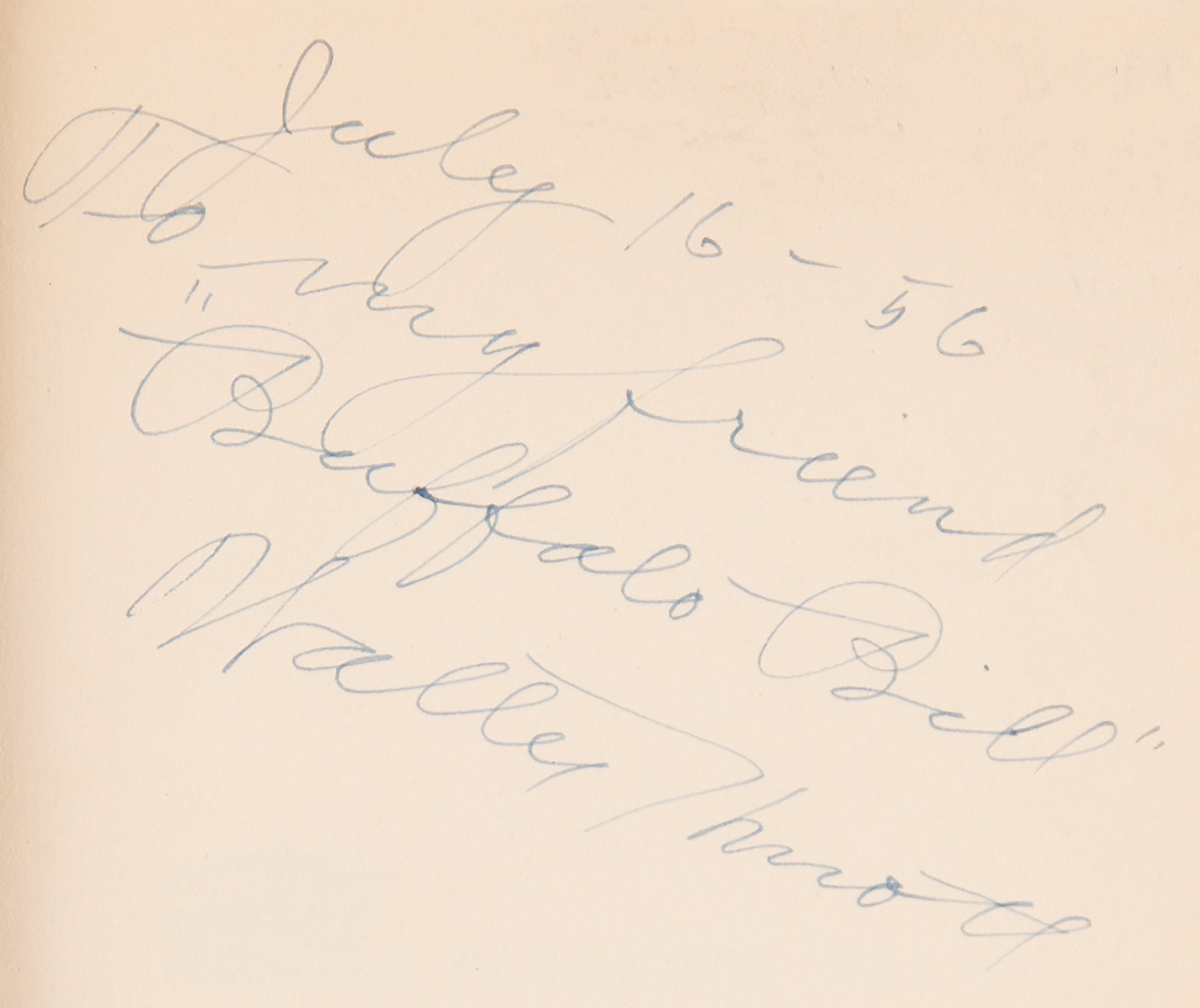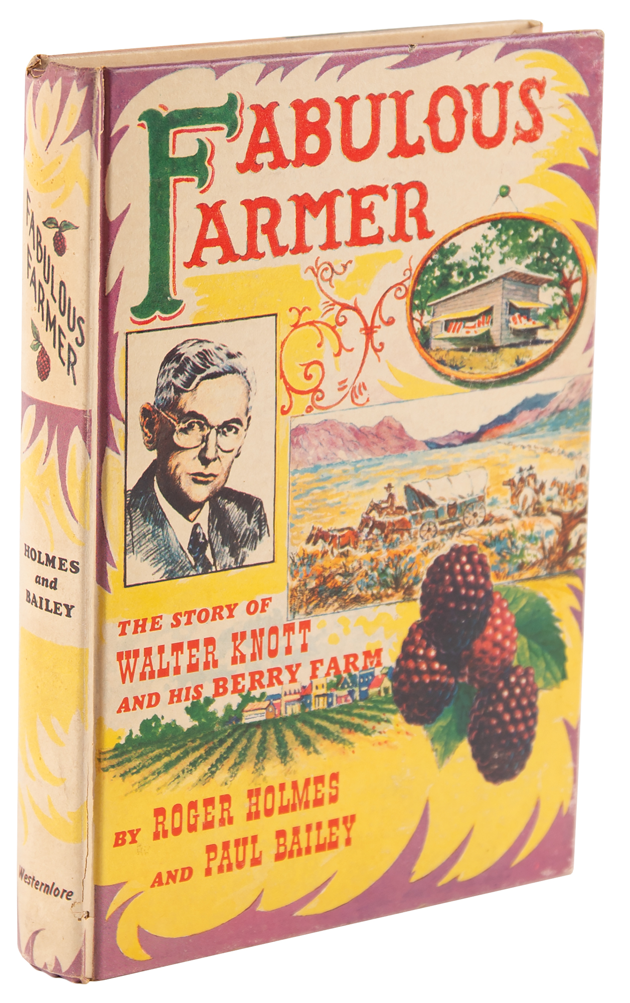 American entrepreneur (1889-1981) who pioneered the berry farm-as-tourist destination, which he then transformed into the 'Knott's Berry Farm' amusement park. Signed book: Fabulous Farmer. First edition. Los Angeles: Westernlore Publishers, 1956. Hardcover, 5.75 x 8.25, 184 pages. Signed and inscribed on the first free end page in fountain pen, "July 16-56, To my friend 'Buffalo Bill,' Walter Knott." In fine condition, with subtle splitting to joints.