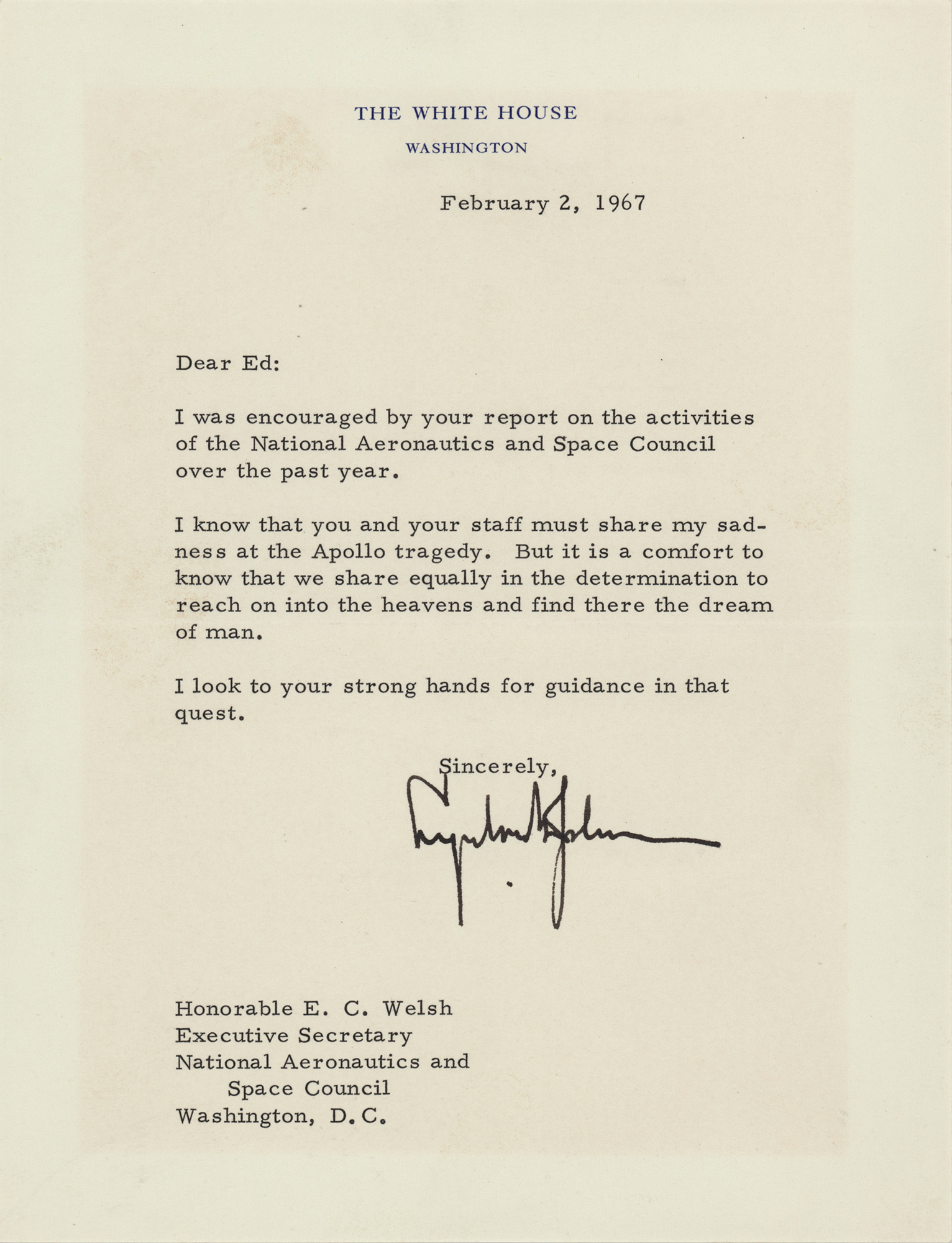 TLS as president, one page, 6.75 x 8.75, White House letterhead, February 2, 1967. Letter to E. C. Welsh, executive secretary of the National Aeronautics and Space Council, in full: "I was encouraged by your report on the activities of the National Aeronautics and Space Council over the past year. I know that you and your staff must share my sadness at the Apollo tragedy. But it is a comfort to know that we share equally in the determination to reach into the heavens and find there the dream of man. I look to your strong hands for guidance in that quest." In fine condition, with a faint block of toning from prior display and a few small pieces of tape to reverse.