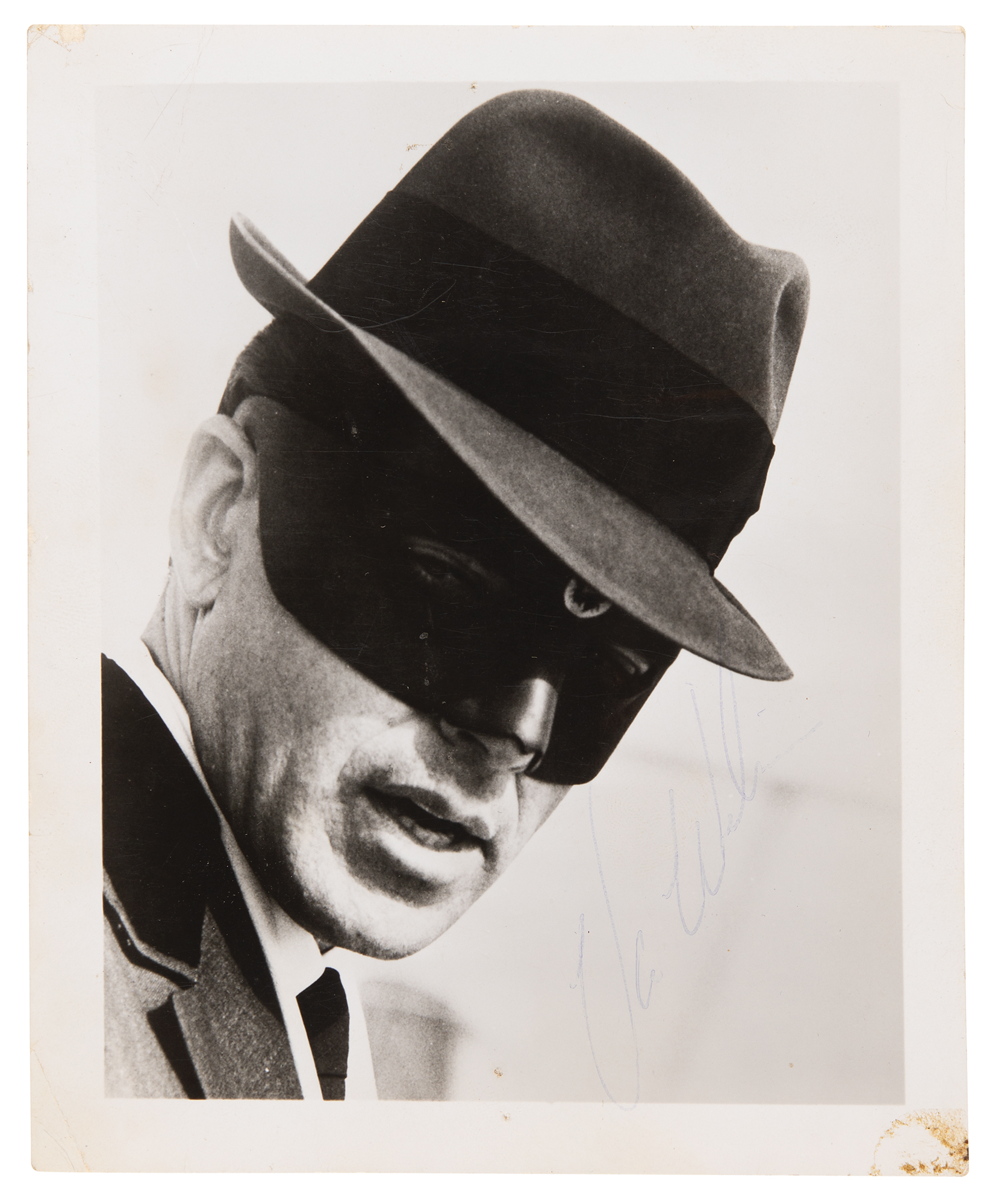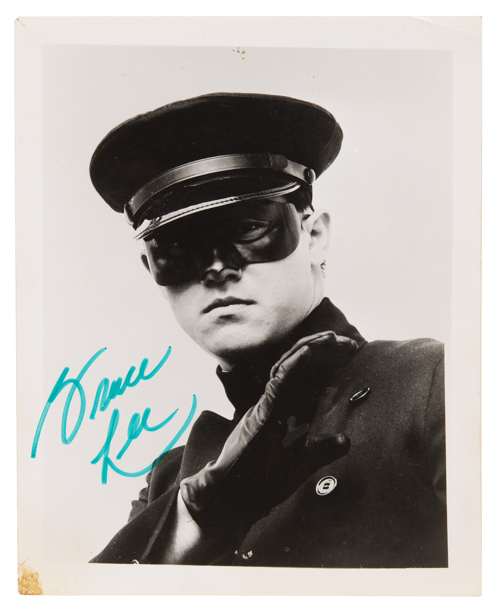 Two vintage glossy 4 x 5 promotional photos of the main stars of The Green Hornet television series, one of Bruce Lee as Kato, signed neatly in green felt tip, “Bruce Lee,” and the other of Van Williams as the Green Hornet, signed in black ballpoint, “Van Williams.” In overall very good to fine condition, with a single tack hole to the top edge, and some old tape stains to the corners.