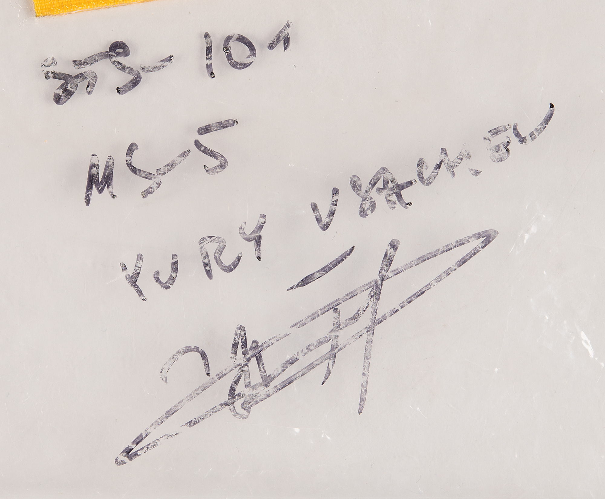 Four embroidered Advanced Crew Escape Suit (ACES) patches flown to the International Space Station aboard Space Shuttle Atlantis during STS-101, originating from the collection of cosmonaut Yury Usachev. Includes an STS-101 mission insignia patch, "Yury Usachev" name tag patch, American flag patch, and Russian flag patch, all with Velcro backings. Held together in a zipper-lock bag with affixed Velcro swatch, signed below in black felt tip, "STS-101, MS-5, Yury Usachev." In overall fine condition. Accompanied by a letter of provenance signed by Usachov, in full: "I certify that this signed by Yury Usachev ziplock bag, that contains an STS- 101 patch, a US Flag patch, a Russian Flag patch and Yury Usachev name tag, all with Velcro on the versa, was flown aboard Atlantis during STS 101 by me, Yury Usachev. They are from my personal collection. The mission was a 10- day mission conducted between 19 May 2000 and 29 May 2000. STS-101 traveled 4.1 million miles and completed 155 revolutions of the earth." Also accompanied by a photo of Usachev wearing the patches on his orange 'pumpkin suit.'