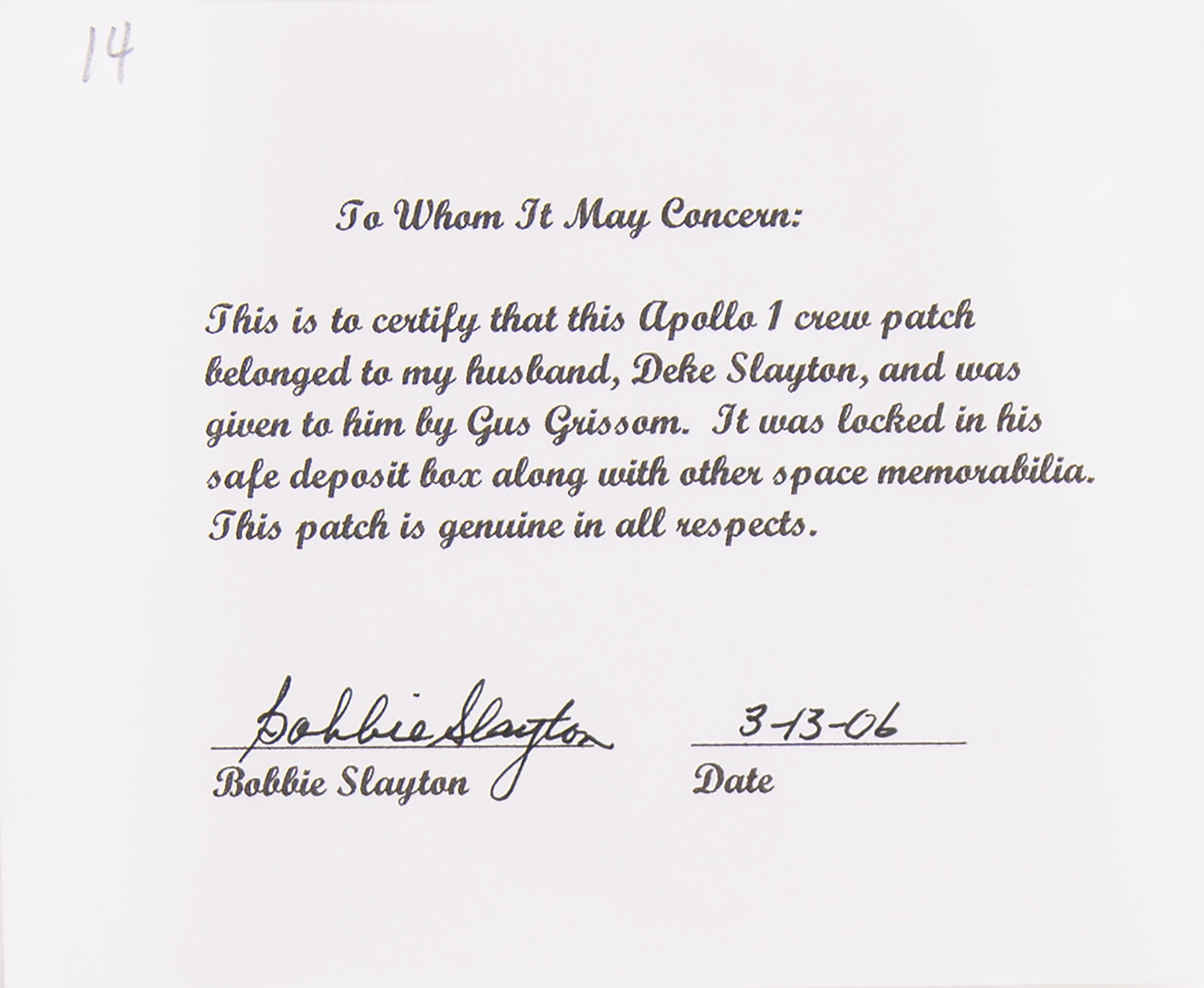 Sought-after official embroidered patch for the Apollo 1 mission, 3.5˝ in diameter, originally and exclusively distributed to the crew and a handful of NASA workers. The reverse bears its original "Stylized Emblem Co." label. Designed by the crew, the Apollo 1 insignia depicts a command and service module flying over the southeastern United States with Florida (the launch point) prominent; the moon is seen in the distance, symbolic of the program's ultimate goal. A yellow border carries the mission and astronaut names, set within another border featuring stars and stripes. In fine condition. Accompanied by a signed letter of provenance from Bobbie Slayton, dated March 13, 2006, in full: "This is to certify that this Apollo 1 crew patch belonged to my husband, Deke Slayton, and was given to him by Gus Grissom. It was locked in his safe deposit box along with other space memorabilia. This patch is genuine in all respects."