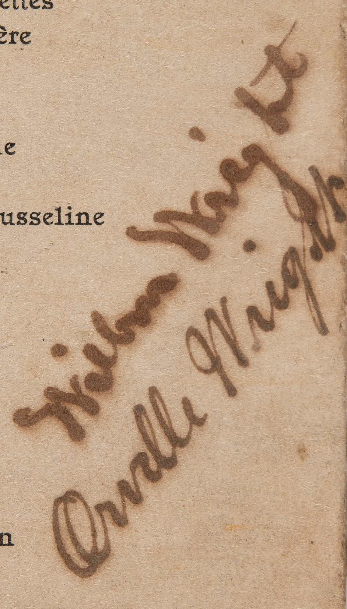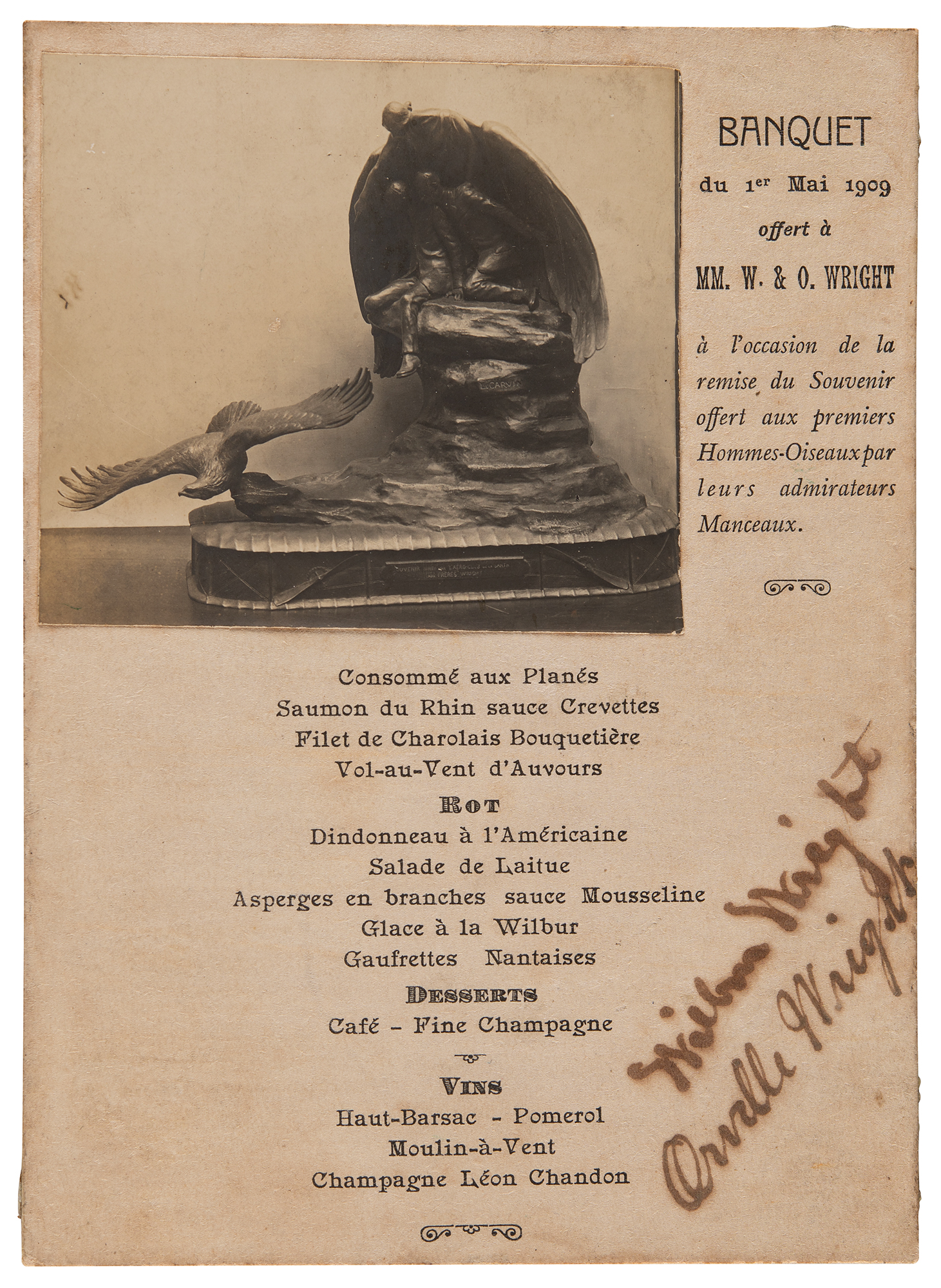 Menu page for a banquet honoring the Wright Brothers, held at the Hotel du Dauphin on May 1, 1909, and hosted by the Aero Club of Sarthe, one page, 4.75 x 6.5, signed in bold fountain pen, “Wilbur Wright” and “Orville Wright.” A printed dedication in French to the upper right reads (translated): “Banquet of May 1, 1909 offered to Messrs. W. & O. Wright on the occasion of the presentation of the Souvenir offered to the first Birdmen by their admirers from Le Mans.” The left side bears an affixed photograph of a bronze trophy that was presented to the Wright Brothers at the banquet. In very good to fine condition, with light overall soiling, and minor spreading to the signatures.
