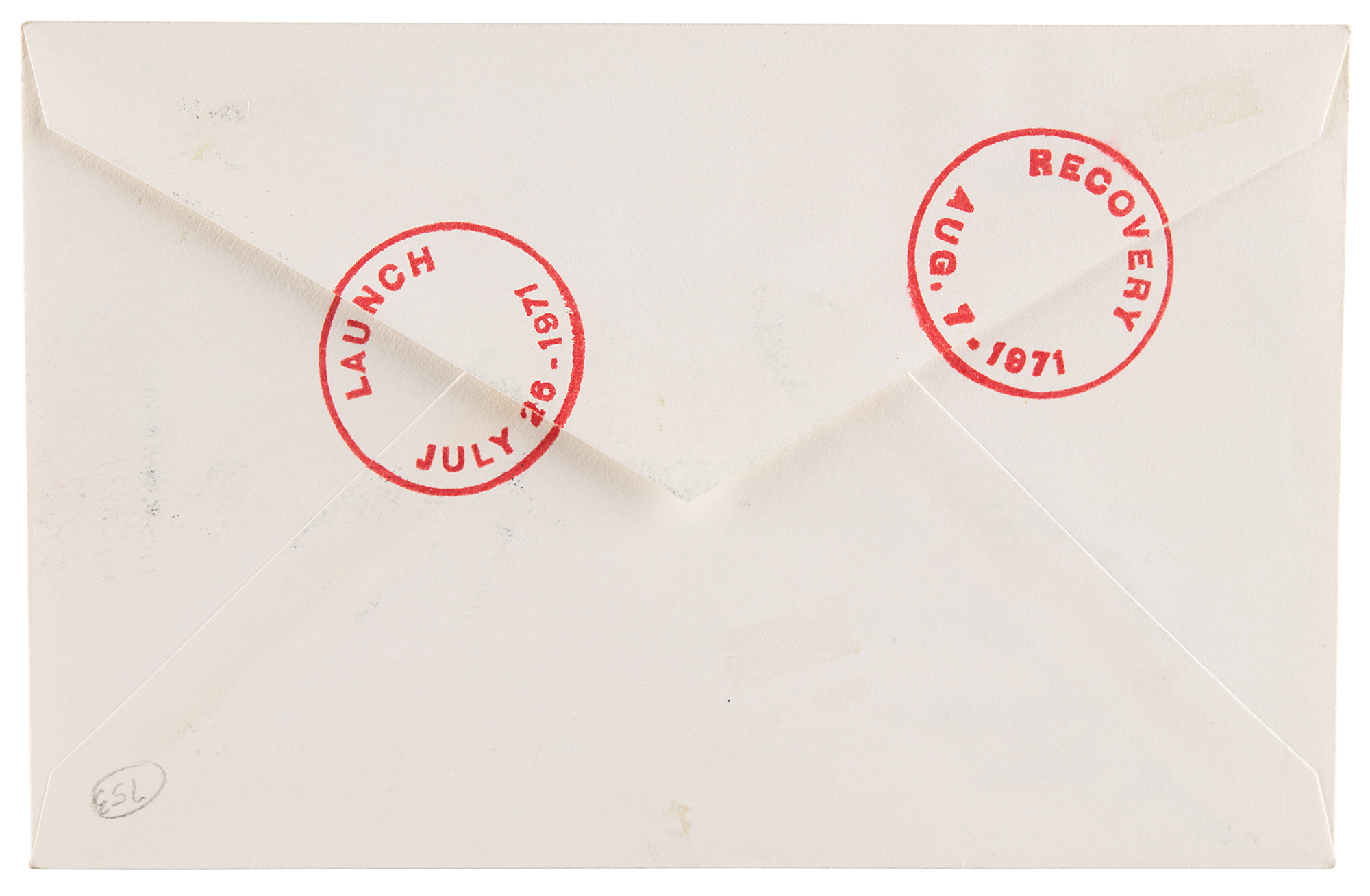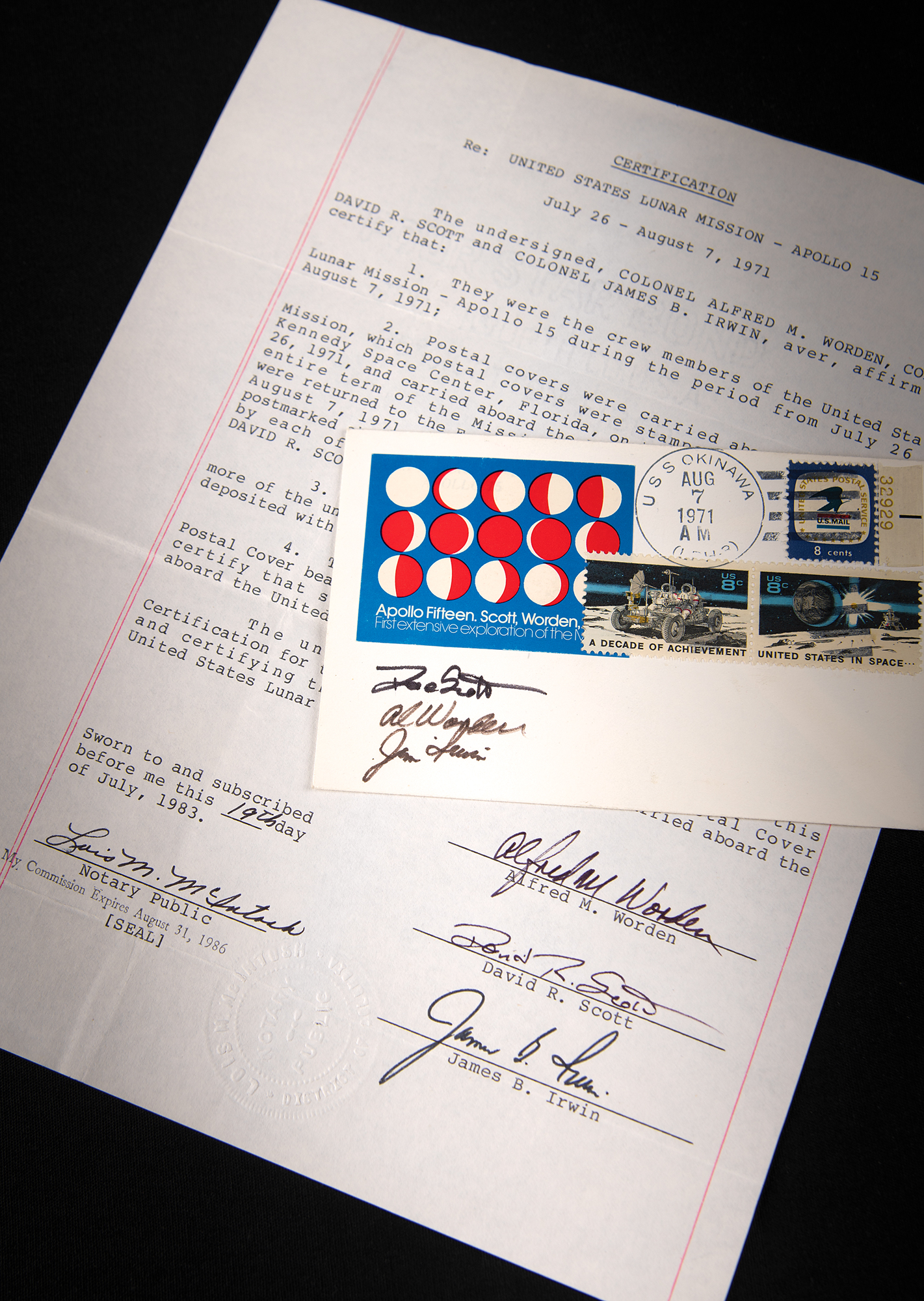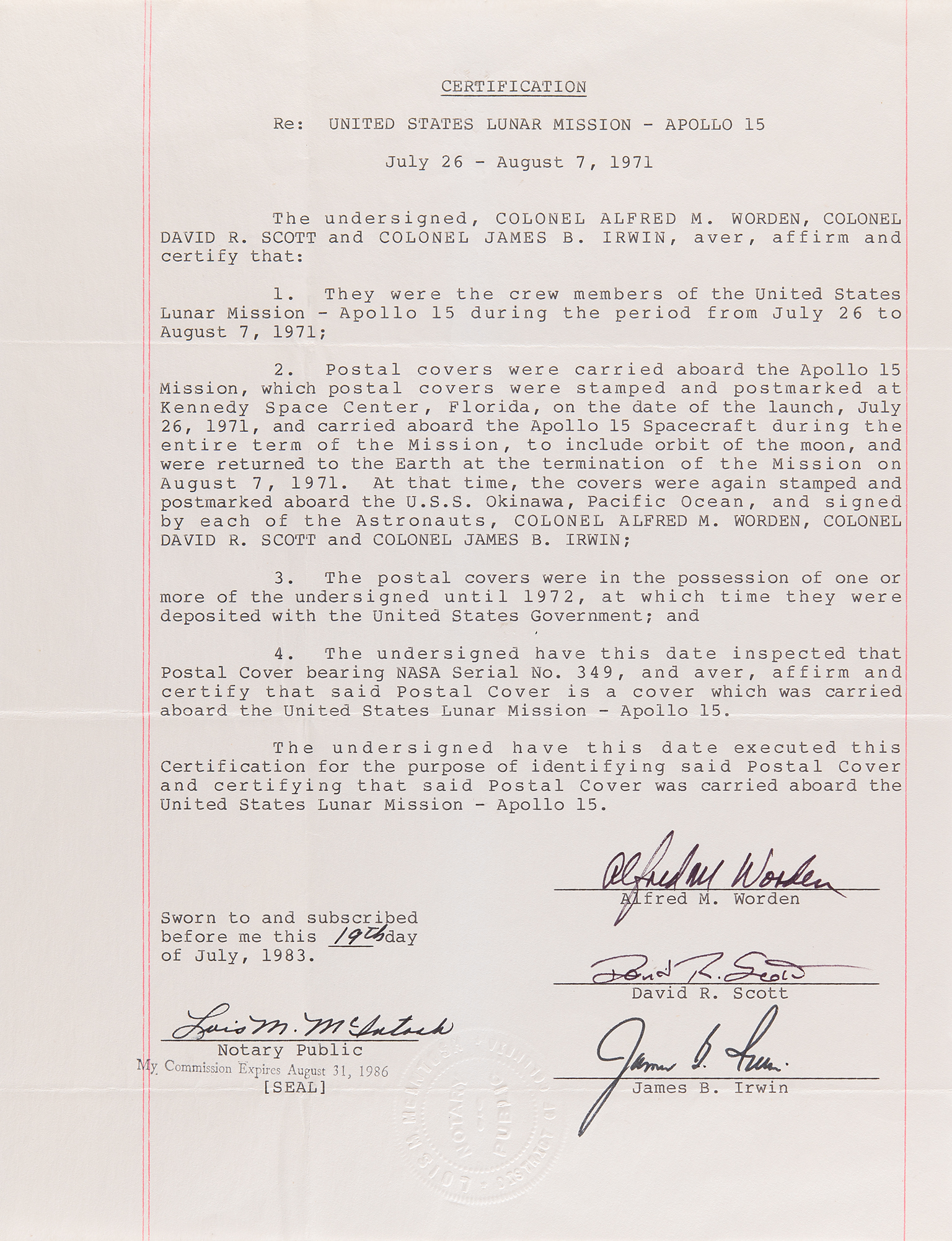 Accompanied by a one-page typed notarized certificate, signed "Alfred M. Worden," "David R. Scott," and "James B. Irwin." The provenance reads, in part: "Postal covers were carried aboard the Apollo 15 Mission, which postal covers were stamped and postmarked at Kennedy Space Center, Florida, on the date of the launch, July 26, 1971, and carried aboard the Apollo 15 Spacecraft during the entire term of the Mission, to include orbit of the moon, and were returned to the Earth at the termination of the Mission on August 7, 1971…The postal covers were in the possession of one or more of the undersigned until 1972, at which time they were deposited with the United States Government…The undersigned have this date inspected that Postal Cover bearing NASA Serial No. 349, and aver, affirm and certify that said Postal Cover is a cover which was carried aboard the United States Lunar Mission – Apollo 15."