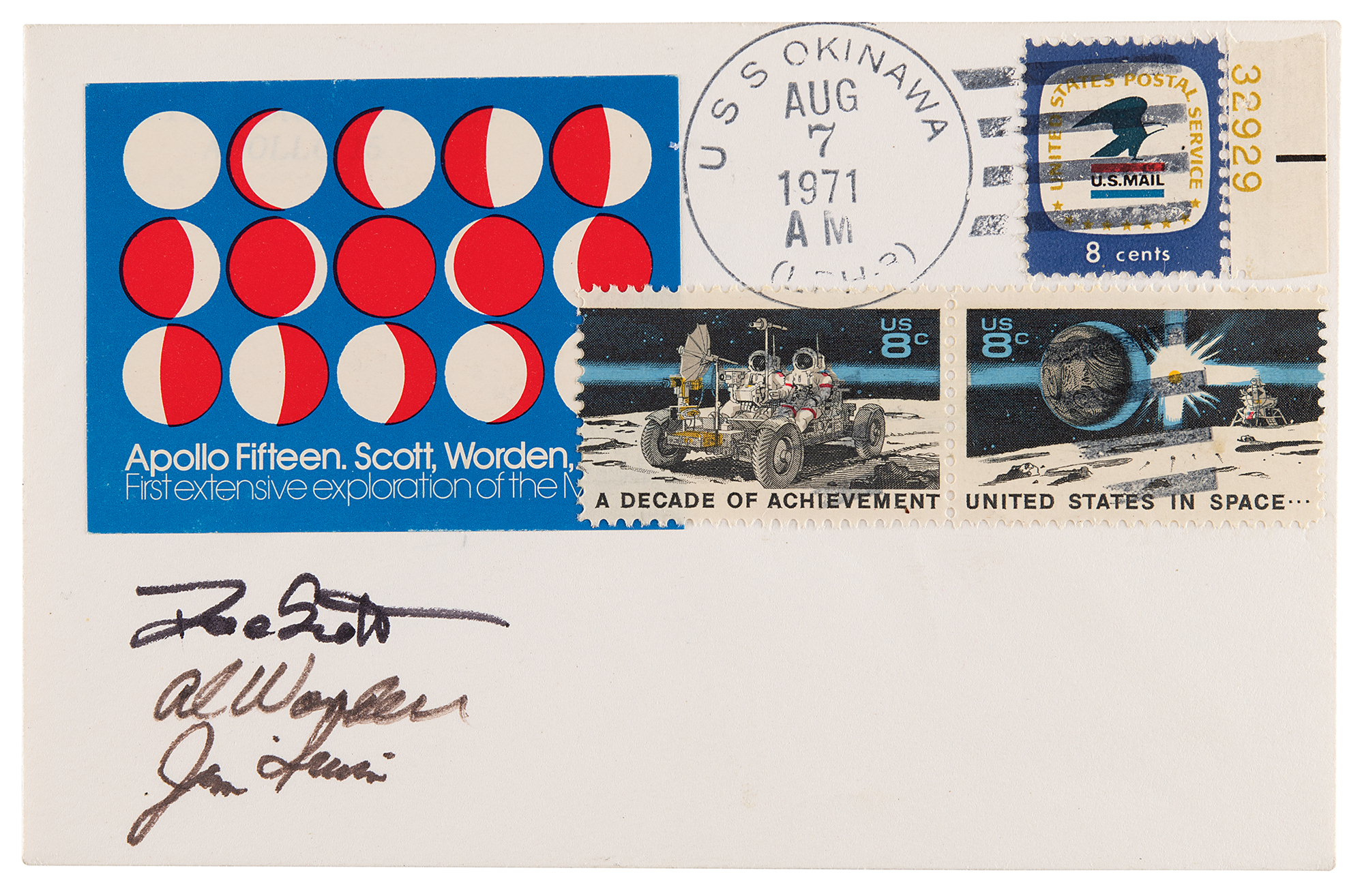 Flown 'Phases of the Moon' postal cover carried into lunar orbit during the Apollo 15 mission, 5.5 x 3.5, bearing an affixed color cachet which shows all 15 phases of the moon, an August 7, 1971, USS Okinawa postal cancellation, and signed in black felt tip by Dave Scott, Al Worden, and Jim Irwin. Cover is numbered under the flap, "349," and initialed by NASA's general counsel S. Neil Hosenball. In fine condition.
