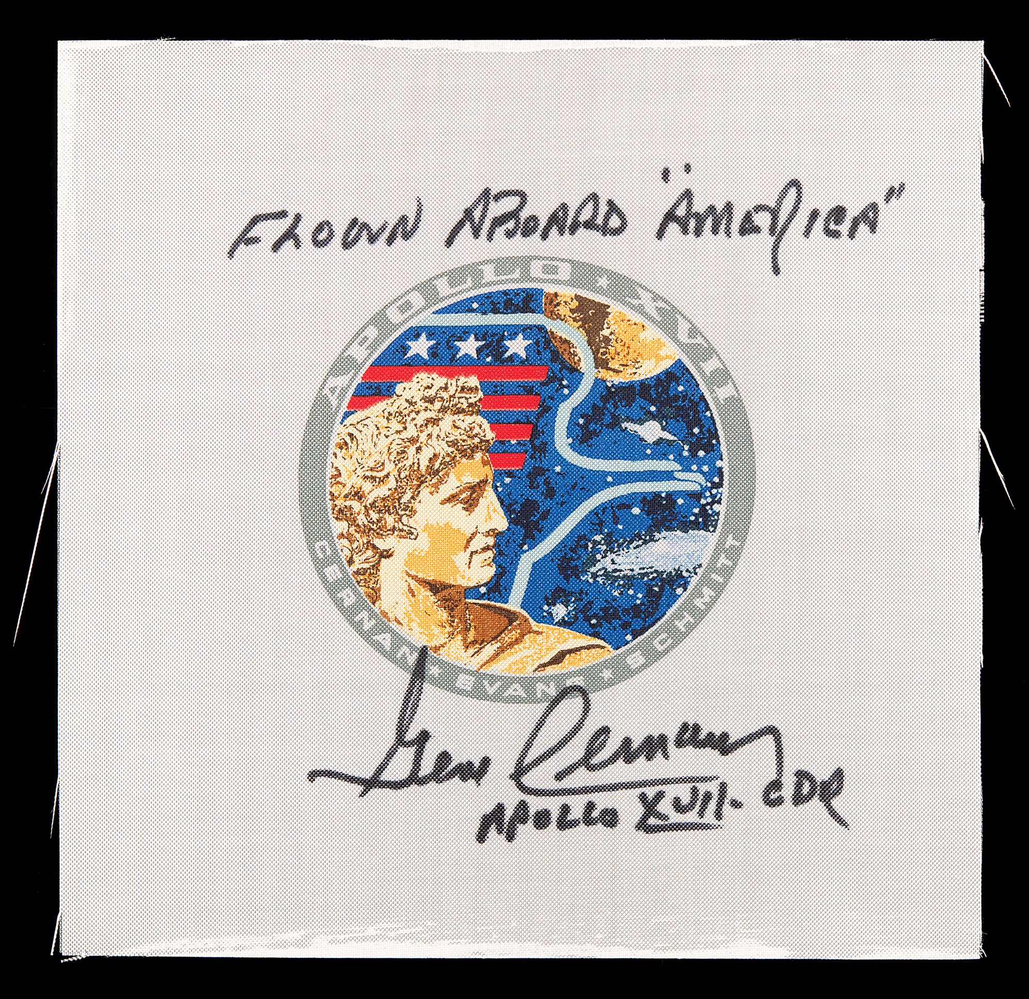 Superb flown 7˝ x 7˝ swatch of Beta cloth featuring the Apollo 17 mission emblem in the center, signed and flight-certified in black felt tip by the commander, "Flown aboard 'America,' Gene Cernan, Apollo XVII – CDR." In fine condition. Carried into lunar orbit aboard the CSM 'America' during the Apollo program's final moon landing mission, this is an attractive, boldly signed flight-flown piece.