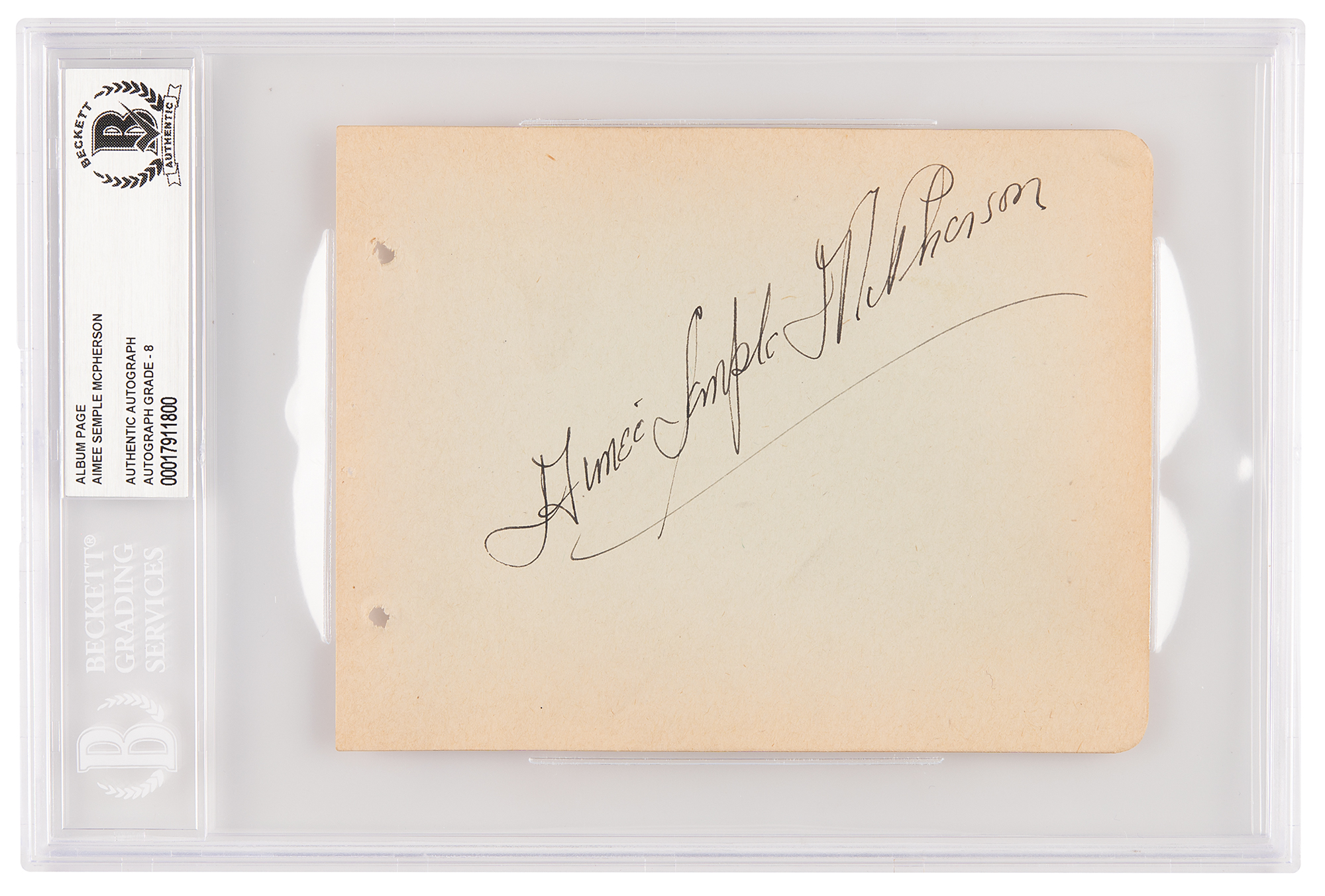 Pentecostal evangelist and media celebrity (1890-1944) in the 1920s and 1930s who became famous for founding the Foursquare Church. McPherson has been noted as a pioneer in the use of modern media, because she used radio to draw on the growing appeal of popular entertainment in North America and incorporated other forms into her weekly sermons at Angelus Temple, one of the first megachurches. Large vintage fountain pen signature, "Aimee Semple McPherson,” on an off-white 5.75 x 4.25 album page. In fine condition, with light edge toning. Encapsulated and graded by Beckett Authentication Services as "Autograph Grade - 8."