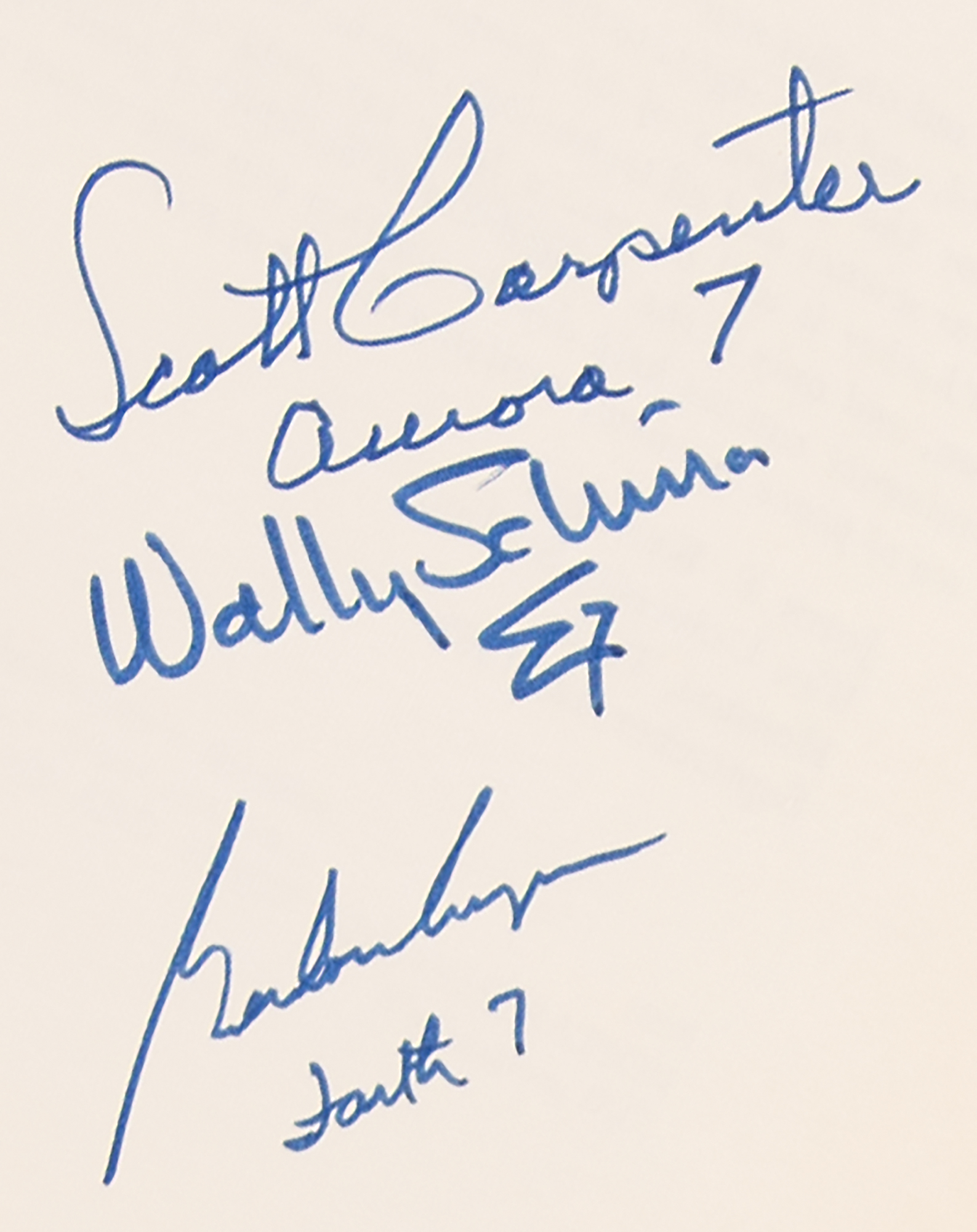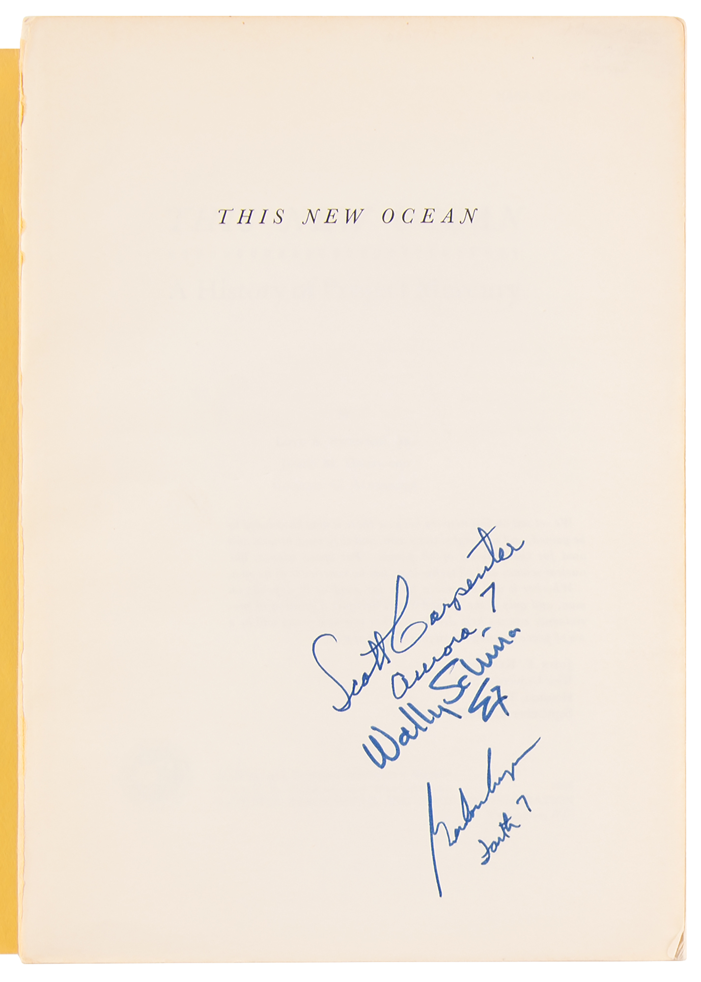 Multi-signed book: This New Ocean: A History of Project Mercury. First edition. Washington, DC: NASA, 1966. Softcover, 6.5 x 9.75, 681 pages. Signed on the half-title page in felt tip by three Mercury astronauts: “Scott Carpenter, Aurora 7,” “Wally Schirra [Sigma 7],” and “Gordon Cooper, Faith 7.” In very good condition, with creasing to the spine, and the front cover fully detached but present.