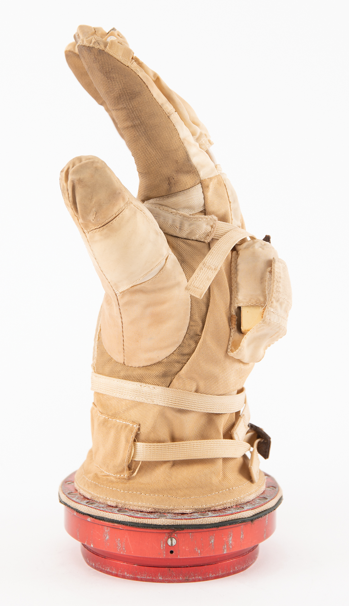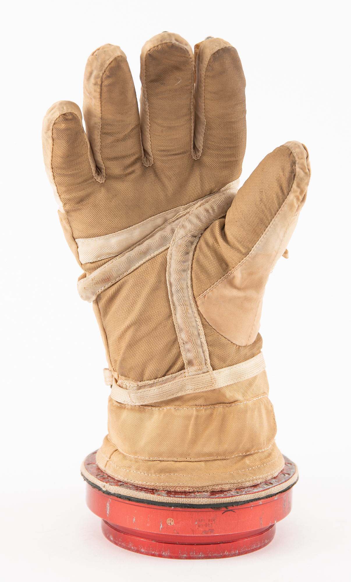 Circa 1966 Gemini G4-C right-handed training glove, standing 10˝ in height, with a diameter of 4˝, consisting of a neoprene liner cover and a few layers of nonporous cloth, exterior adjustable restraints, and small flashlights on the index and middle fingers that are connected to a battery pack on the back of the hand. The glove attaches to the suit via a red anodized aluminum wrist ring, which bears engraved part numbers: “ASSY 826, SN 257.” Although the glove was likely manufactured by the David Clark Company, the identification label is no longer present, as the interior black wrist section is nearly entirely disintegrated. In very good condition, with overall toning, scuffing to the wrist ring, and scattered wear to the glove’s interior, which is quite fragile.