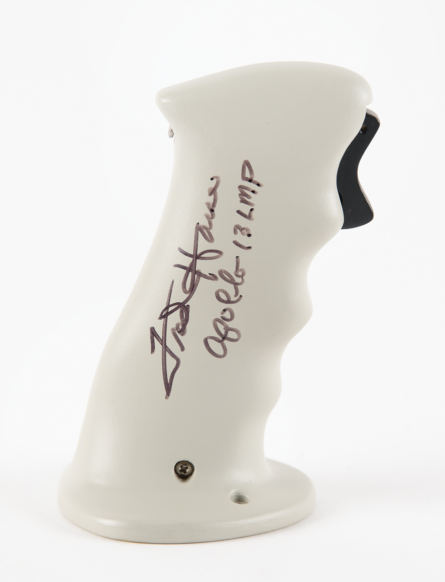 Replica of an Apollo rotational hand controller handle, measuring 4.5˝ tall, signed on the side in black felt tip, "Fred Haise, Apollo 13 LMP." In very fine condition.
