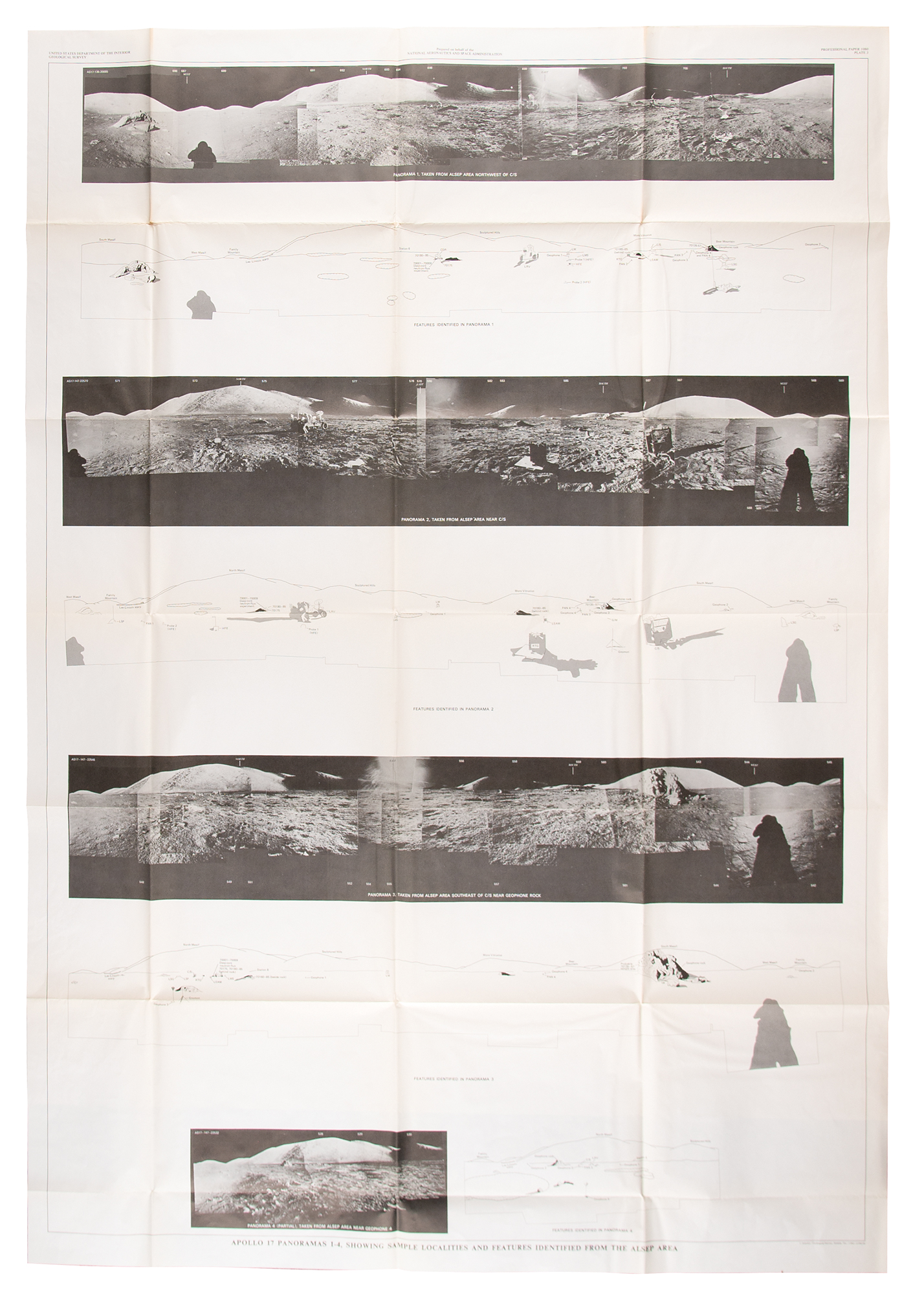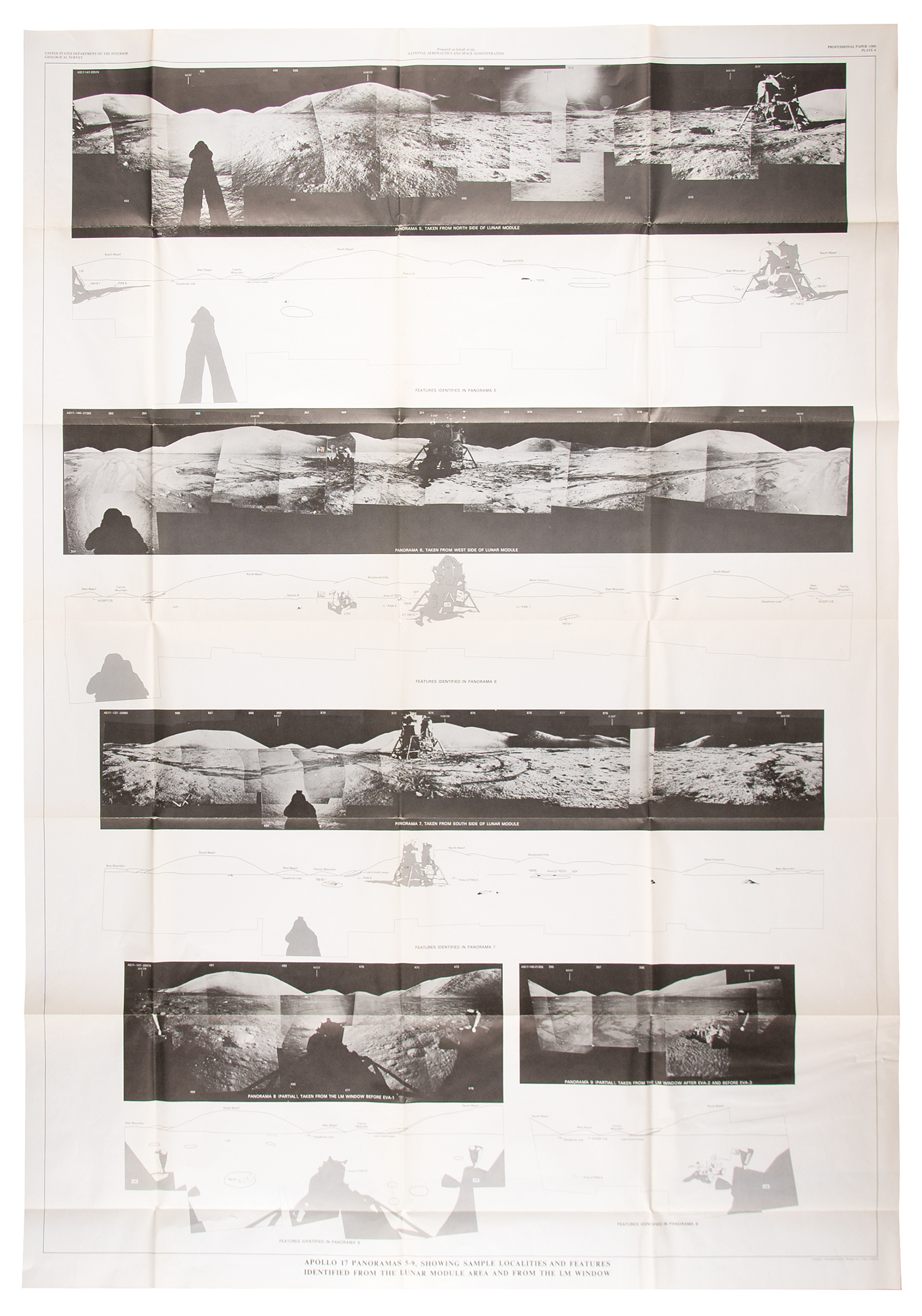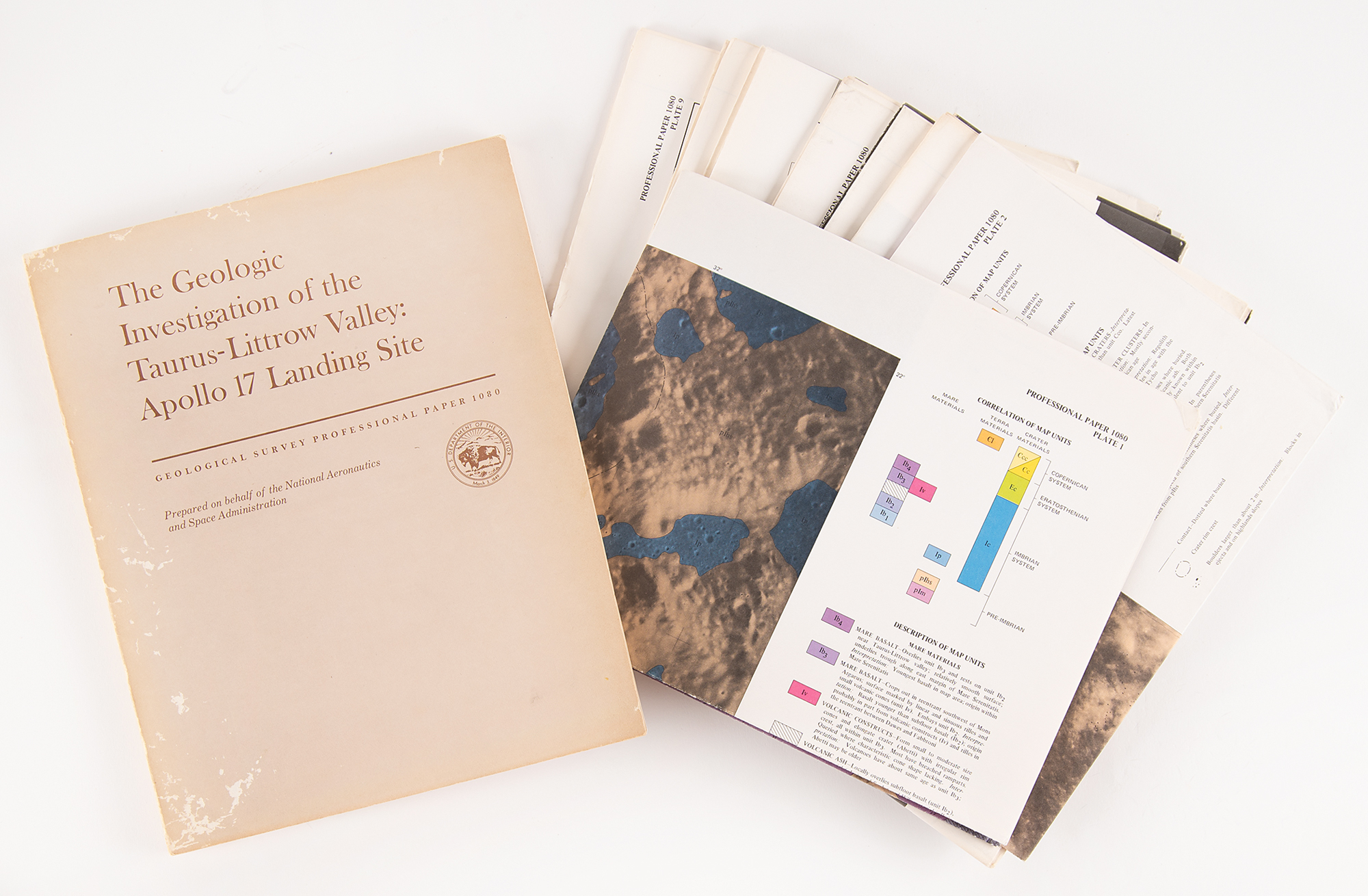 Official report entitled "The Geologic Investigation of the Taurus-Littrow Valley: Apollo 17 Landing Site (Geological Survey Professional Paper 1080)," prepared on behalf of the National Aeronautics and Space Administration, 9 x 11.25, 279 pages plus nine oversized folding plates, published by the Government Printing Office in 1981. This paper synthesizes the results of the Apollo 17 mission, which landed astronauts Gene Cernan and Harrison Schmitt in the moon's Taurus-Littrow Valley, where they collected about 120 kg of lunar rock and soil samples, took over 2,200 photographs, and made numerous direct geologic observations. A foundational reference for lunar geology, the report is organized chronologically, covering pre-mission geological interpretation, field and sample data, and post-mission geologic synthesis. In very good to fine condition, with sunning and chipping to the report cover and heavy wear and a broken/taped spine to the stiff outer cover.