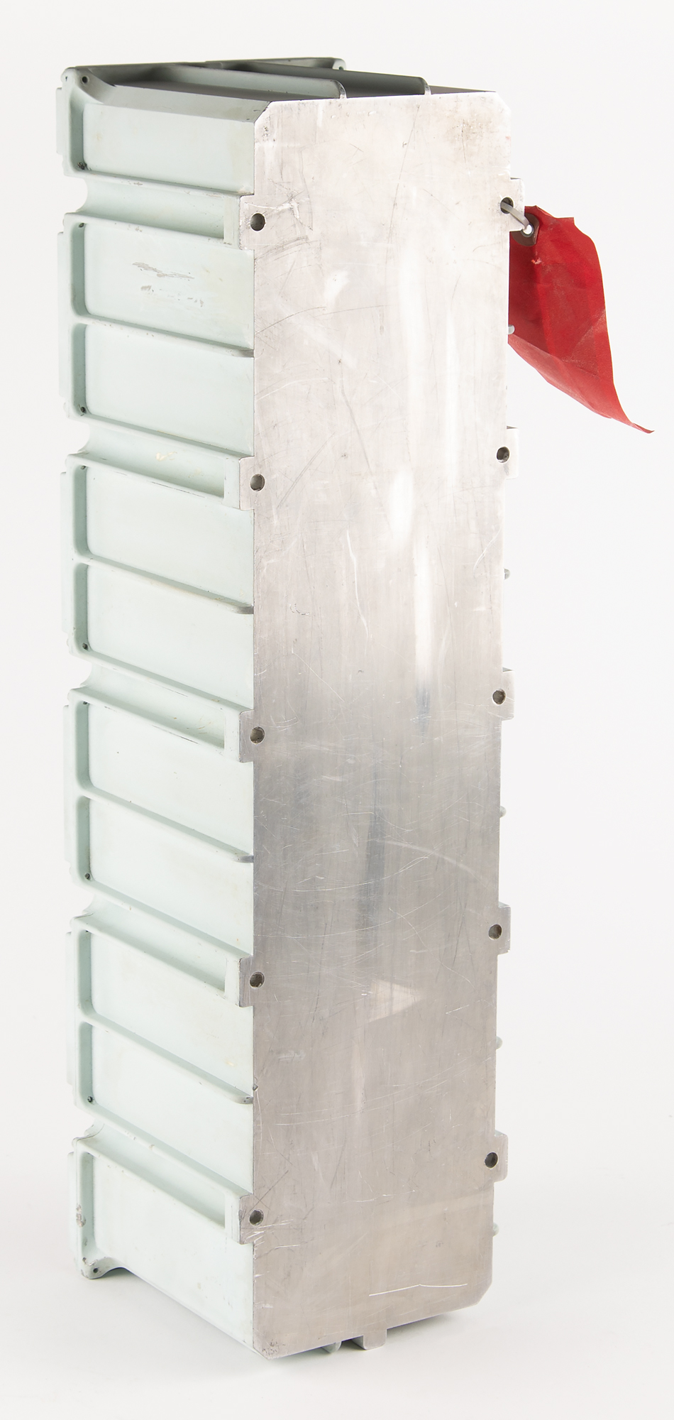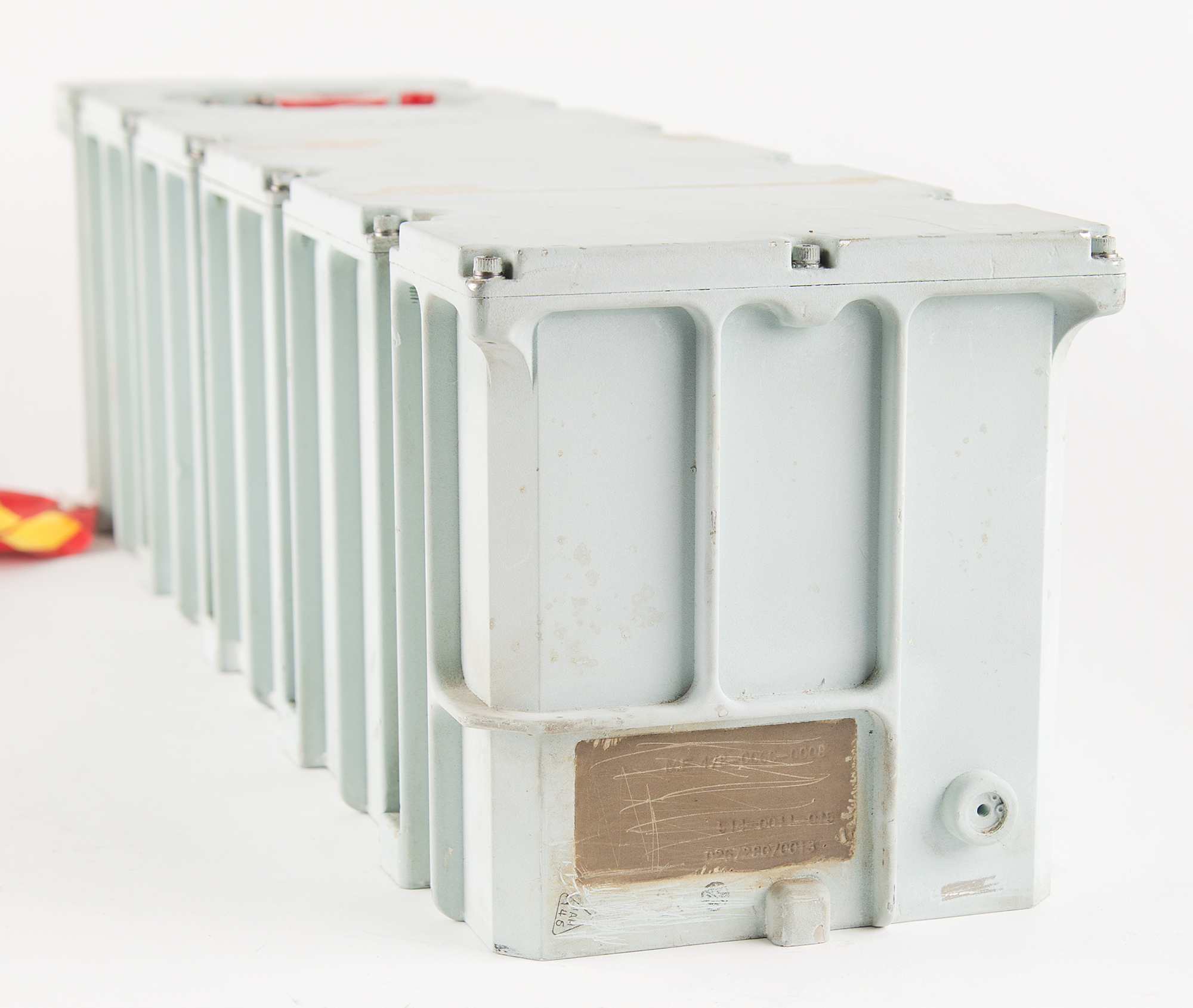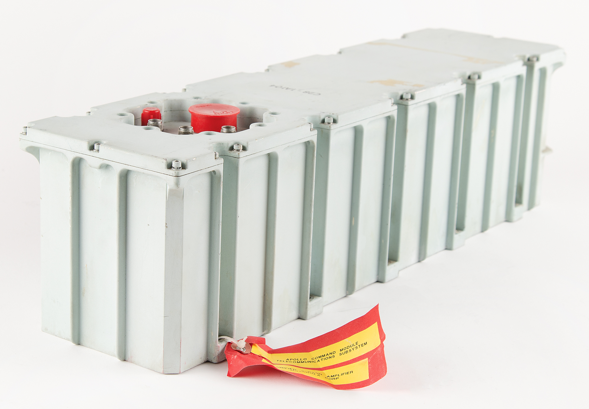 Apollo Command Module Telecommunications System Unified S-Band Amplifier, measuring approximately 22″ x 5.75″ x 6″, with the Collins Radio manufacturer's plate removed from the side. The top panel is marked "C28-1A104," and features inset ports marked "J1" through "J5." The Apollo CM's S-band power amplifier equipment was used to amplify the radio frequency output from the S-band transmitters when additional signal strength was required for adequate reception by the ground.