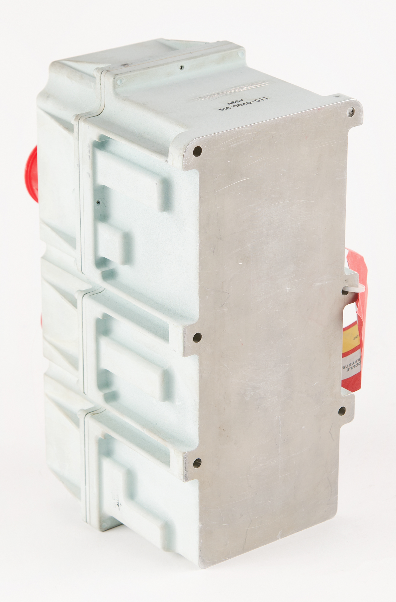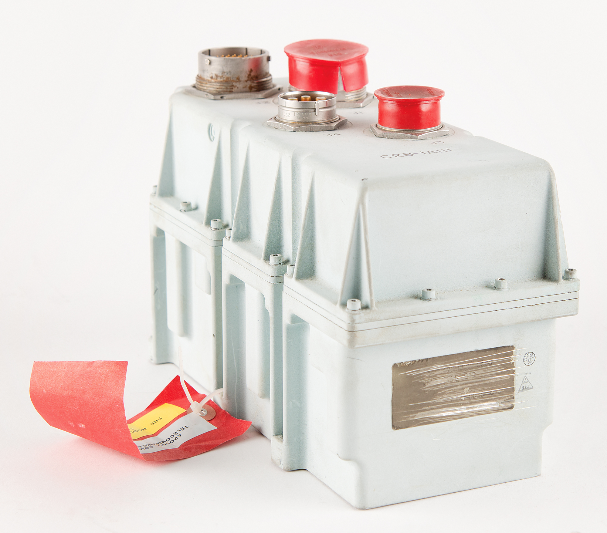 Apollo Command Module Premodulation Processor Equipment Assembly, measuring 10.5″ x 7″ x 5″, lacking its Collins Radio manufacturer's plate. The body is marked "C28-1A111" and "Assy 514-0040-011." Four ports on the top are labeled "J1" through "J4." The Apollo CM's Premodulation Processor was a piece of radio communications equipment that processed, modulated, and combined data and voice signals for transmission to Earth.