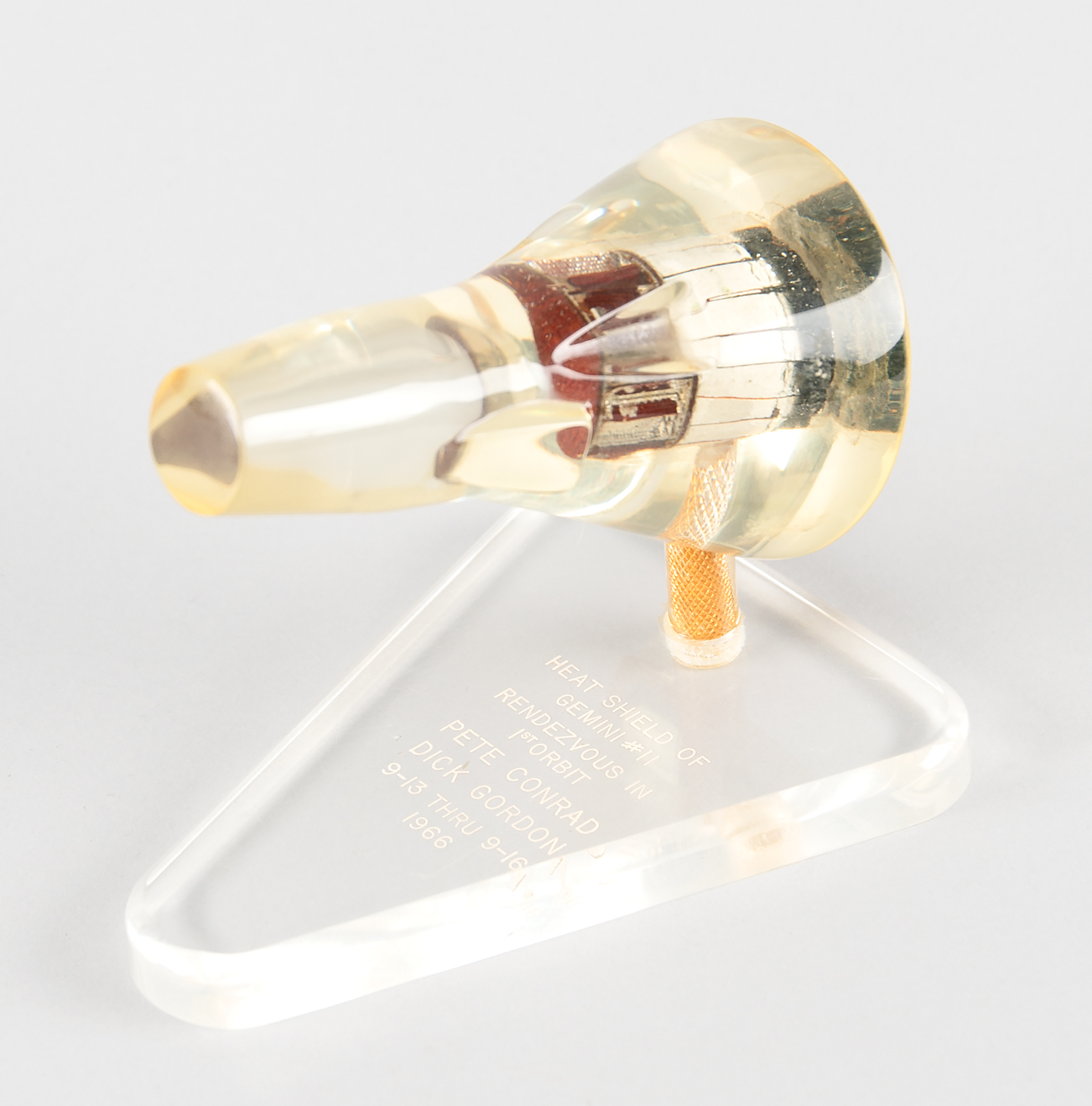 Attractive display containing a flown heat shield segment from the capsule of the Gemini 11 mission, which launched on September 12, 1966, and made history when it performed the first direct-ascent (first orbit) rendezvous with an Agena Target Vehicle. The artifact, 1.75˝ x 1.25˝ x .75˝, is encased in an acrylic display designed to resemble a Gemini capsule, 5.5˝ x 4.25˝ x 4˝, with the base engraved with text, “Heat Shield of Gemini #11, Rendezvous in 1st Orbit, Pete Conrad, Dick Gordon, 9-13 Thru 9-16, 1966.” In fine condition, with trivial scuffing.
