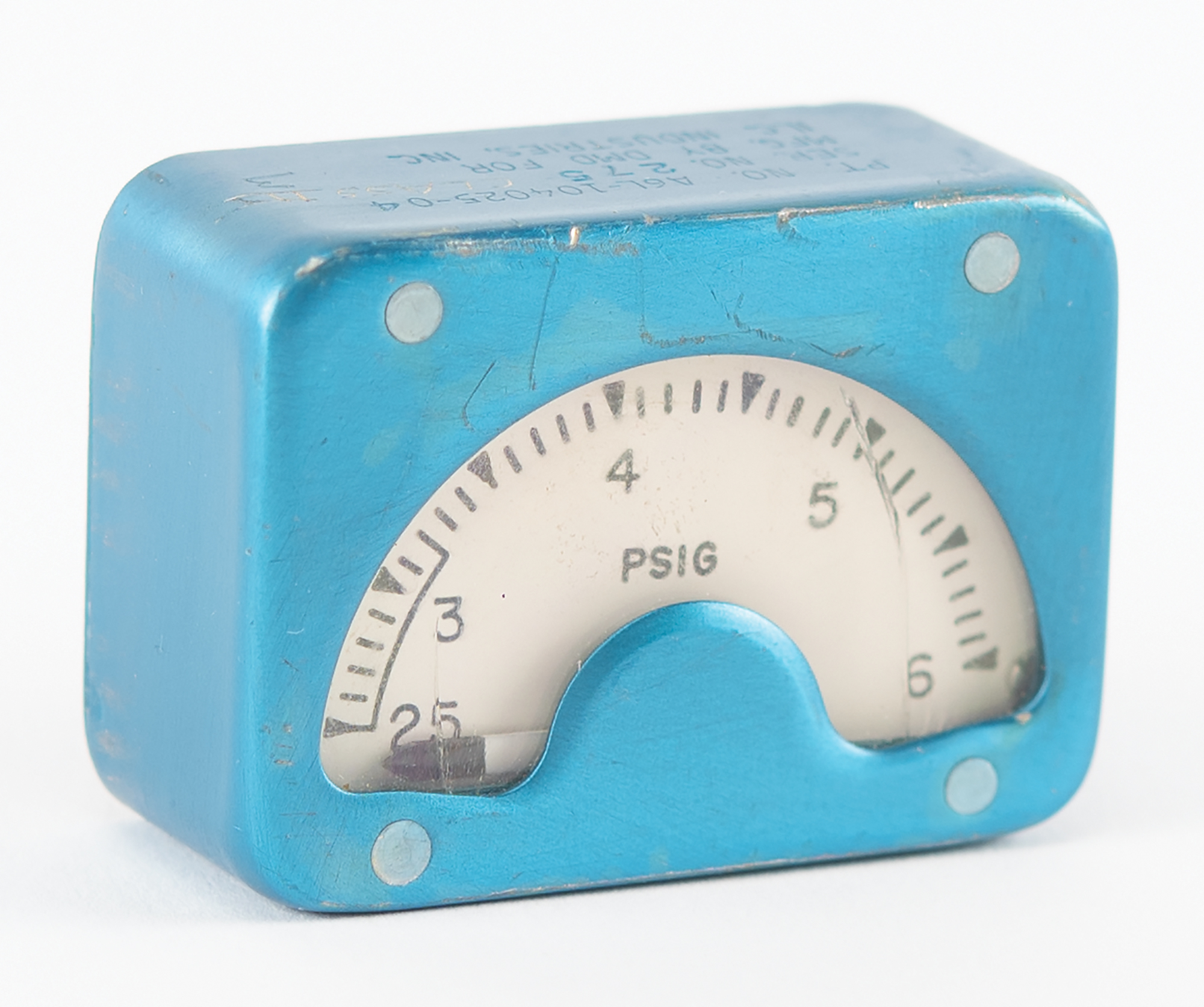 Flown Apollo A7L space suit pressure garment assembly (PGA) pressure gauge from the suit of Apollo 13 CMP Jack Swigert, measuring approximately 1.75˝ x 1.25˝ x 1˝, which was located on the lower right arm so that the astronaut could quickly verify suit pressure. The gauge's face provides a range from 2.5 to 6 PSIG. Manufactured by DMD for ILC Industries, Inc., the gauge is engraved on the top of its blue anodized housing: "Pt. No. A6L-104025-04, Ser. No. 275, Mfg. by DMD for ILC Industries, Inc.," and hand-engraved with a post-mission downgrade to "Class III / 3." These numbers match an accompanying copy of a page from an ASHUR document requesting "downgrade to Class II, the indicated Apollo 13 Pressure Garment Assemblies," affiliated with "Spacecraft Number CM 109"; the document specifically names "A6L-104025-04 S/N 275 Pressure Gage" as hardware affiliated with Swigert's suit. In very good to fine condition, with wear from use and two small cracks to the gauge's plastic window. The gauge is clearly seen on Swigert's arm in NASA photo S70-34850, showing Swigert during suit-up on April 11, 1970. Notably, this is the first documented flown PGA component we have offered.