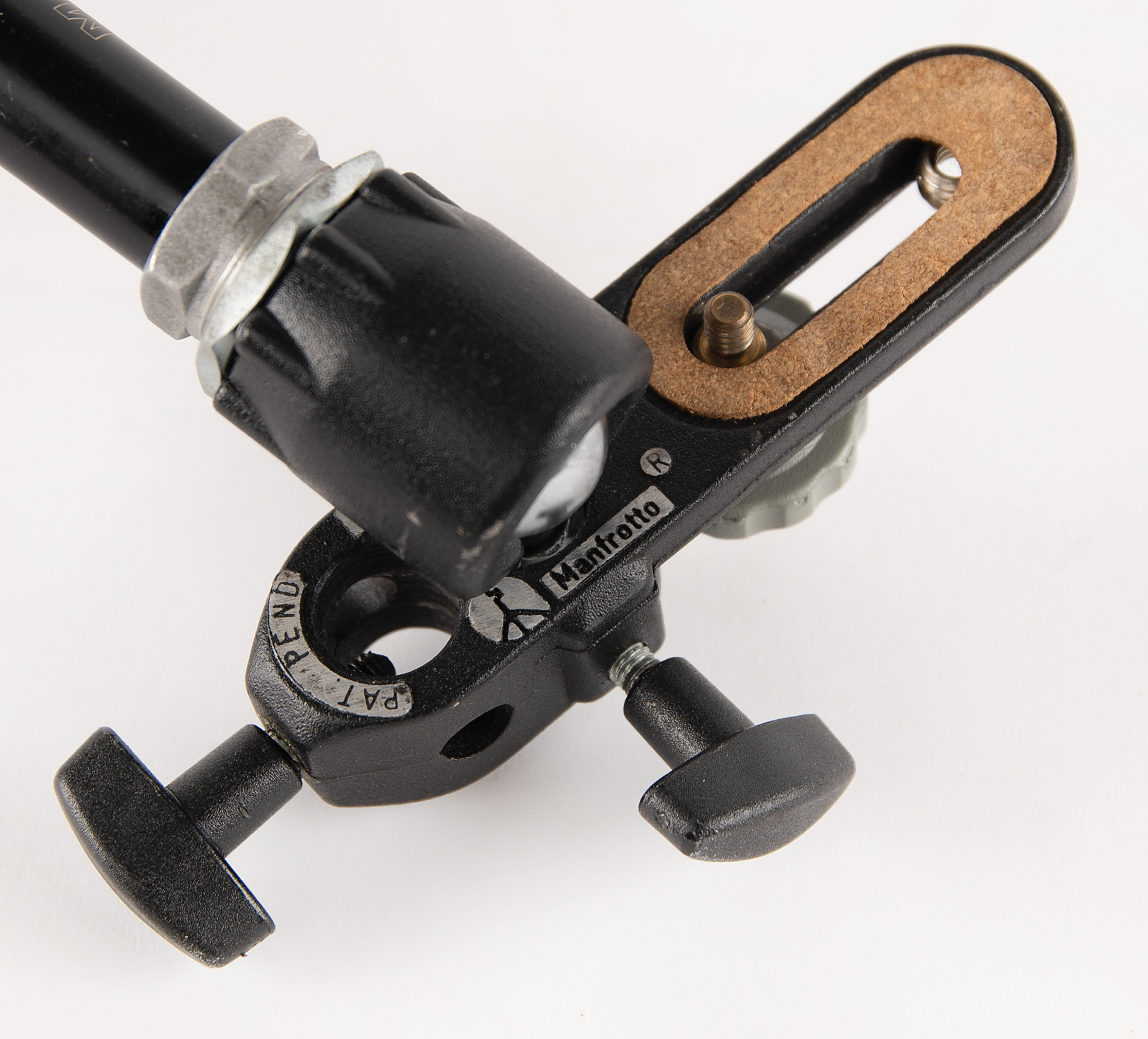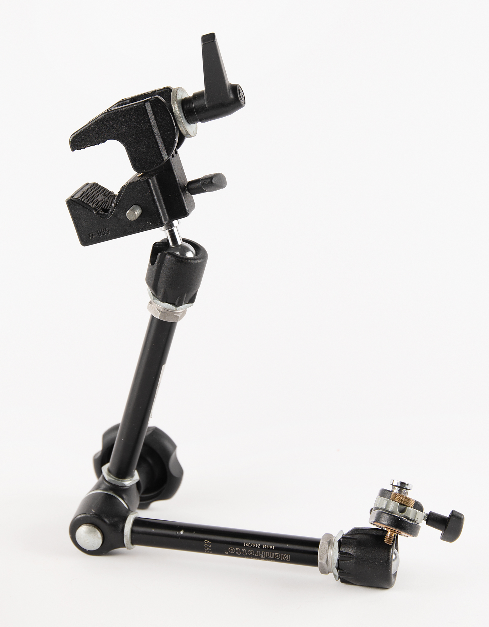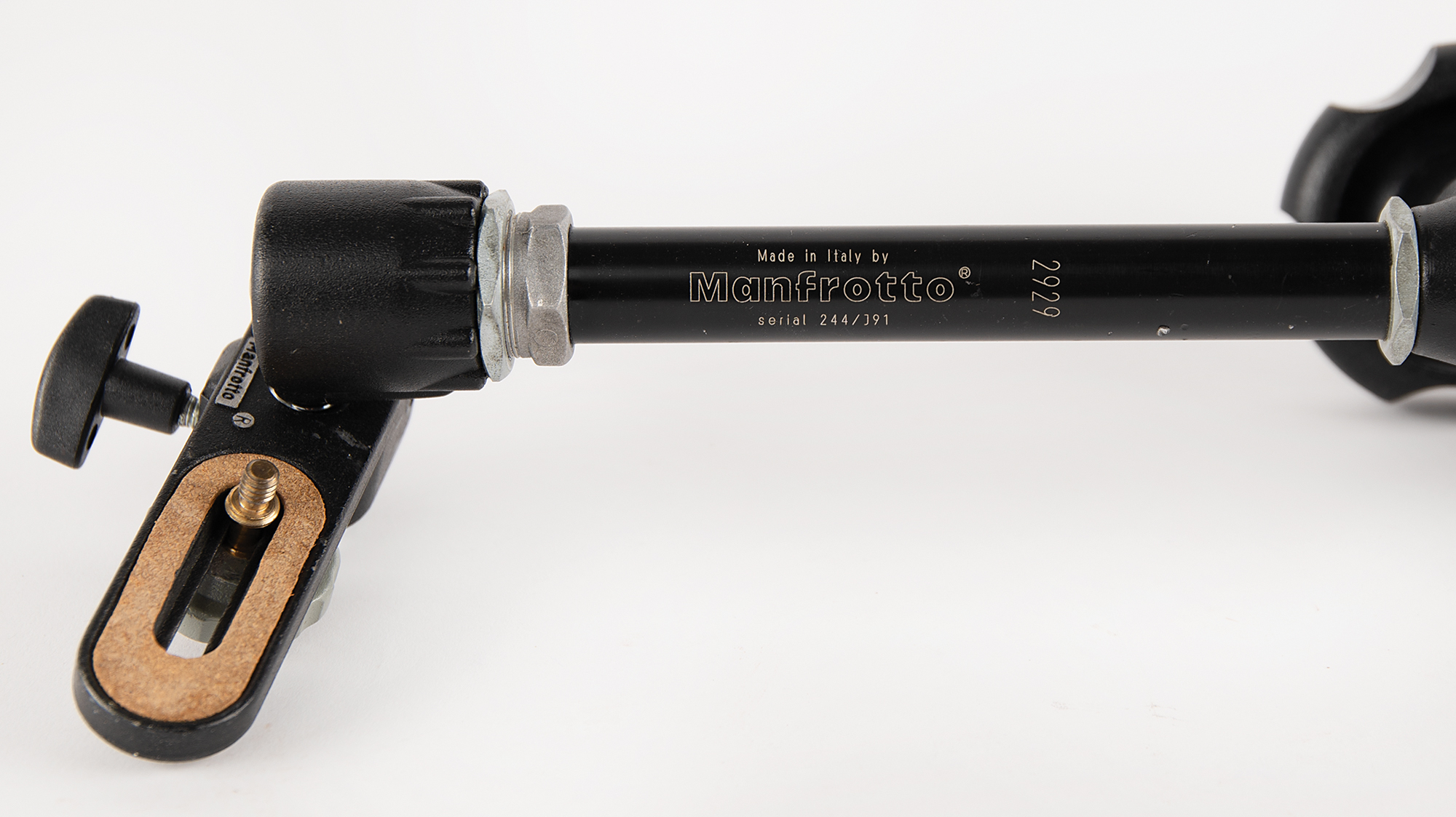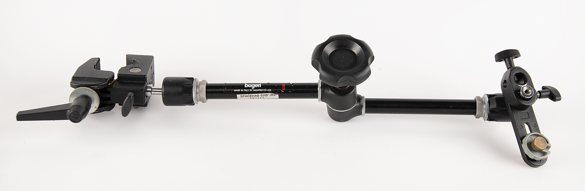 Bogen articulating support arm made by Manfrotto, Co., for use in the Spacehab service module, extended to approximately 24˝ in length, with a large central locking knob and either end terminating with a mounting bracket and an adjustable grip holder. Silver parts label to the body reads: “Spacehab-SHB1002, 501255.” In fine condition, with trivial wear. Used for science experiments, logistics, and astronaut support, Spacehab was a pressurized laboratory module flown in the Space Shuttle’s payload bay during the 1990s–2000s. NASA and its contractors often repurposed commercial gear that was rugged and flexible and modified it for flight use. In this instance, a Bogen arm would have been ideal to mount, stabilize, or position equipment (cameras, laptops, scientific payloads, checklists, etc.) in zero-G.