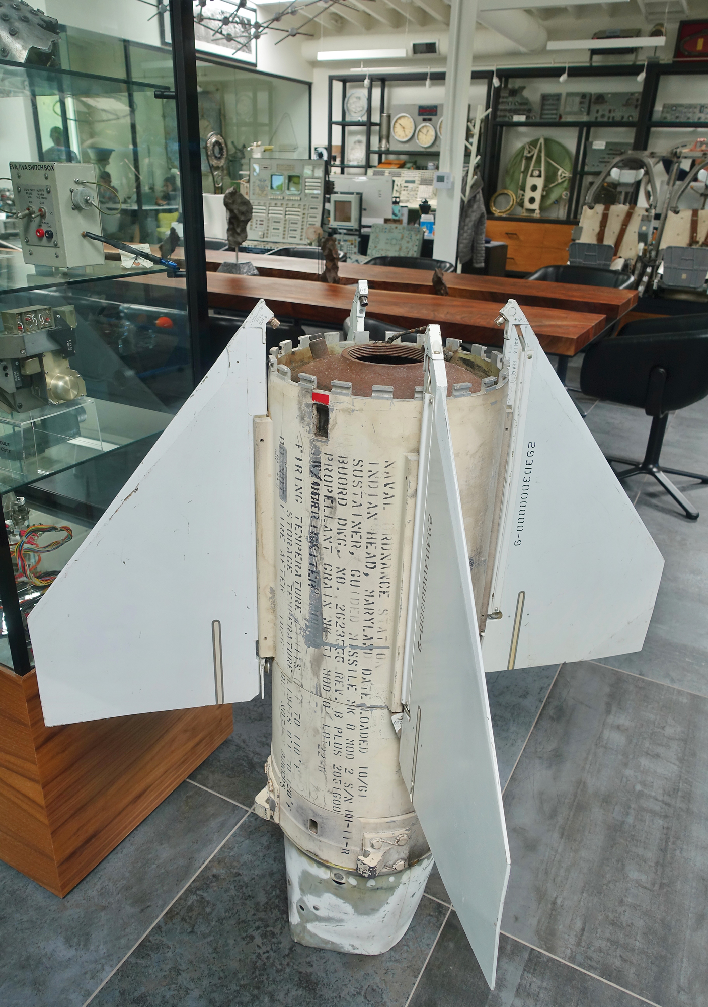 Export restricted (ITAR), sale only to US Citizens and Organizations. Bullpup missile fin can and tail, marked on the side: "Naval Ordnance Station, Indian Head, Maryland, Date Loaded 10/61, Sustainer, Guided Missile MK 8 Mod 2 S/N HH-11-R, Buord Dwg. No. 63555 Rev. B Plus 051600."