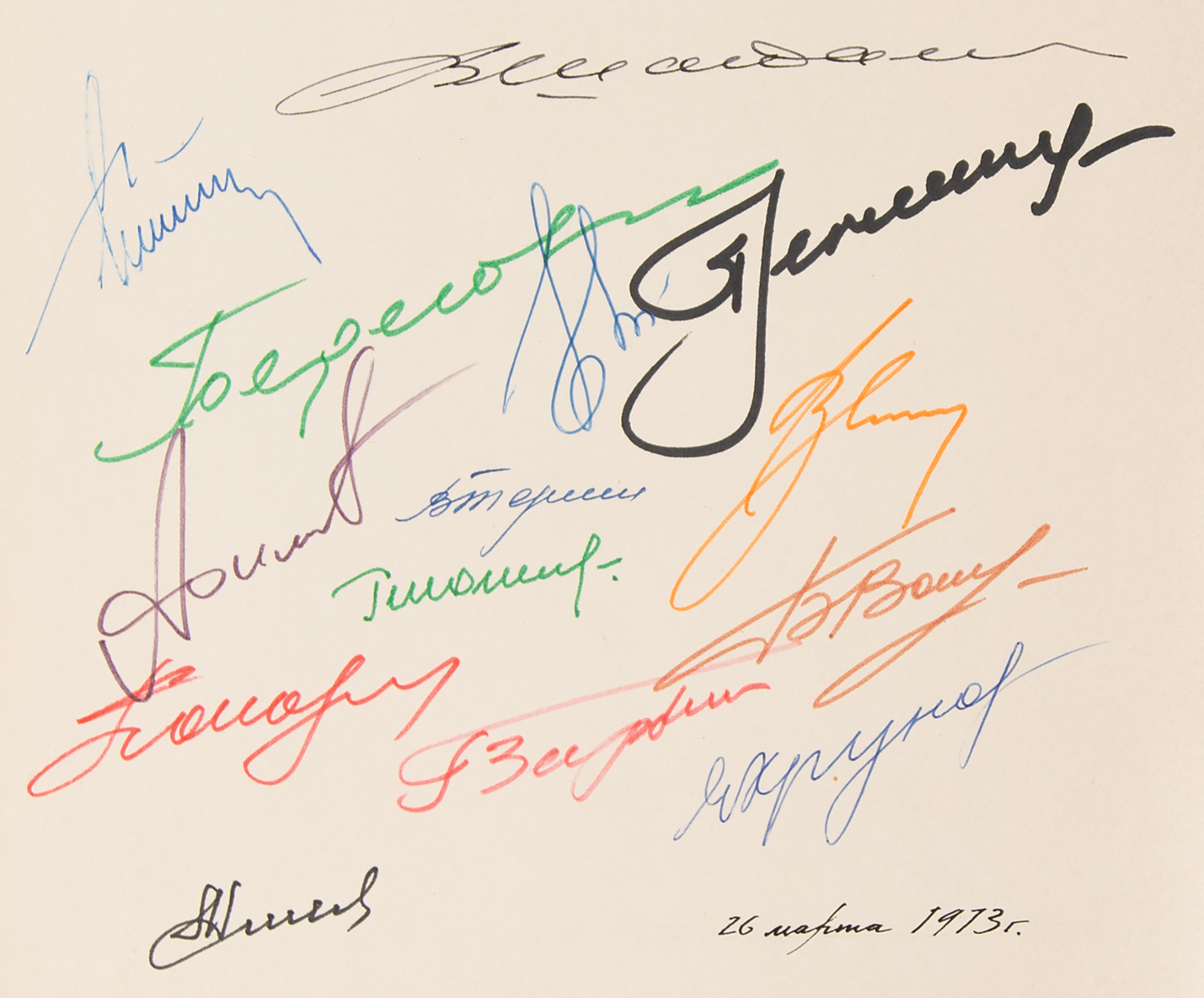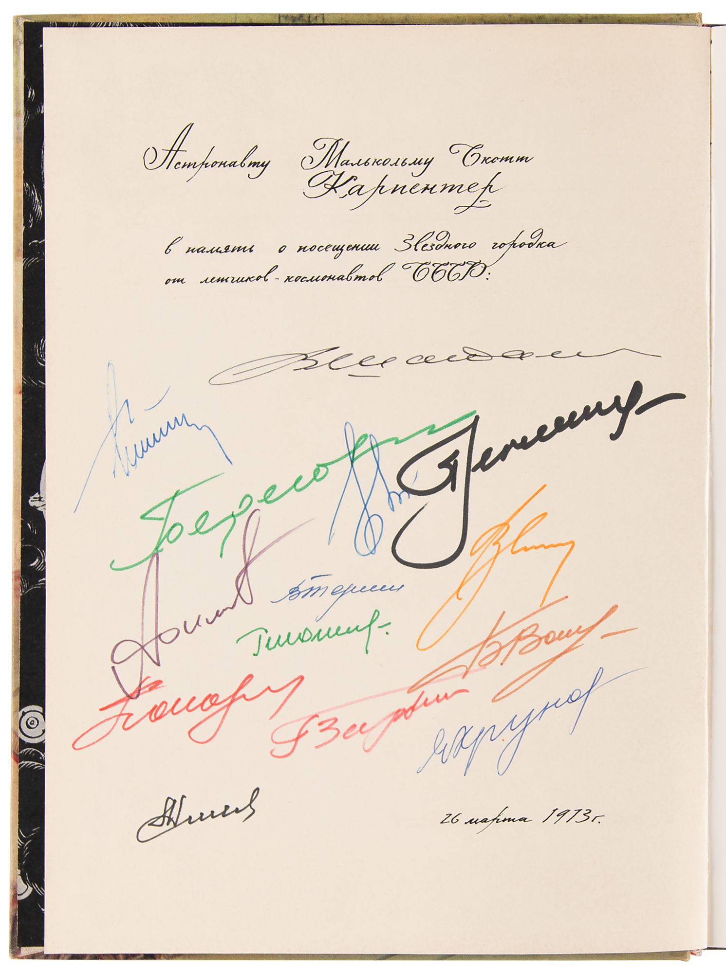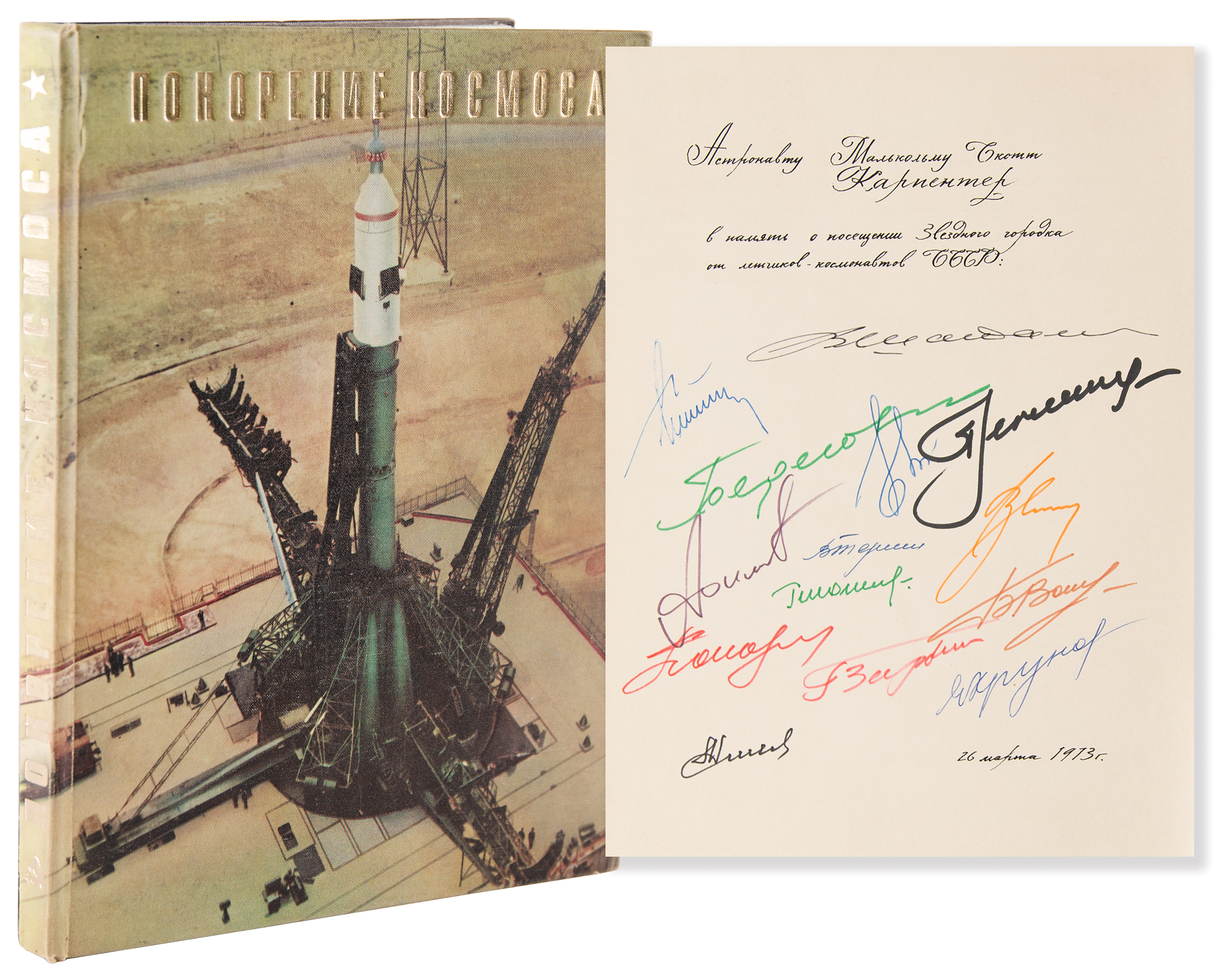 From the personal collection of Scott Carpenter — Multi-signed Russian-language book: Conquering Space. Second edition. Moscow: Mashinostroyenie, 1972. Pictorial hardcover, 8.75 x 11.75, 179 pages. Signed on an opening page in multi-colored felt tip by a total of 14 legendary cosmonauts, including: Alexei Leonov, Valentina Tereshkova, Andriyan Nikolayev, Pavel Popovich, Valery Bykovsky, Gherman Titov, Georgy Beregovoy, Anatoly Filipchenko, Vitaly Sevastyanov, Boris Volynov, Yevgeny Khrunov, Vladimir Shatalov, Viktor Gorbatko, and Georgy Shonin. The upper portion bears a handwritten inscription in Cyrillic to Mercury Astronaut Scott Carpenter. In fine condition.
