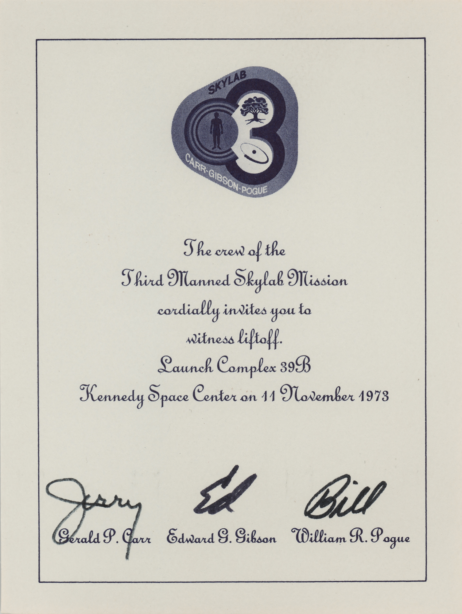 Three items signed by one or more members of the Skylab 4 mission: an ECS MON ‘que card’ used in training for the Skylab 4 mission, 6.25 x 5.5, dated March 26, 1973, signed in blue ink, “Ed Gibson, Skylab III”; a printed invitation card for the launch of the Skylab 4 mission, 4.5 x 6, signed in black felt by the full crew of Jerry Carr, Ed Gibson, and Bill Pogue, with each signing first name only; and a color glossy 5.5 x 8.5 biography photo of Gibson in his white space suit, signed in black felt tip by Gibson. In overall fine condition.