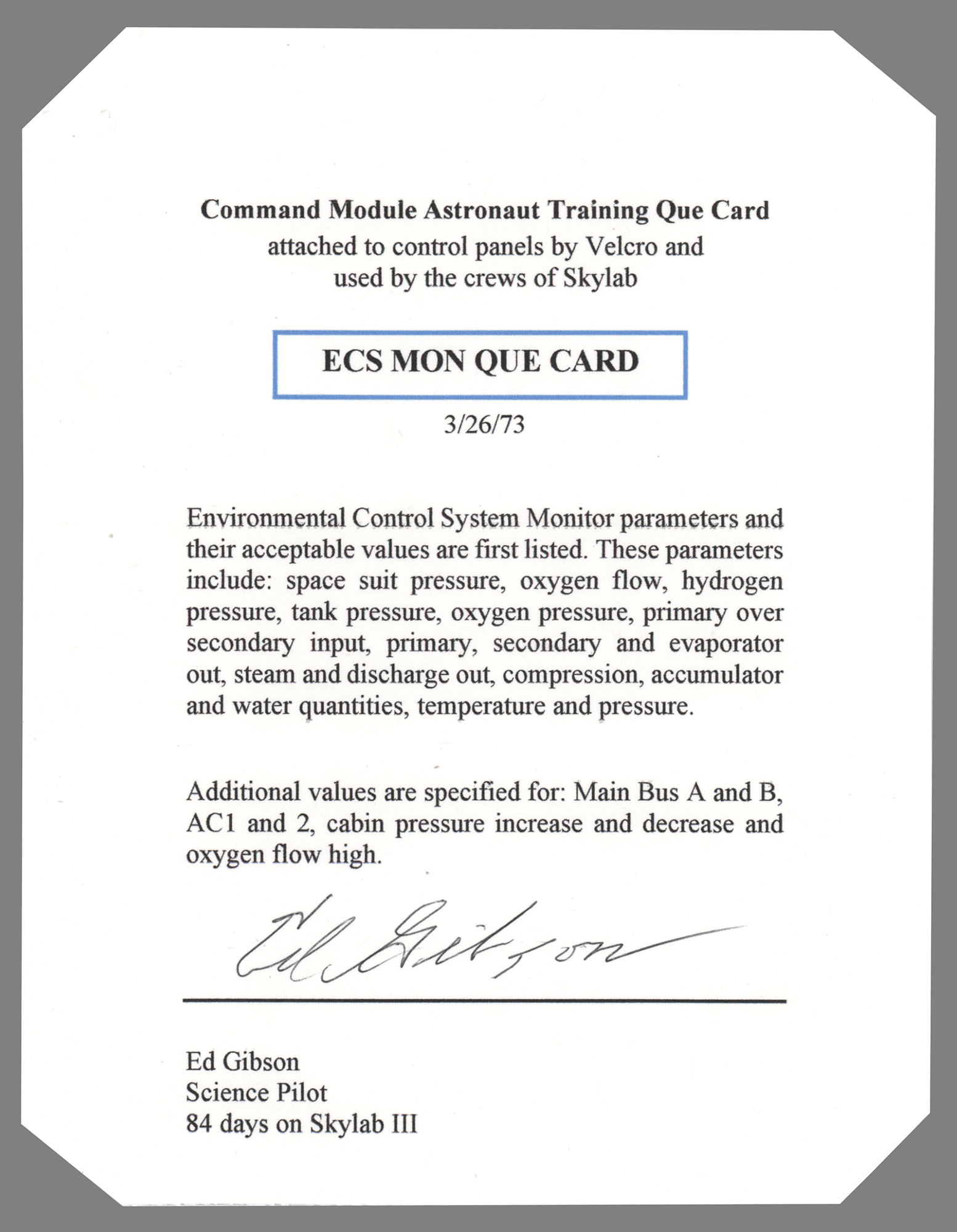 Accompanied by a signed certificate of authenticity from Gibson for the ECS MON Que Card, which reads: “Environmental Control System Monitor parameters and their acceptable values are first listed. These parameters include: space suit pressure, oxygen flow, hydrogen pressure, tank pressure, oxygen pressure, primary over secondary input, primary, secondary and evaporator out, steam and discharge out, compression, accumulator and water quantities, temperature and pressure. Additional values are specified for: Main Bus A and B, AC1 and 2, cabin pressure increase and decrease and oxygen flow high.”