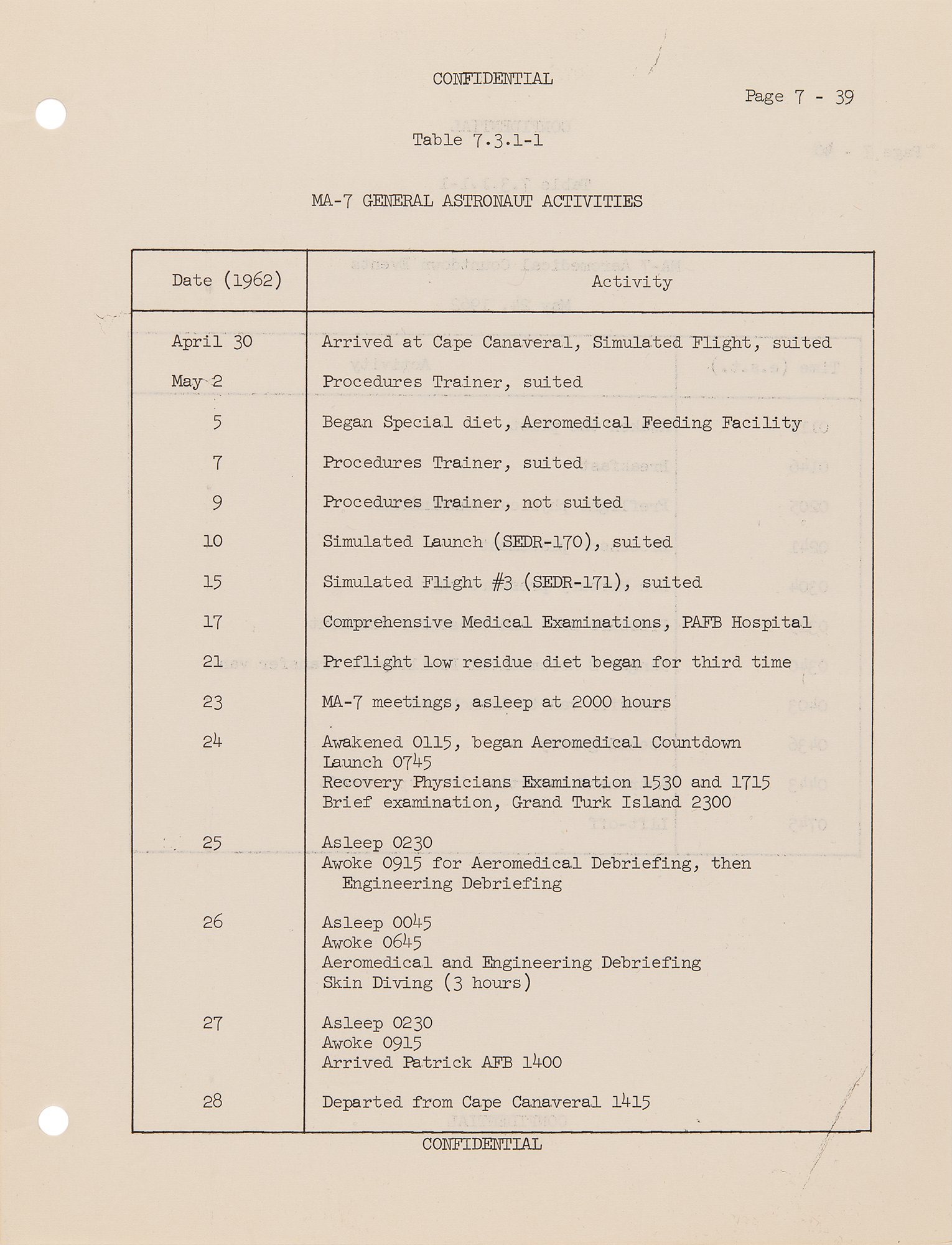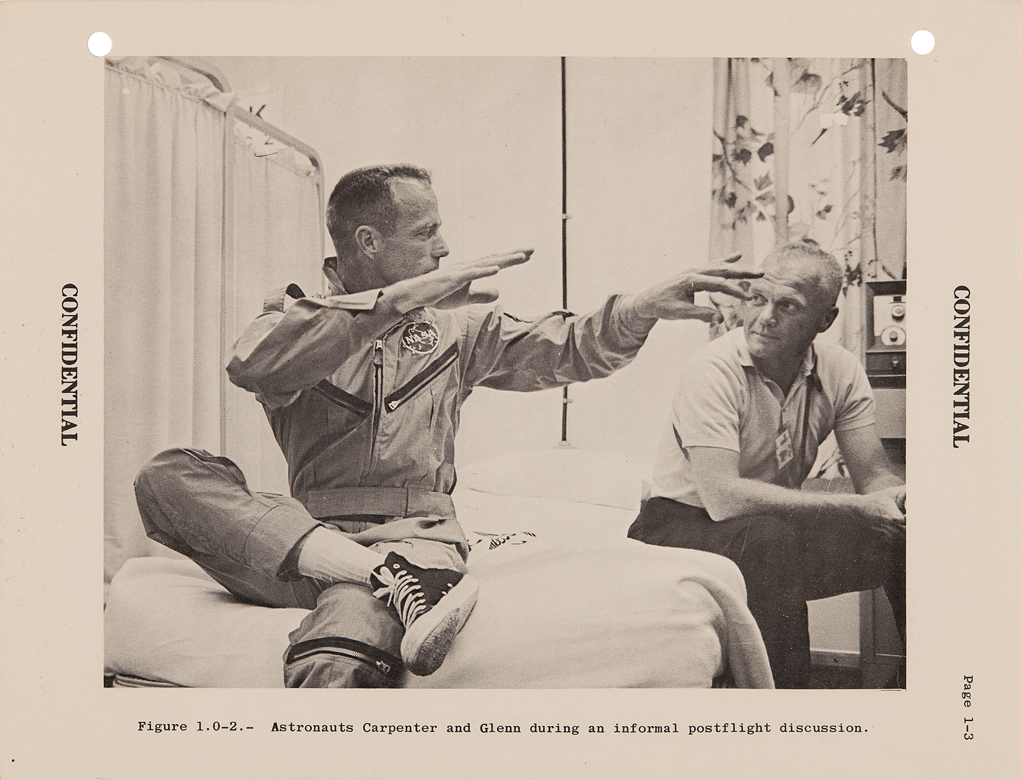 A fascinating in-house NASA document deriving from the personal collection of Aurora 7 pilot Scott Carpenter, whose historic space flight into low Earth orbit was not without its share of controversy. A series of missteps, compounded by a malfunctioning pitch horizon scanner, forced Carpenter to control his reentry manually. As a consequence, the Aurora 7 missed its landing area broadly, and Carpenter, no worse for wear, was left to float alone in his life raft for nearly an hour before recovery vehicles arrived on the scene.