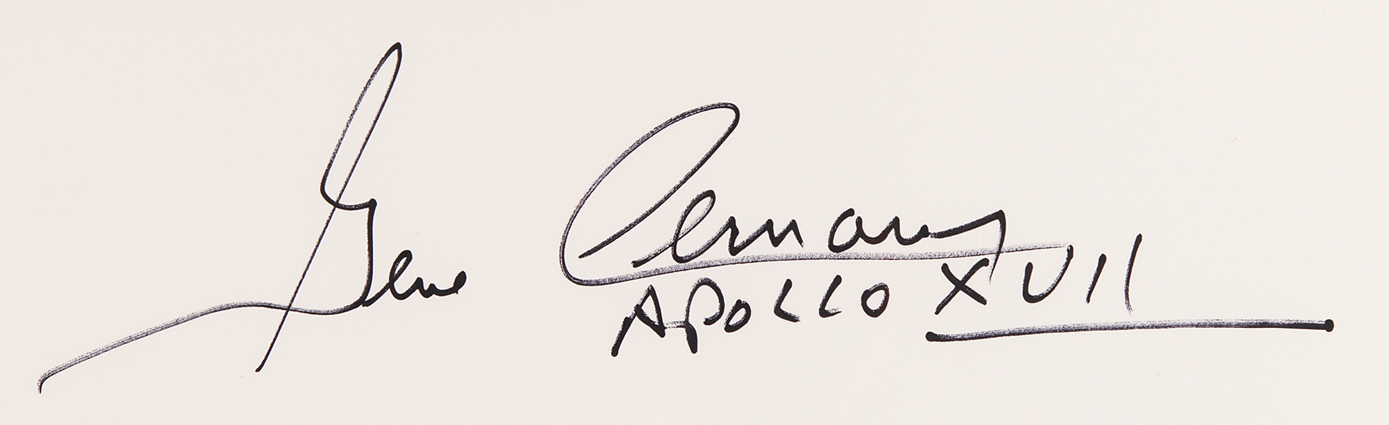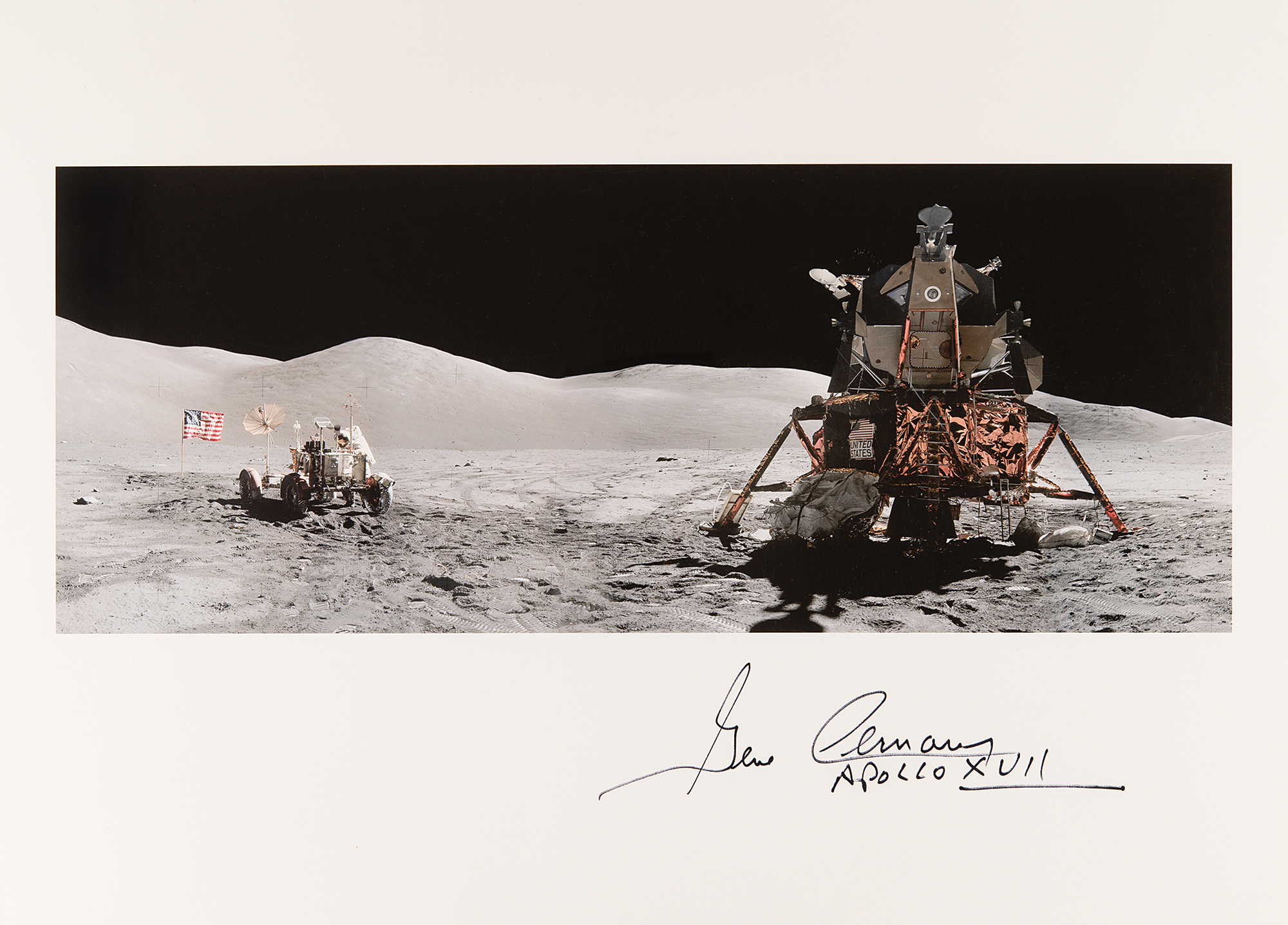 Color 22 x 16 photographic print of Taurus-Littrow, the landing site of the Apollo 17 mission, which depicts the Lunar Module Challenger, the American flag, and an astronaut working on the lunar rover, signed in the lower border in black felt tip, “Gene Cernan, Apollo XVII.” Rolled and in fine condition.