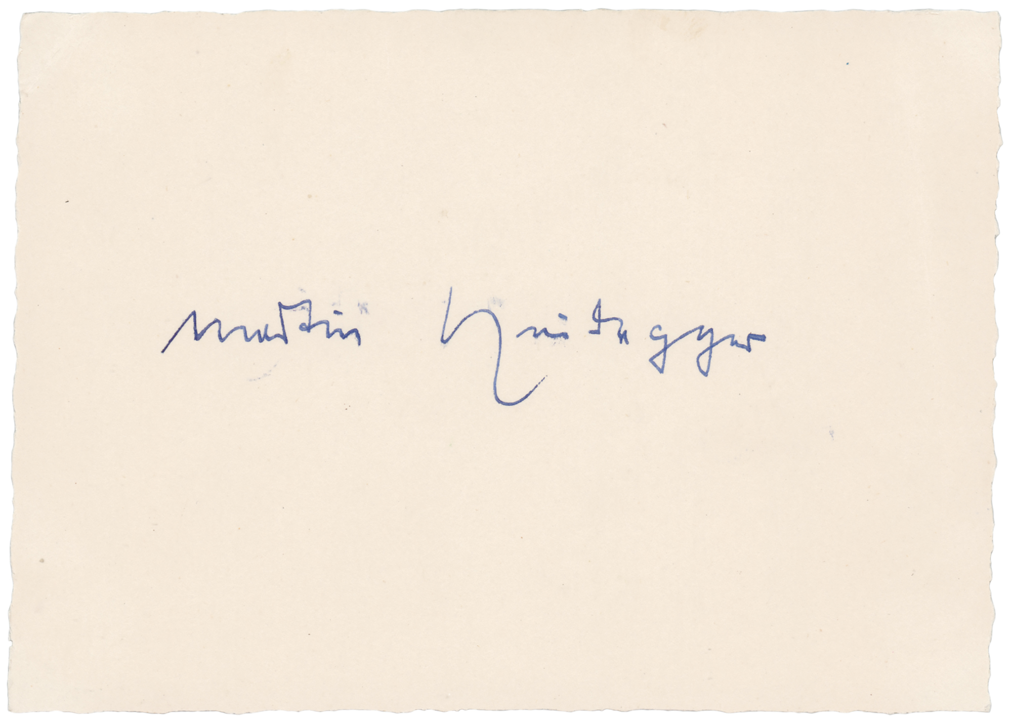 German philosopher (1889-1976) known for his contributions to phenomenology, hermeneutics, and existentialism. Vintage fountain pen signature, "Martin Heidegger,” on an off-white 5.75 x 4 card. In very fine condition.
