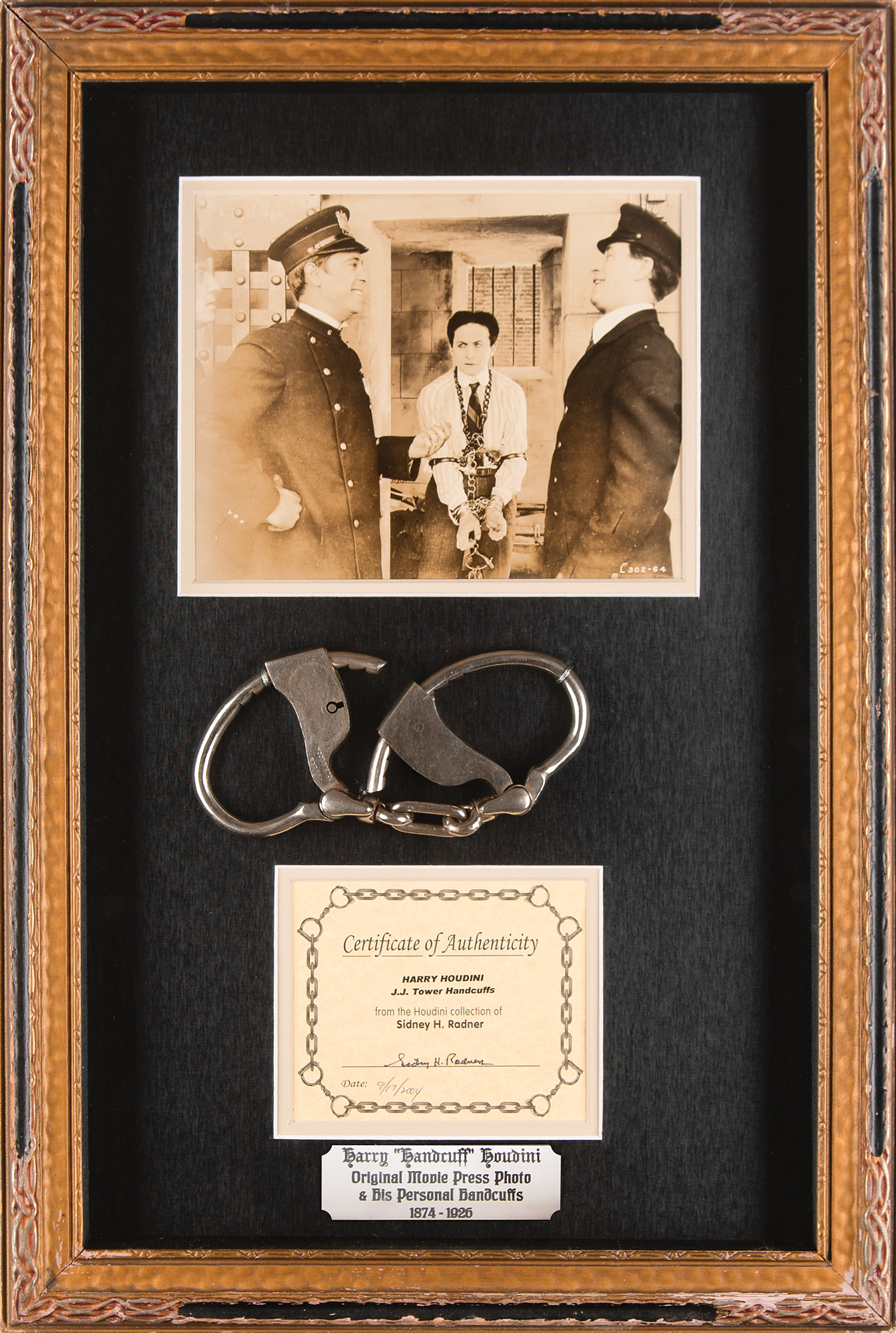 Pair of Harry Houdini's personally-owned J. J. Tower ‘double lock’ steel handcuffs, with each locking shackle ring measuring about 4˝ across, which are attached by a single 1.5˝ link. Mounted with an engraved plaque, an original glossy publicity photo, and a signed certificate of authenticity from noted Houdini collector Sidney Radner, dated September 17, 2004, all of which are framed together to an overall size of 16.5 x 24.5. The irons exhibit trivial wear to plating, and the included key is rusted.