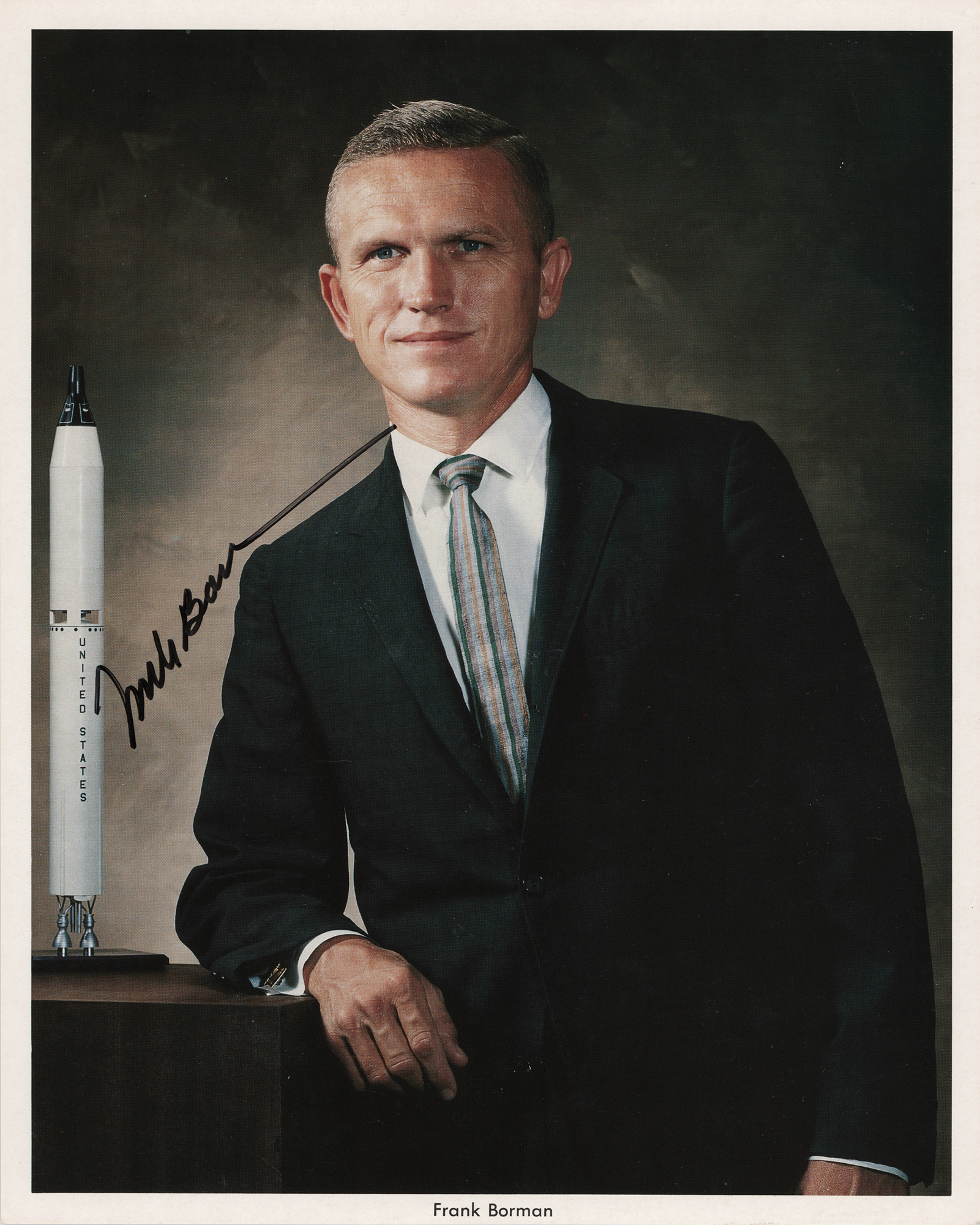 Official color 8 x 10 NASA lithograph of Frank Borman posing beside a Gemini-Titan II model rocket, signed in black felt tip. In fine condition, with a couple of small surface creases.