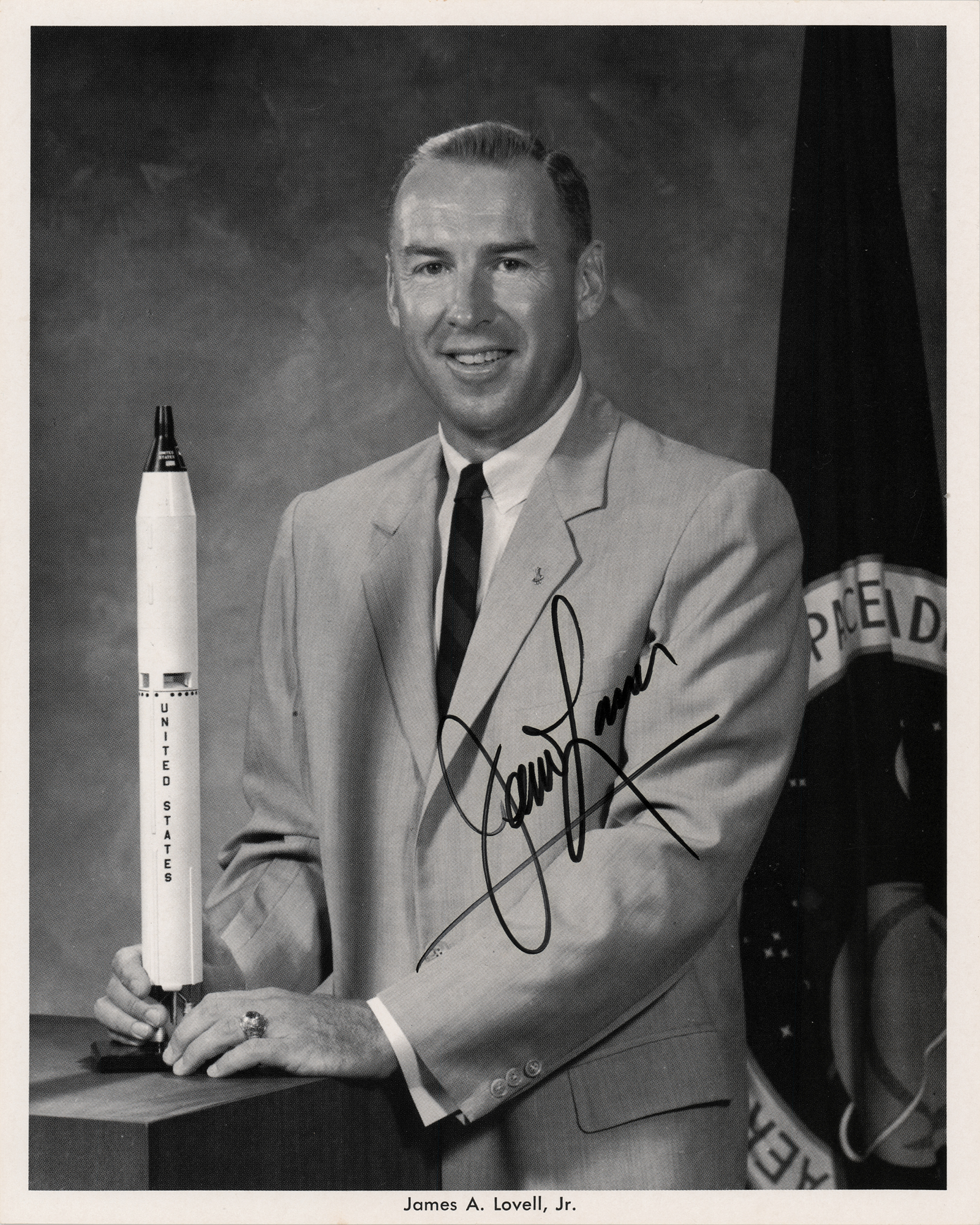 Official 8 x 10 NASA lithograph of James Lovell posing with a Gemini-Titan II rocket model, signed in black felt tip. In fine condition, with two small surface creases near the top edge.