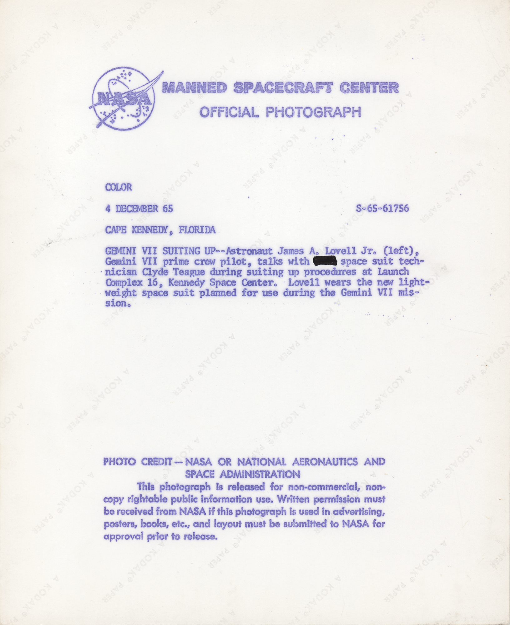 Official color glossy 10 x 8 blue-numbered NASA photo (S-65-61756) of James Lovell suiting up in the new lightweight space suit for the Gemini VII mission, signed in black felt tip. Reverse bears purple NASA text and “A Kodak Paper” watermarks. In fine condition.