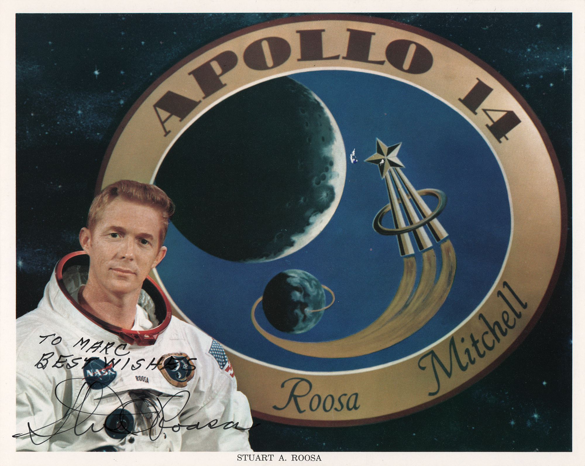 Official color 8 x 10 NASA lithograph of Roosa posed in his white space suit with the Apollo XIV crew insignia, signed and inscribed in black felt tip, "To Marc, Best Wishes, Stuart Roosa." In very good condition, with a small surface tear touching the star in the background.