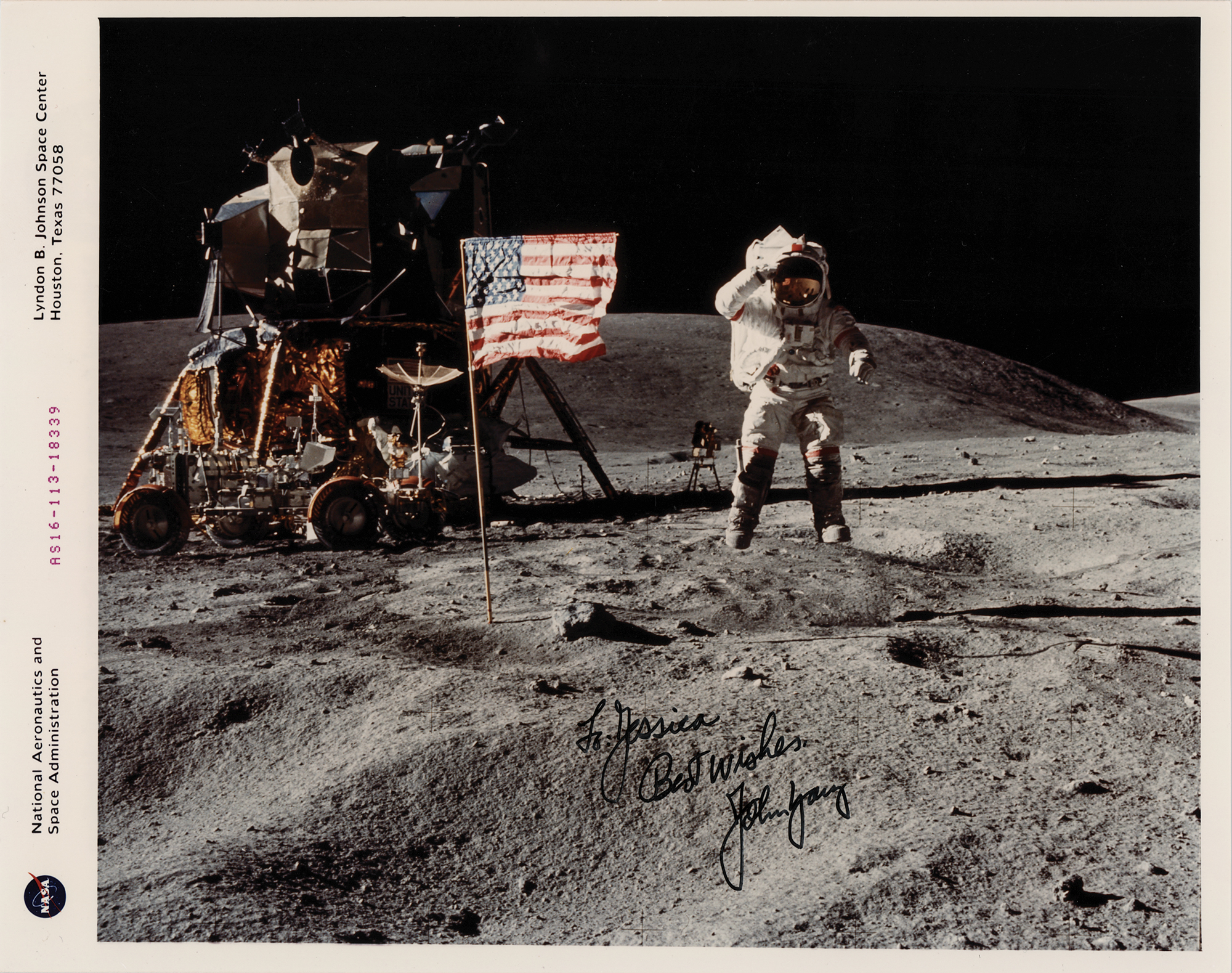 Official color glossy 10 x 8 red-numbered NASA photo (AS16-113-18339) of moonwalker John Young saluting the American flag and leaping from the lunar surface during the Apollo 16 mission, signed and inscribed in black felt tip, "To: Jessica, Best wishes, John Young." Reverse bears black NASA caption text and "Kodak Professional" watermarks. In very fine condition.