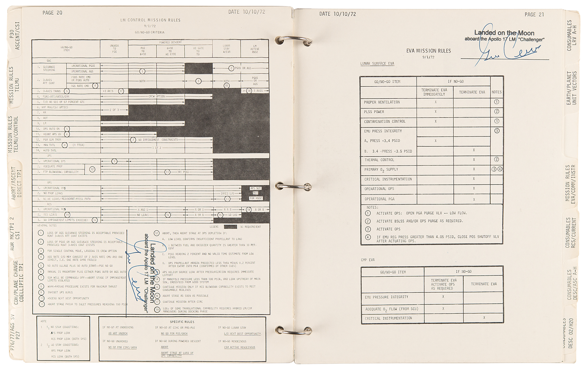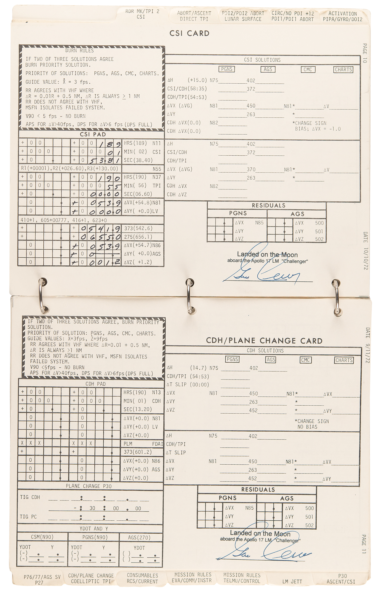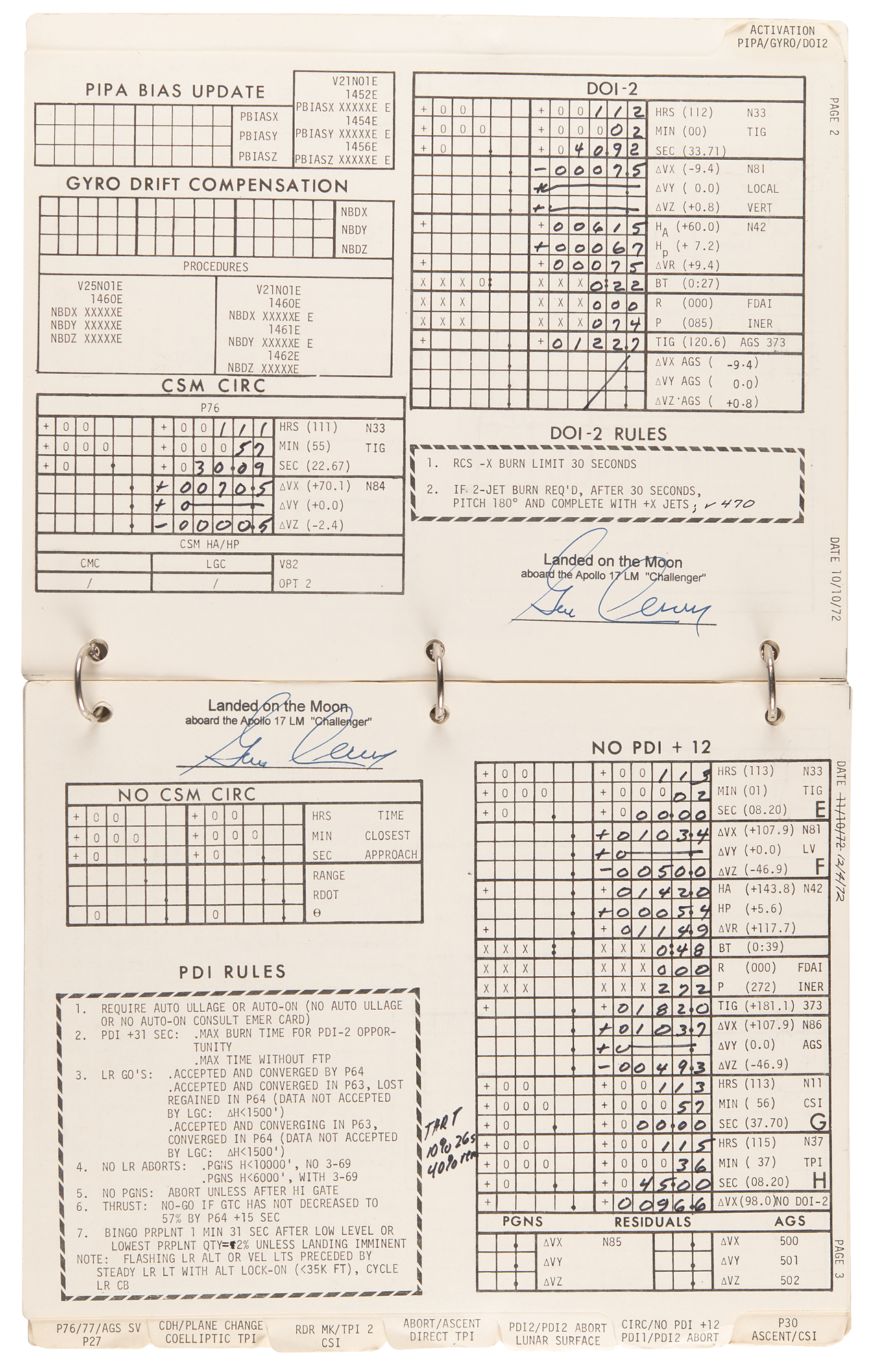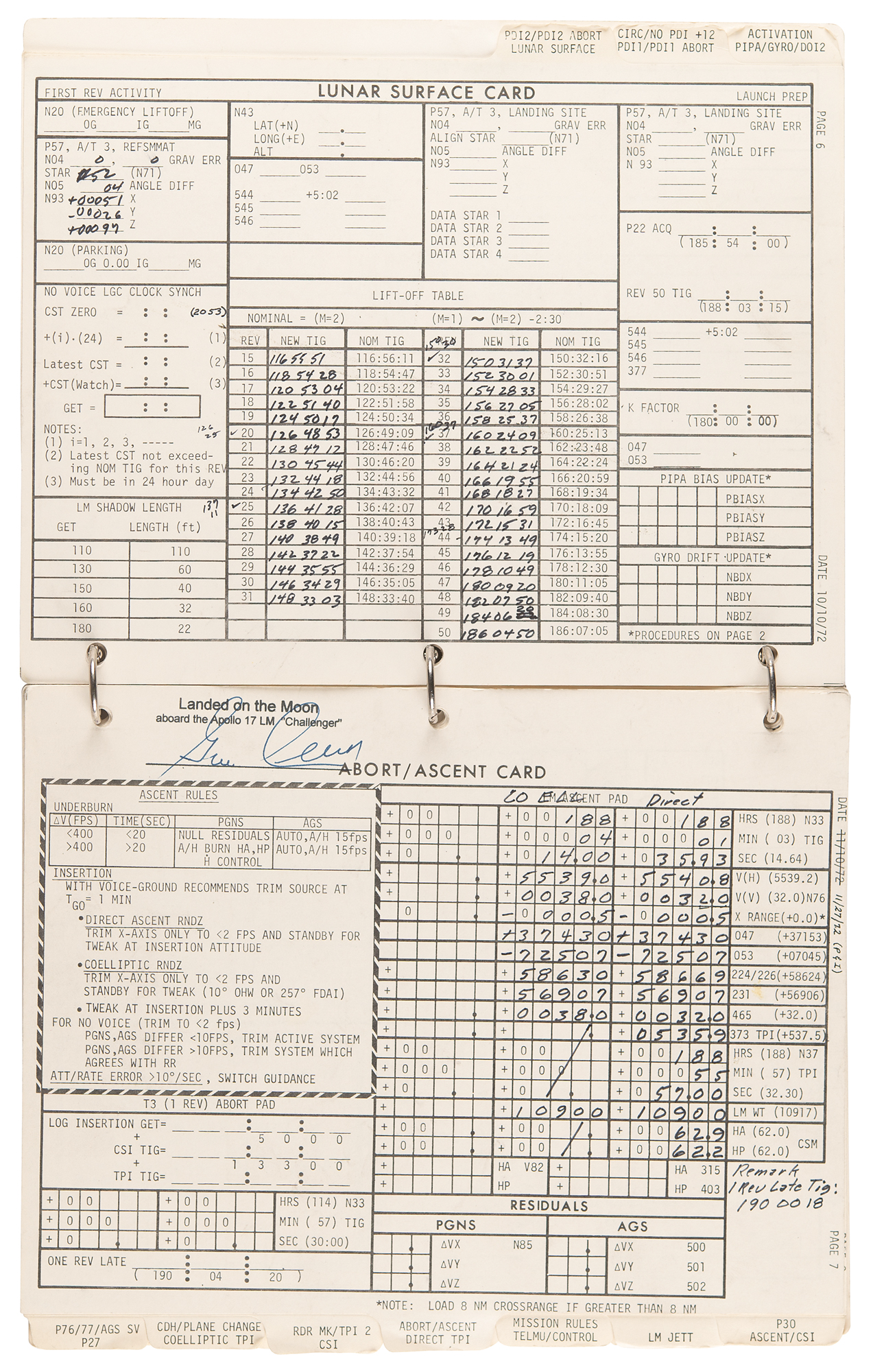 Gene Cernan’s flown ring-bound ‘LM Data Card Book’ that was carried to the lunar surface aboard the Lunar Module Challenger during the historic Apollo 17 mission, entitled “Apollo 17 / LM Data Card Book / Part No. SKB32100123-387, S/N 1001,” signed and flight-certified in blue felt tip on the front cover, “Flown to lunar surface, Apollo 17, Gene Cernan,” which also bears a provenance stamp from "The Eugene A. Cernan Space Collection.” The ‘LM Data Card Book,’ 8.5 x 10.5, contains a total of 20 independent leaves (including the front and back cardstock covers), each of which is signed neatly in felt tip by Cernan below his flight certification stamp: “Landed on the Moon, aboard the Apollo 17 LM ‘Challenger.’” Also of considerable interest are the opening 10 pages of the booklet, which contain ample felt tip numerical notations made by Cernan while at the Taurus–Littrow landing site. These relate to the following sections: ‘LM Activation Card,’ ‘CSM CIRC,’ ‘DOI-2,’ ‘PDI Rules,’ ‘NO PDI +12,’ ‘PDI 1 Abort Card,’ ‘PDI 2 Abort Card,’ ‘Lunar Surface Card,’ ‘Abort/Ascent Card,’ ‘Direct TPI Card,’ ‘AGS Recovery from Bad Radar Marks,’ and ‘CSI Card.’ In fine condition, with expected signs of age and use.