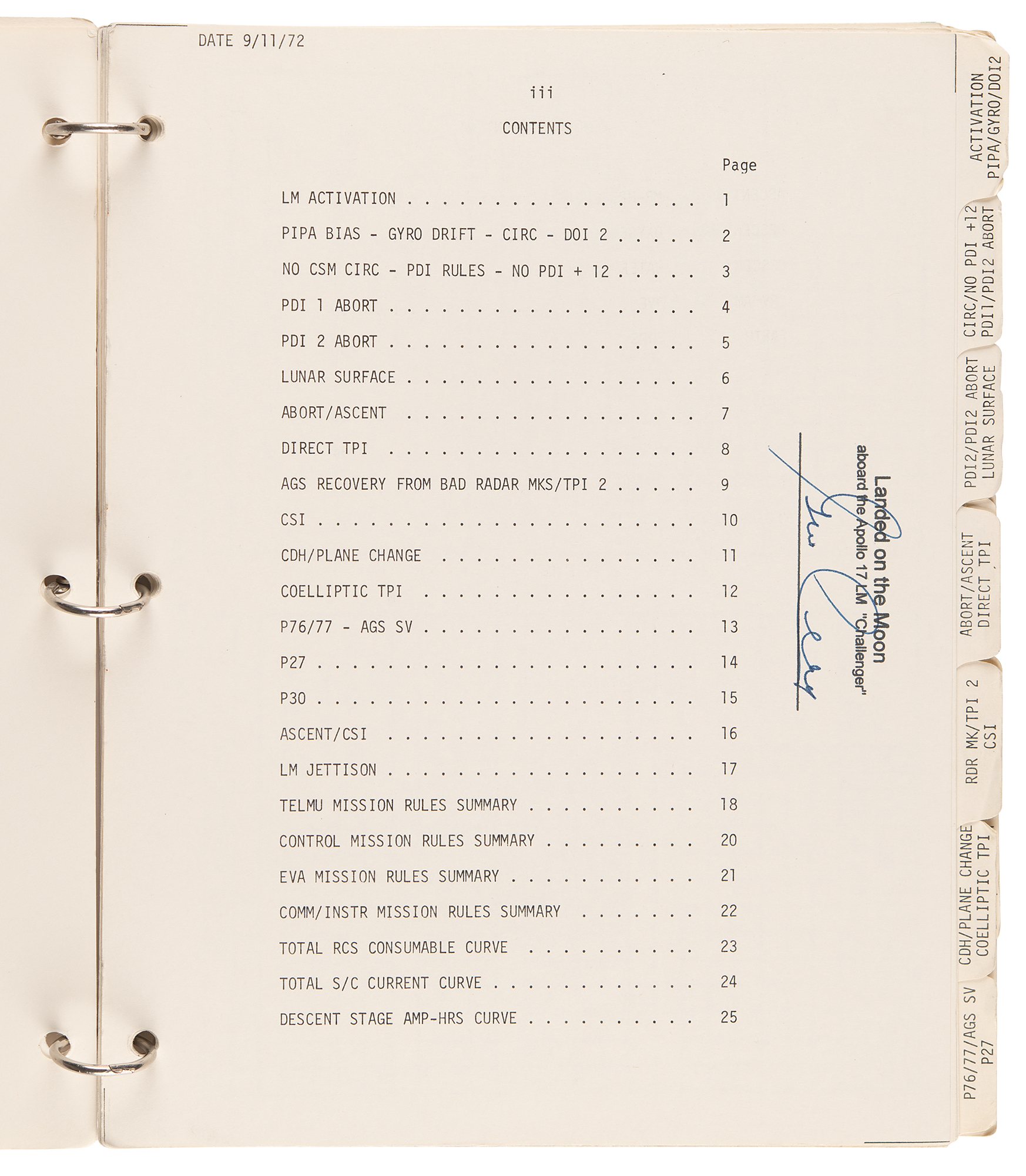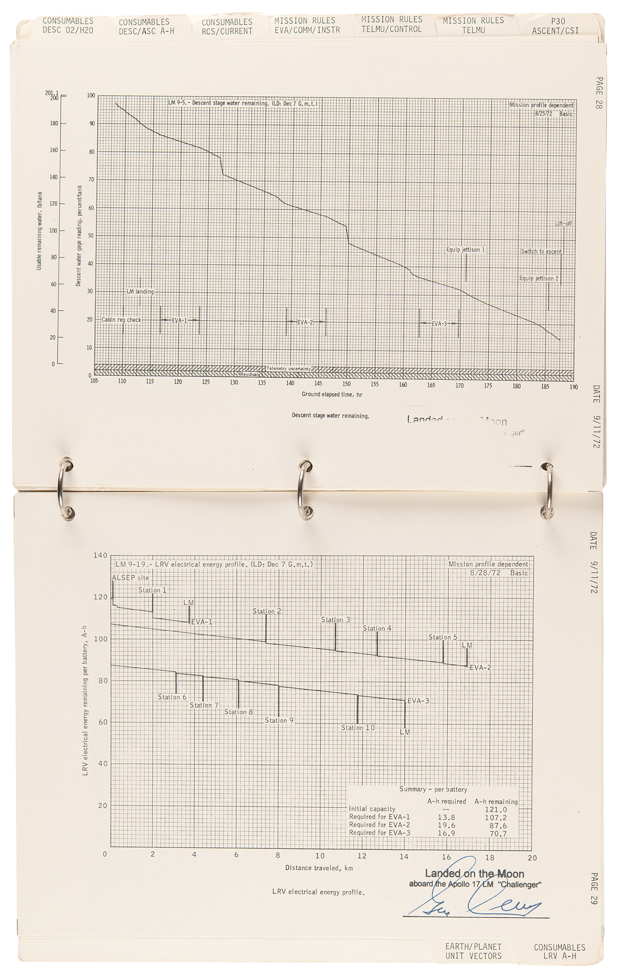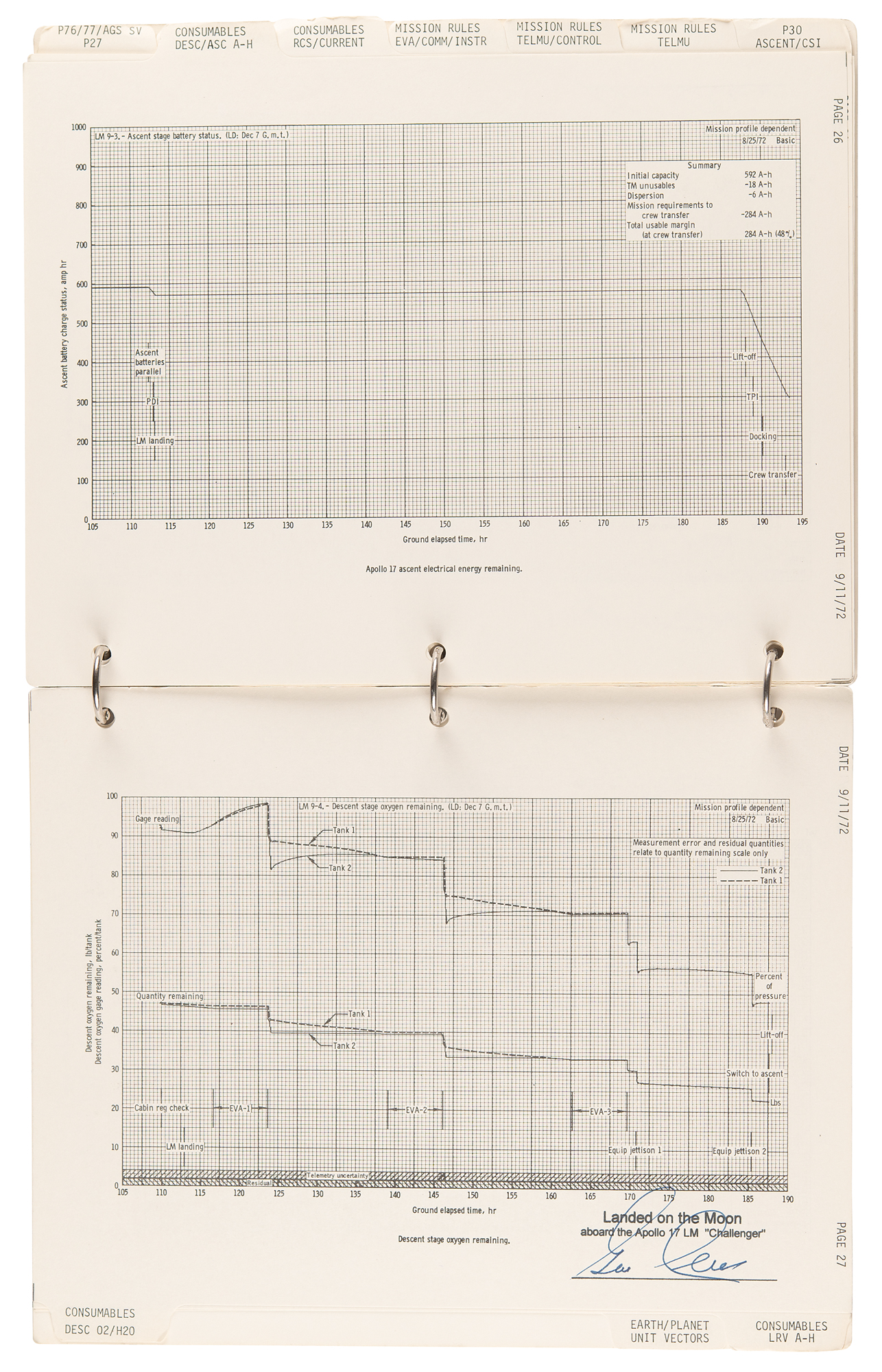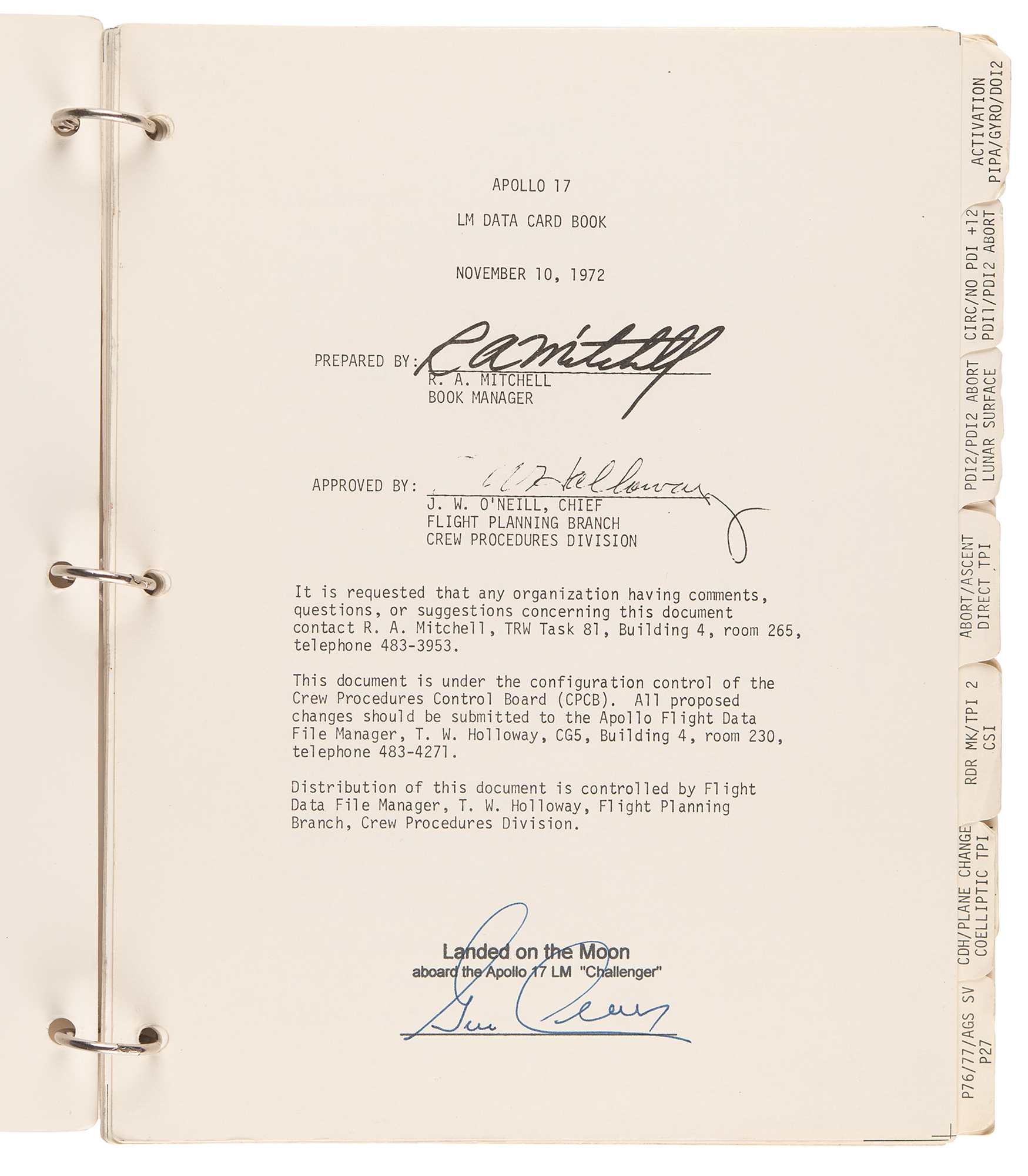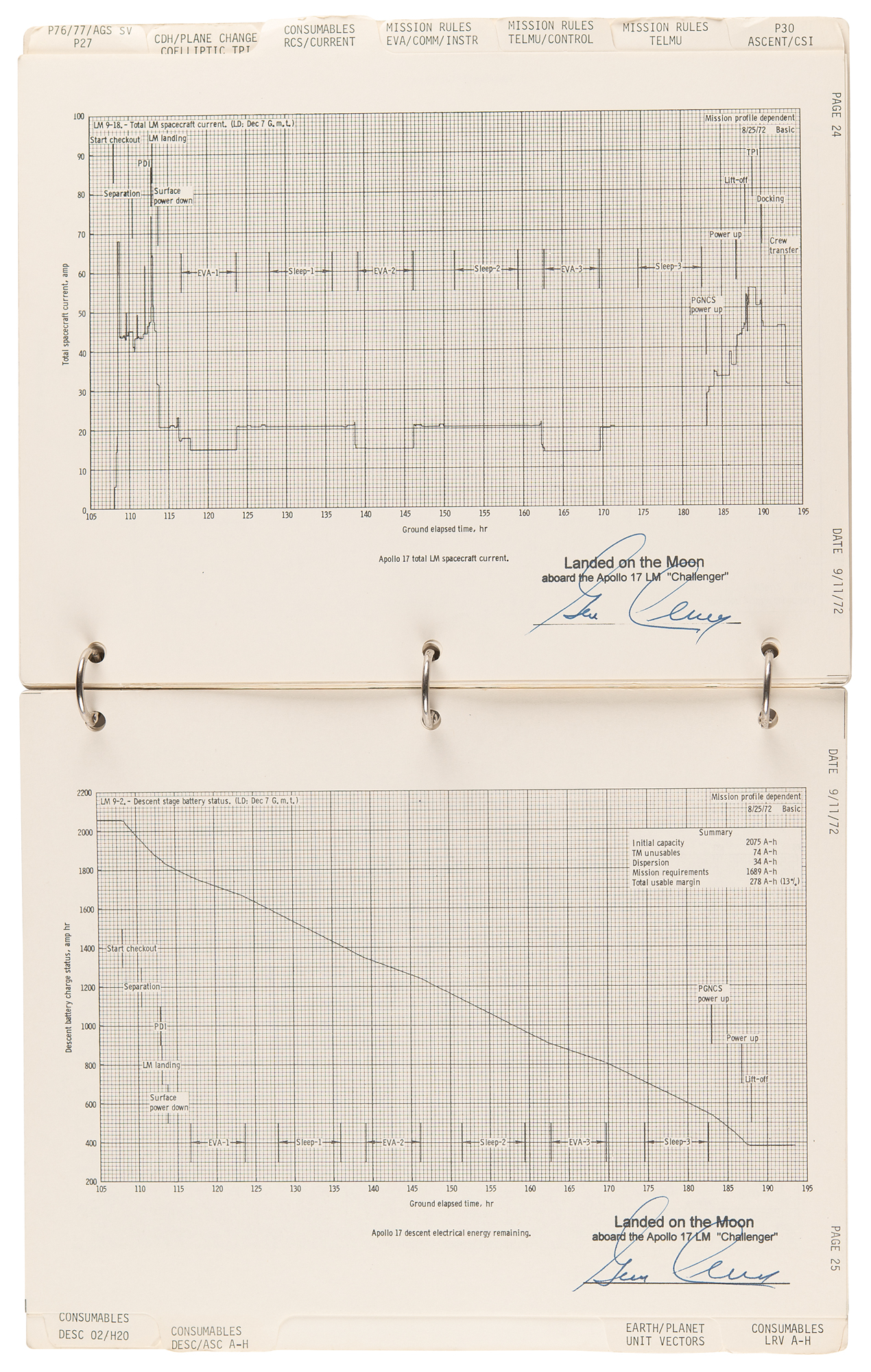 Gene Cernan’s flown ring-bound ‘LM Data Card Book’ that was carried to the lunar surface aboard the Lunar Module Challenger during the historic Apollo 17 mission, entitled “Apollo 17 / LM Data Card Book / Part No. SKB32100123-387, S/N 1001,” signed and flight-certified in blue felt tip on the front cover, “Flown to lunar surface, Apollo 17, Gene Cernan,” which also bears a provenance stamp from "The Eugene A. Cernan Space Collection.” The ‘LM Data Card Book,’ 8.5 x 10.5, contains a total of 20 independent leaves (including the front and back cardstock covers), each of which is signed neatly in felt tip by Cernan below his flight certification stamp: “Landed on the Moon, aboard the Apollo 17 LM ‘Challenger.’” Also of considerable interest are the opening 10 pages of the booklet, which contain ample felt tip numerical notations made by Cernan while at the Taurus–Littrow landing site. These relate to the following sections: ‘LM Activation Card,’ ‘CSM CIRC,’ ‘DOI-2,’ ‘PDI Rules,’ ‘NO PDI +12,’ ‘PDI 1 Abort Card,’ ‘PDI 2 Abort Card,’ ‘Lunar Surface Card,’ ‘Abort/Ascent Card,’ ‘Direct TPI Card,’ ‘AGS Recovery from Bad Radar Marks,’ and ‘CSI Card.’ In fine condition, with expected signs of age and use.