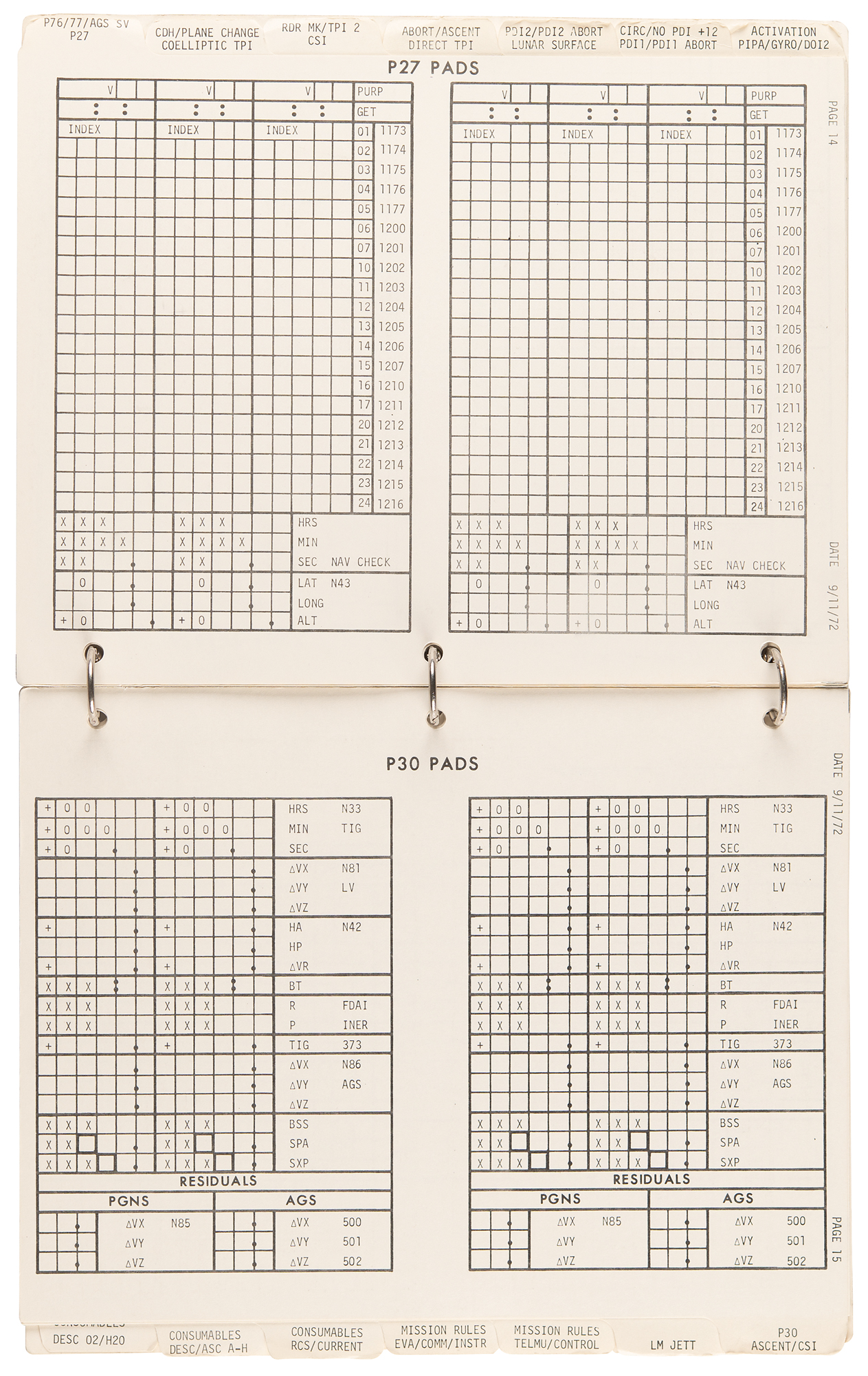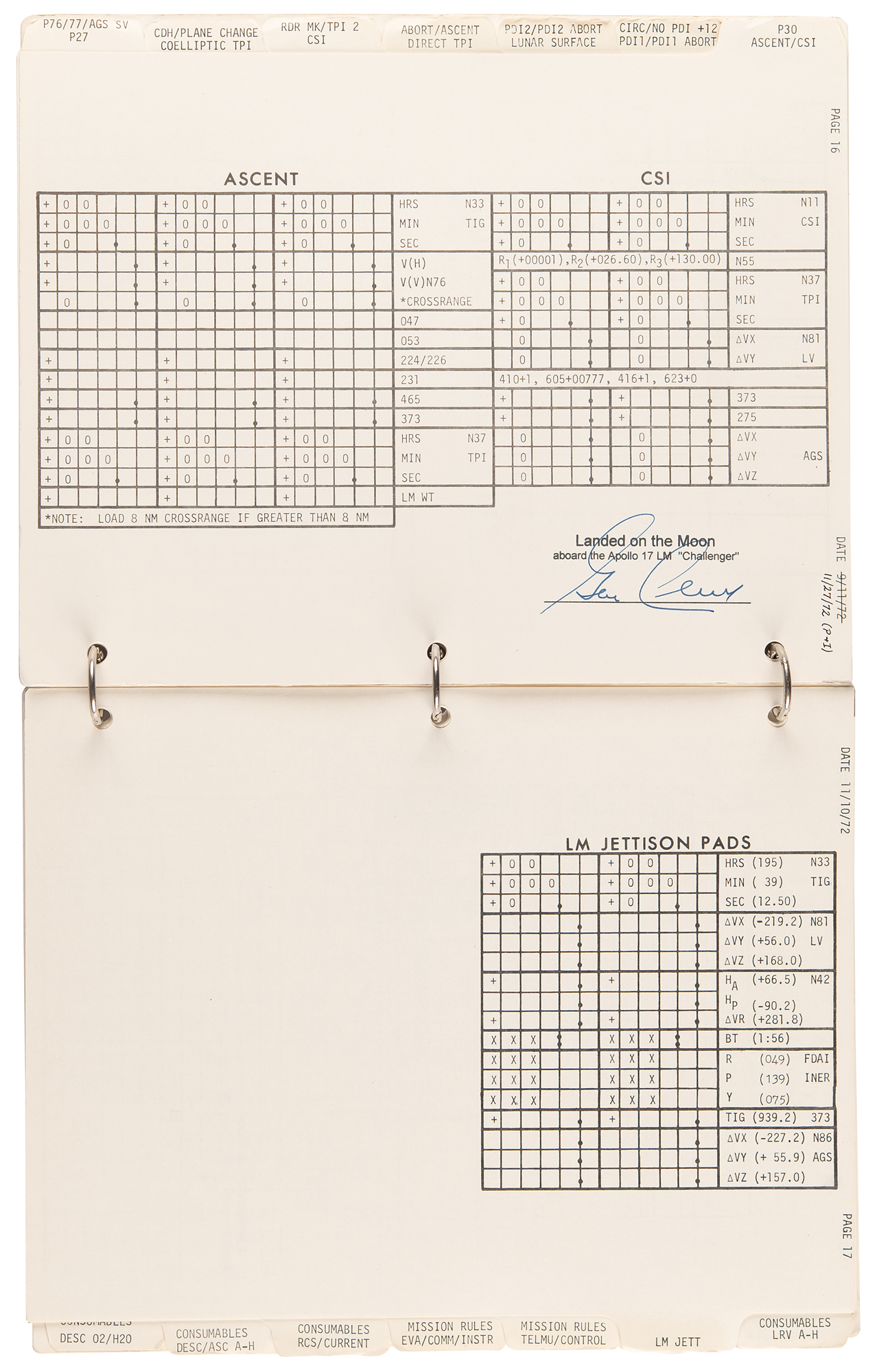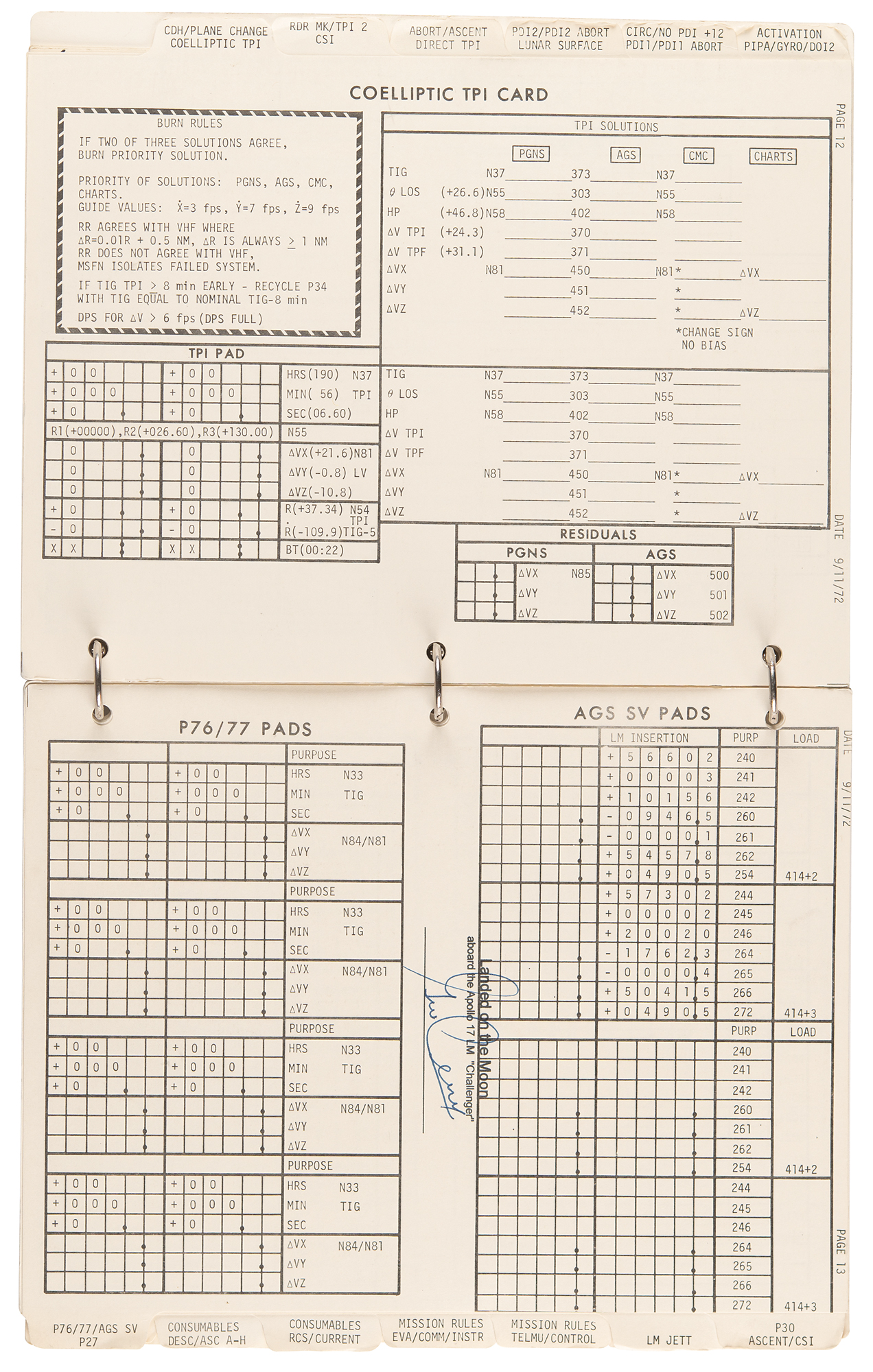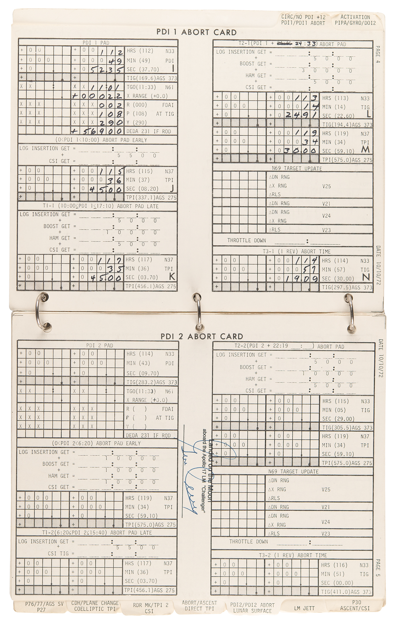 The LM Data Card Book contains templates for recording Pre-Advisory Data (PAD), which was used throughout the flight of the Lunar Module and our stay on the surface. Each card was used as a concise document for making notations on LM operations including LM activation, aborts, rendezvous and docking. When large lists of PAD numbers were read from Mission Control to Jack Schmitt and I while in the LM, we used this book to record the data necessary to carry out a particular maneuver. To simplify the voice transmission of these large lists of numbers and reduce the likelihood of errors, each type of PAD was precisely formatted and aligned for use in Mission Control and this book.