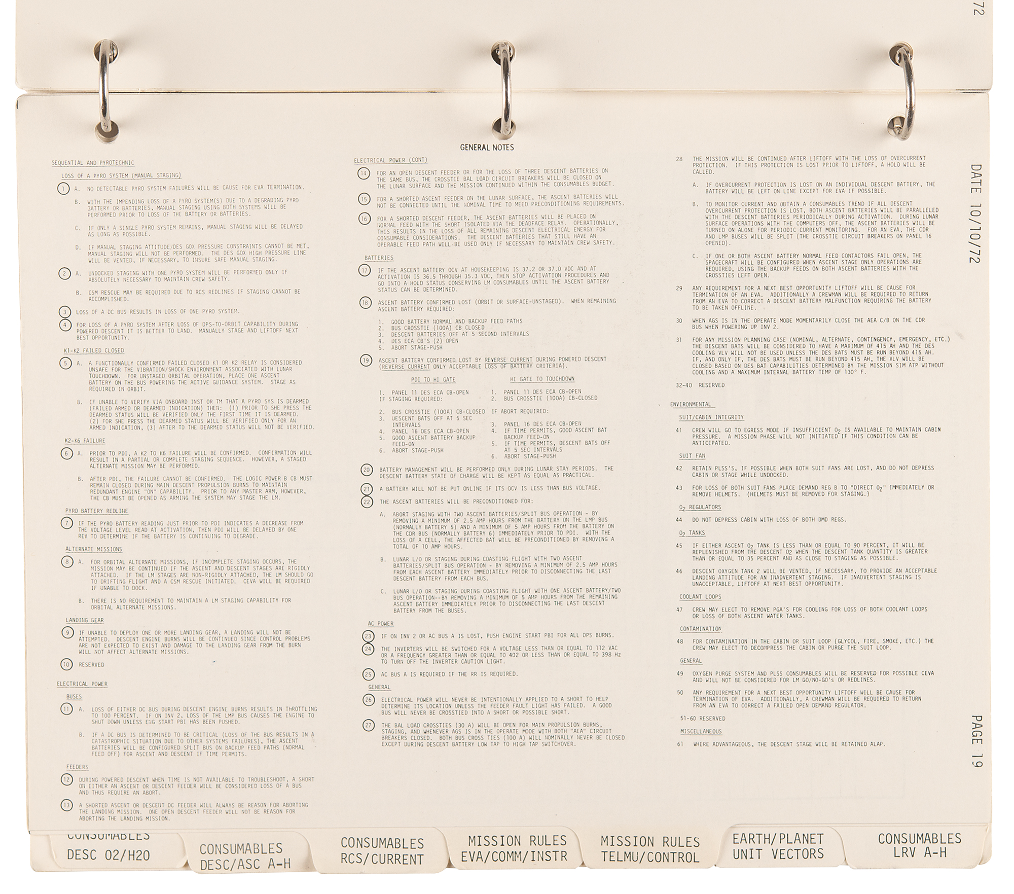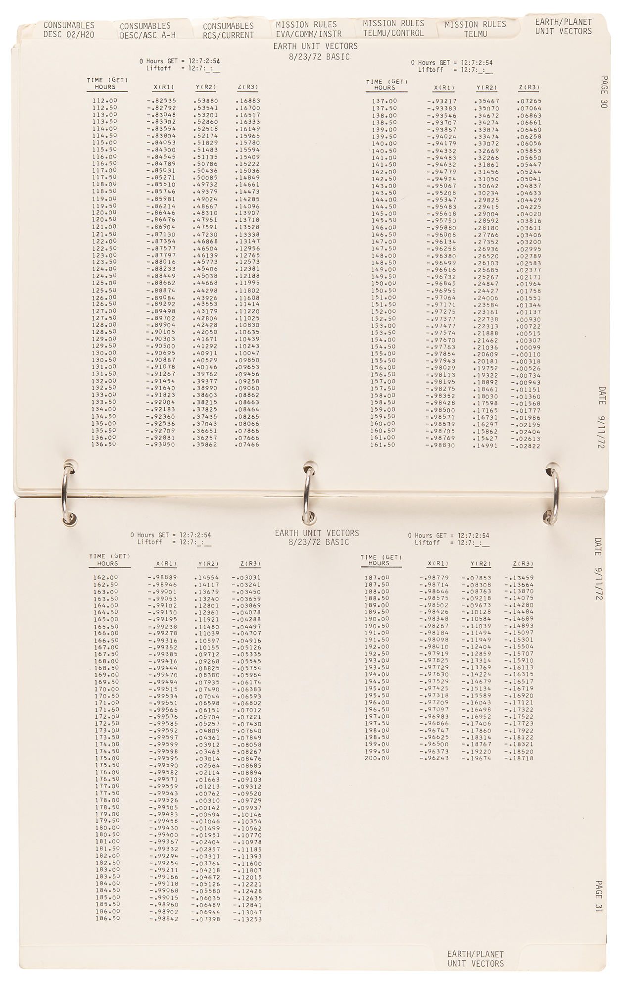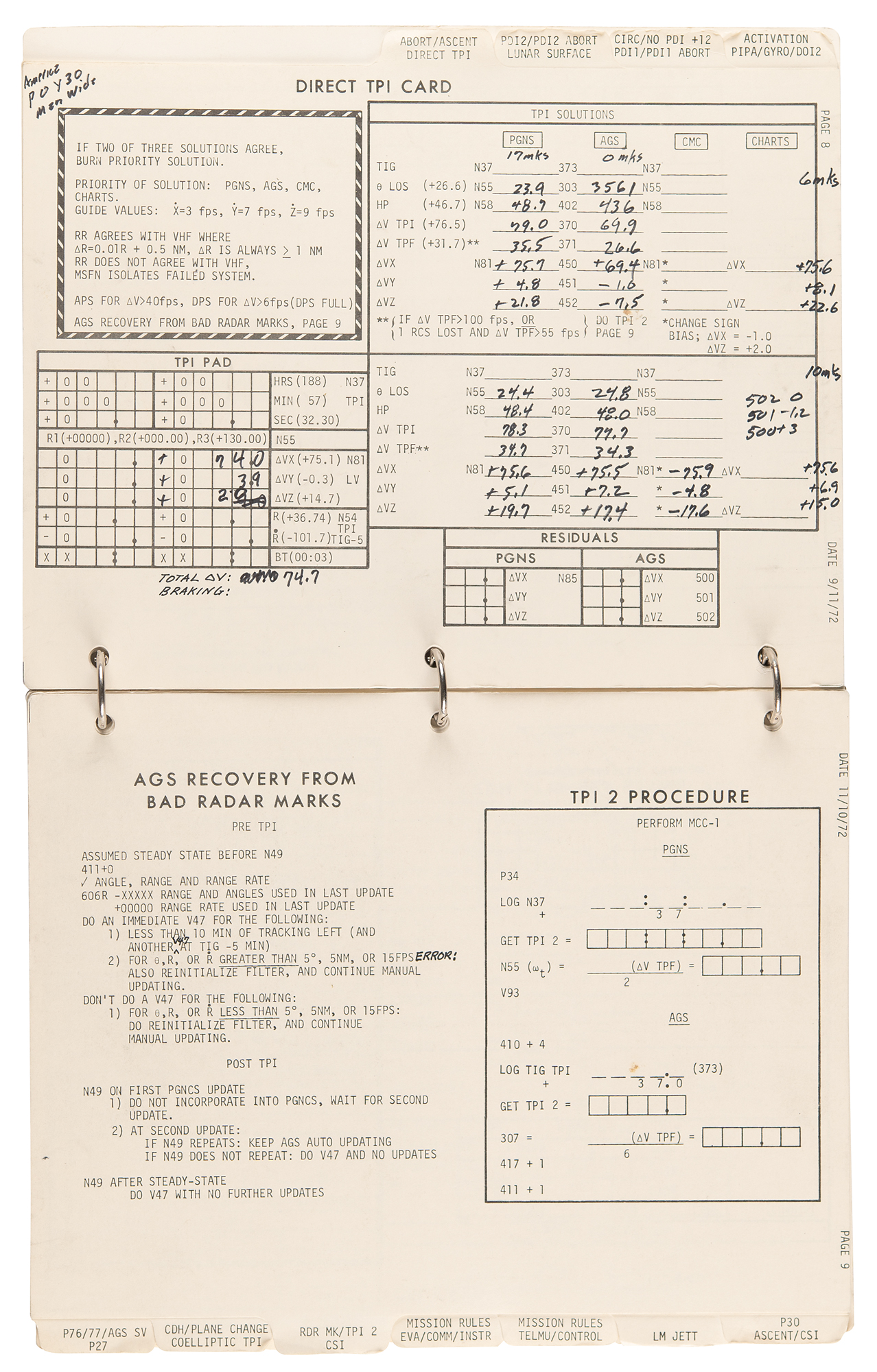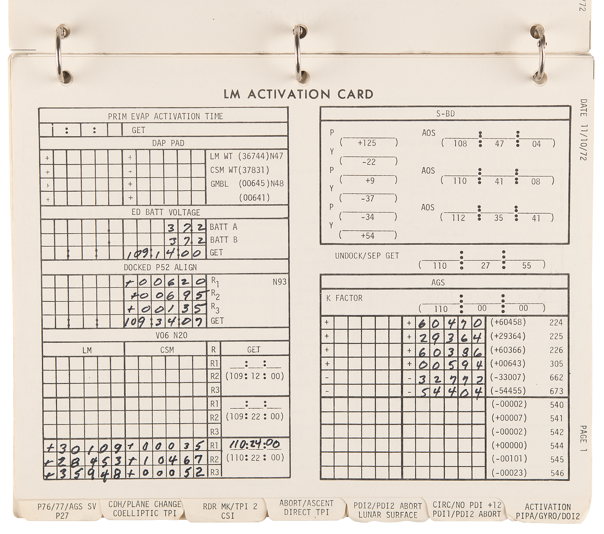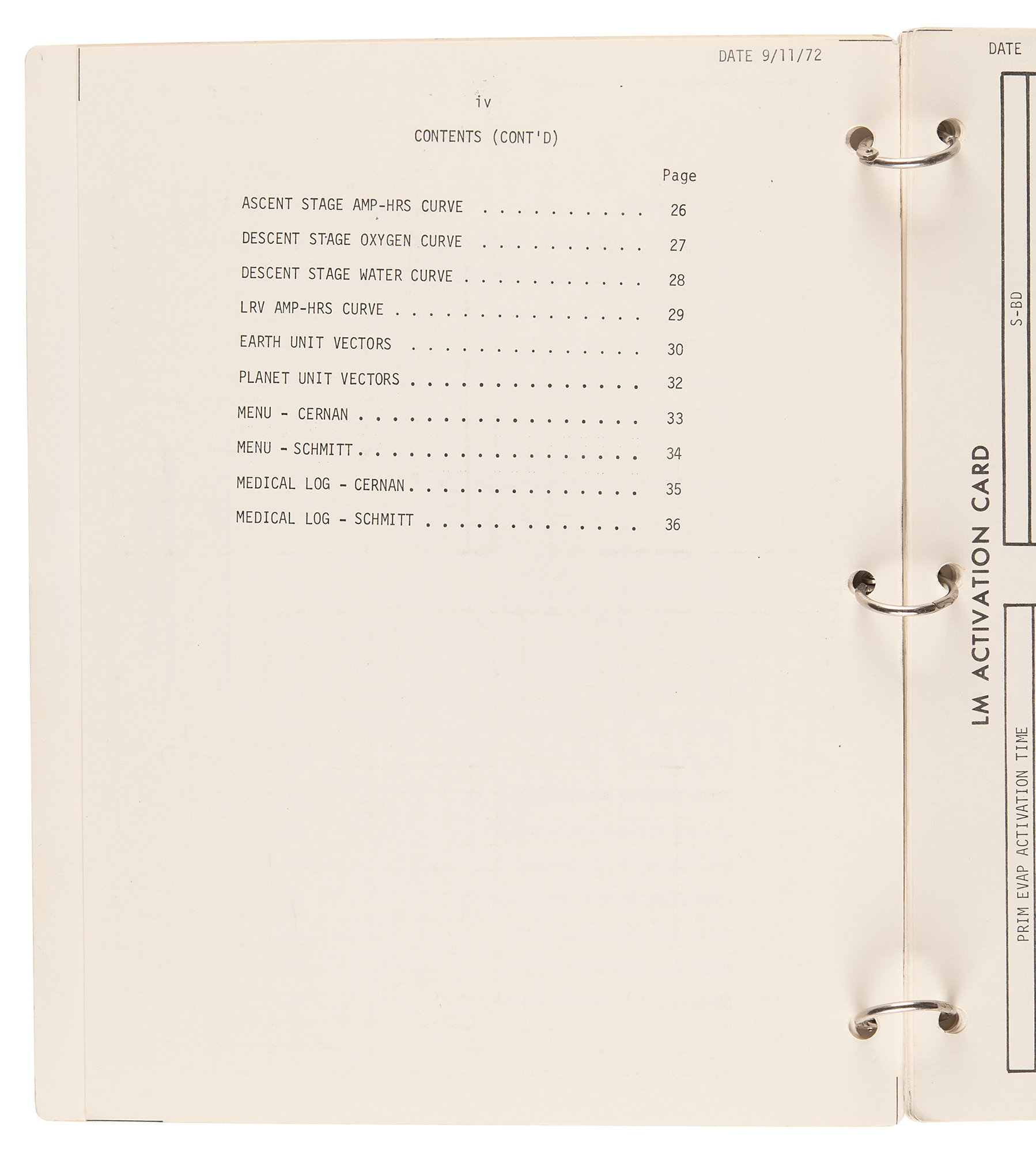 The LM Data Card Book contains templates for recording Pre-Advisory Data (PAD), which was used throughout the flight of the Lunar Module and our stay on the surface. Each card was used as a concise document for making notations on LM operations including LM activation, aborts, rendezvous and docking. When large lists of PAD numbers were read from Mission Control to Jack Schmitt and I while in the LM, we used this book to record the data necessary to carry out a particular maneuver. To simplify the voice transmission of these large lists of numbers and reduce the likelihood of errors, each type of PAD was precisely formatted and aligned for use in Mission Control and this book.