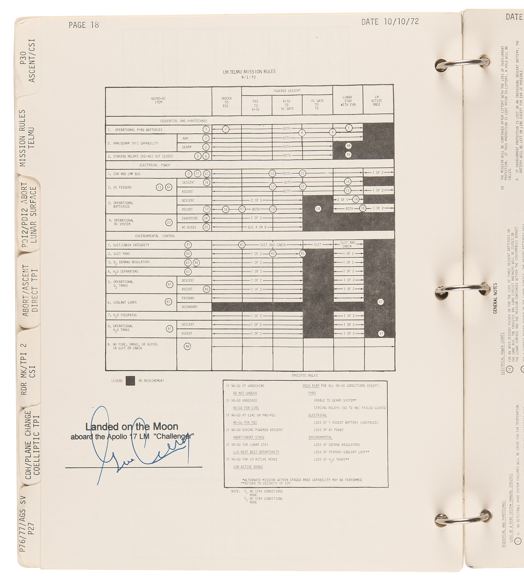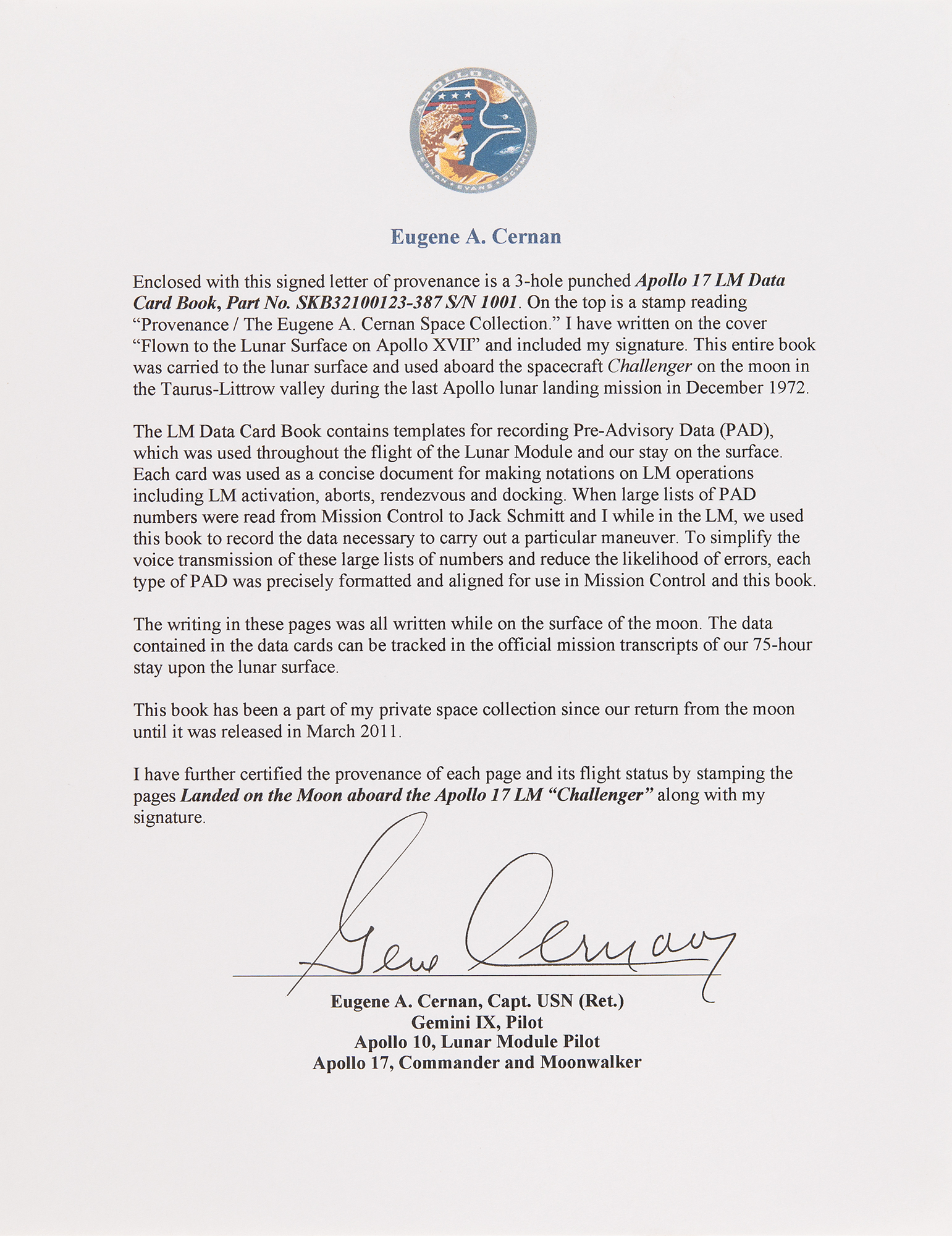 The writing in these pages was all written while on the surface of the moon. The data contained in the data cards can be tracked in the official mission transcripts of our 75-hour stay upon the lunar surface. This book has been a part of my private space collection since our return from the moon until it was released in March 2011. I have further certified the provenance of each page and its flight status by stamping the pages Landed on the Moon aboard the Apollo 17 LM ‘Challenger’ along with my signature.”