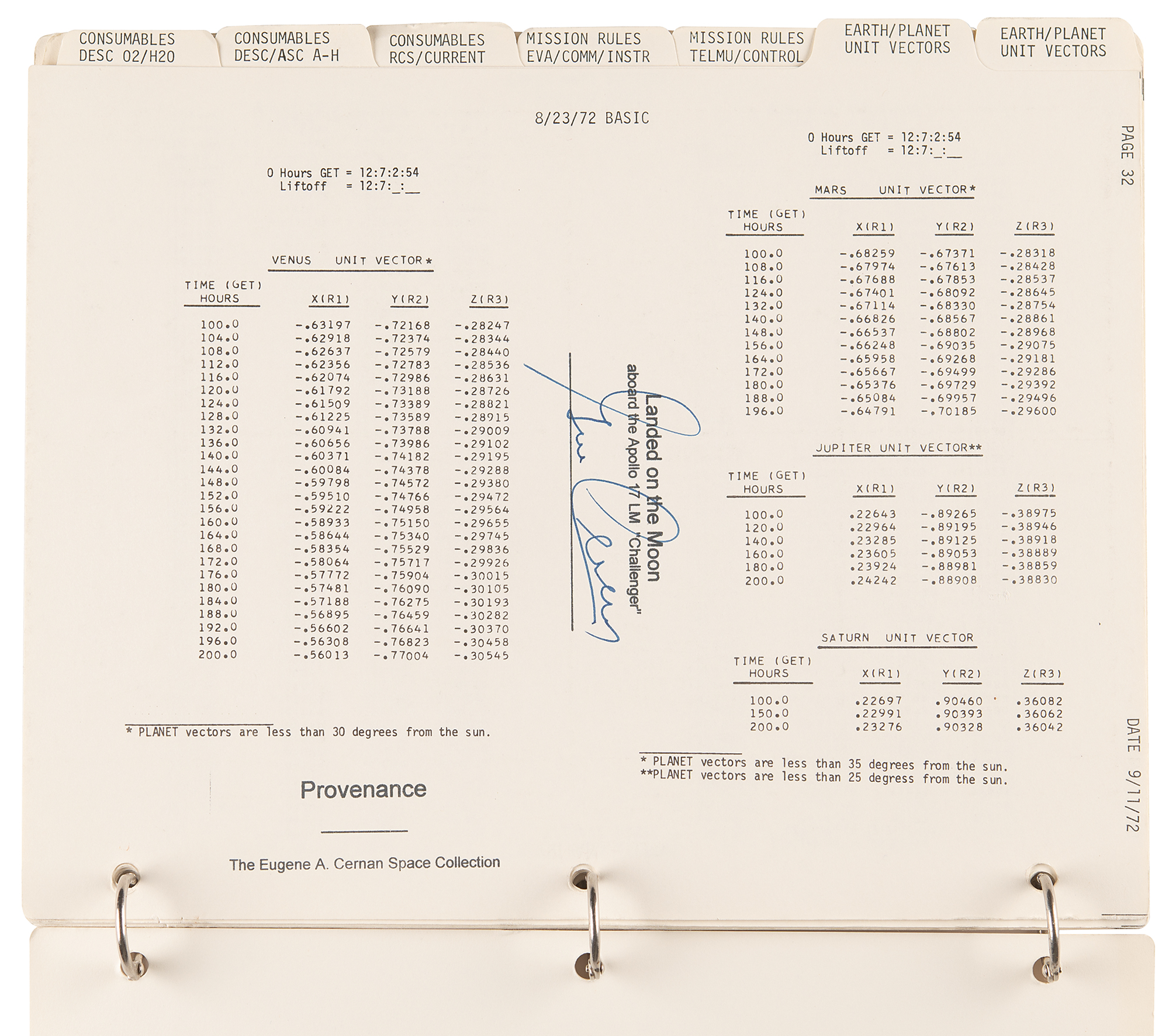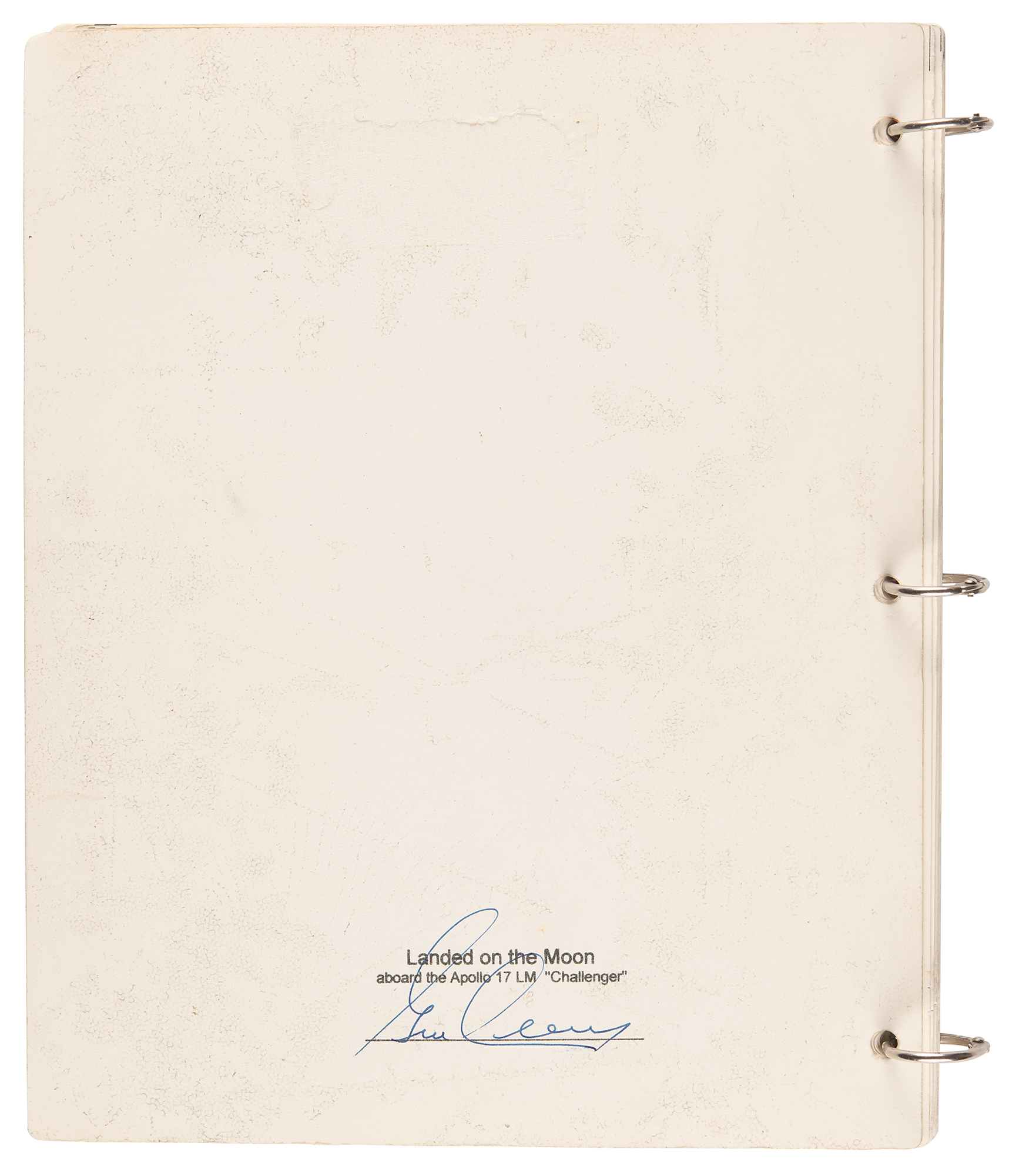 Accompanied by a signed letter of authenticity from Cernan, who writes: “Enclosed with this signed letter of provenance is a 3-hole punched Apollo 17 LM Data Card Book, Part No. SKB32100123-387 S/N 1001. On the top is a stamp reading ‘Provenance / The Eugene A. Cernan Space Collection.’ I have written on the cover ‘Flown to the Lunar Surface on Apollo XVII’ and included my signature. This entire book was carried to the lunar surface and used aboard the spacecraft Challenger on the moon in the Taurus-Littrow valley during the last Apollo lunar landing mission in December 1972.