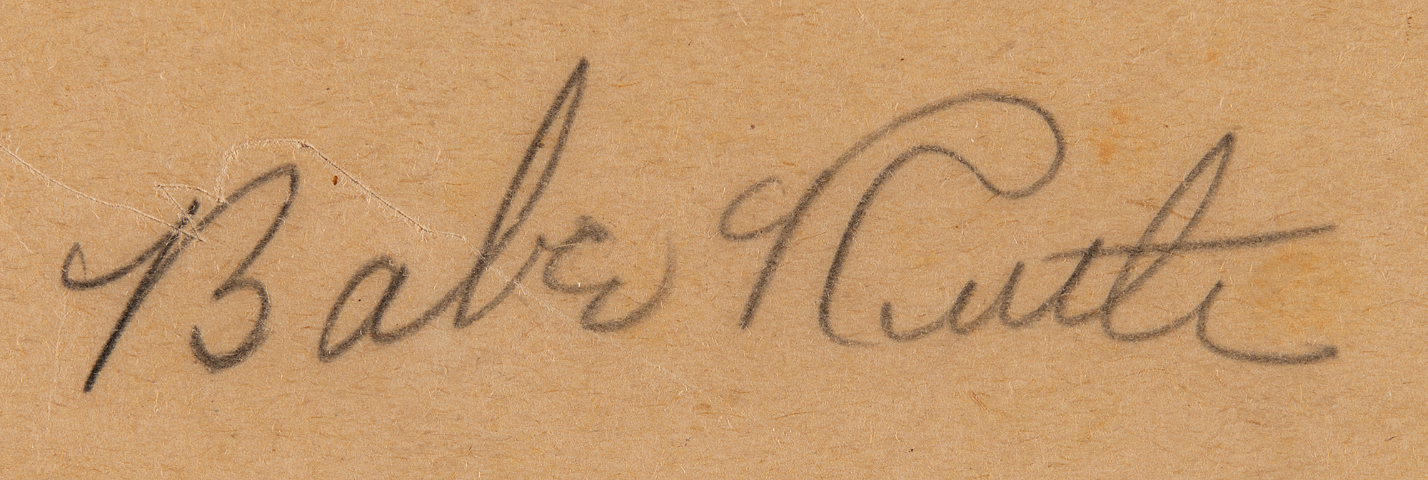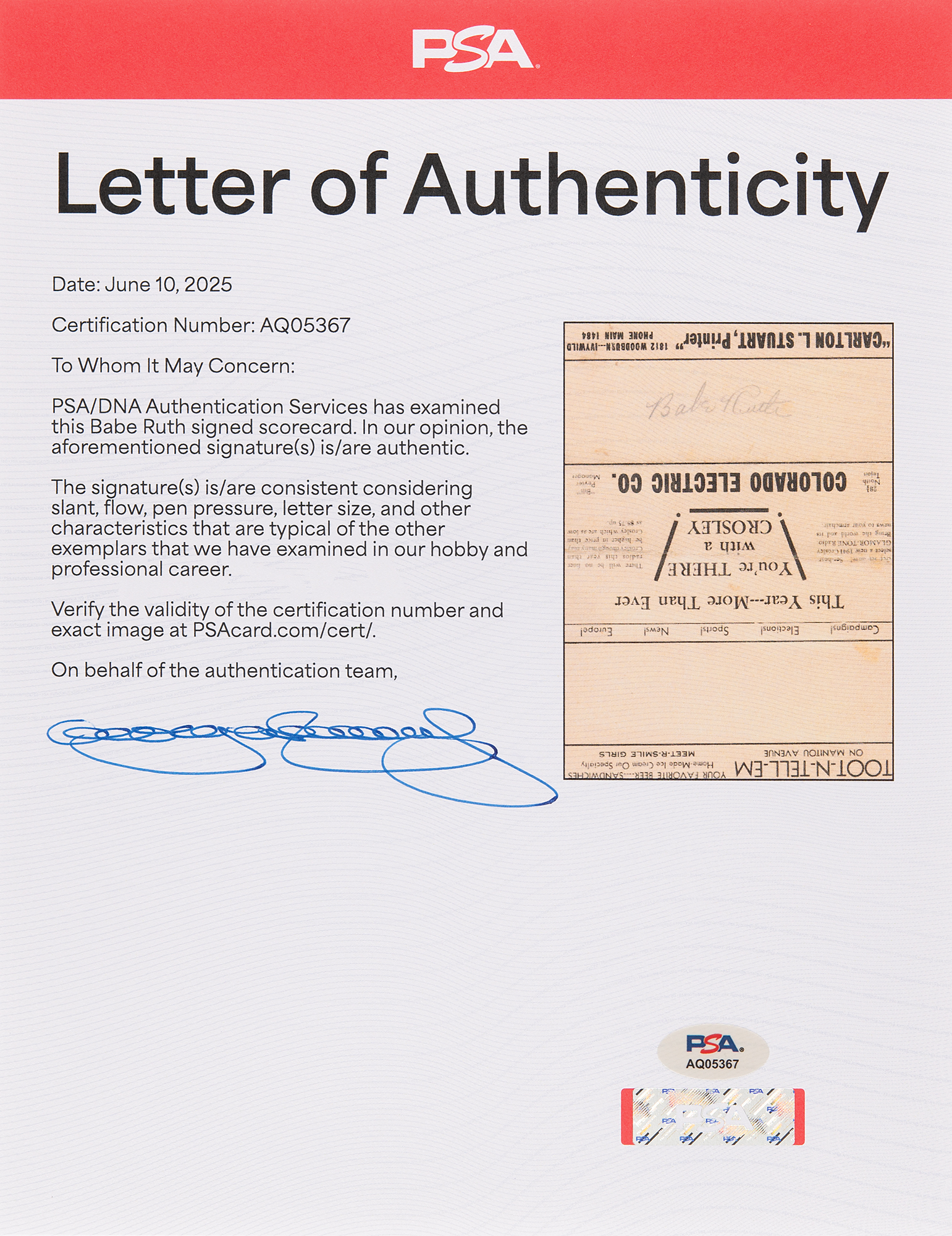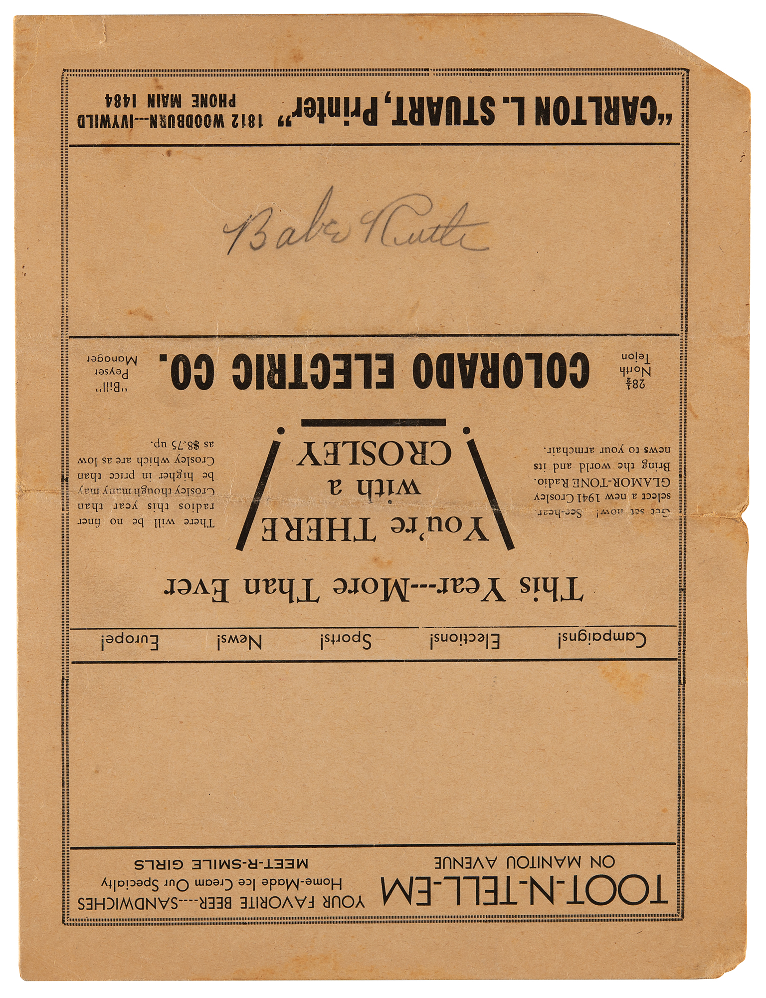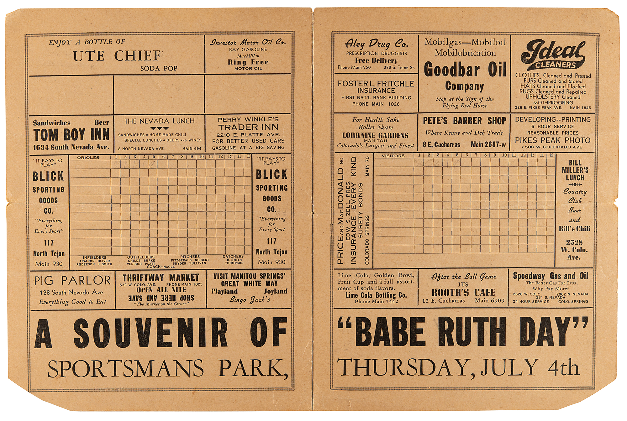 Scorecard for game between the Colorado Springs Orioles and Pueblo Peppers at Sportsman's Park, Colorado Springs, on July 4, 1940, two pages, 8 x 10.5, signed on the back cover in pencil, "Babe Ruth.". In very good to fine condition, with a central horizontal fold, scattered small stains, and trimming to one corner; a few of the innings boxes inside have bene lightly filled out in pencil. Accompanied by a full letter of authenticity from PSA/DNA.