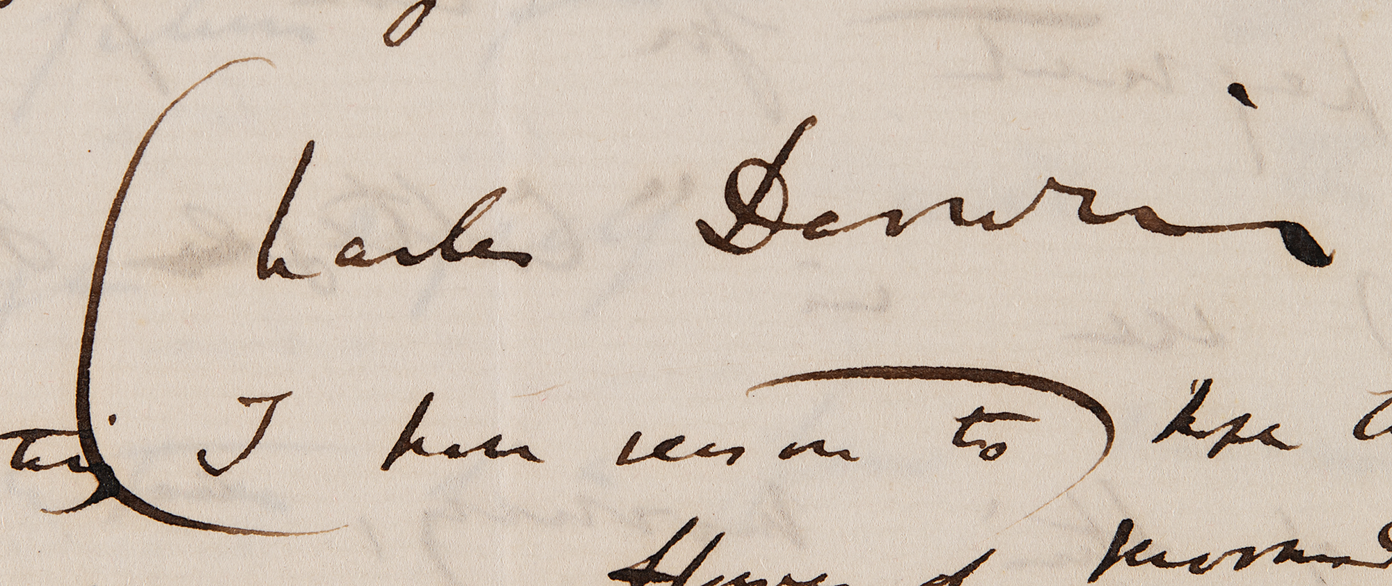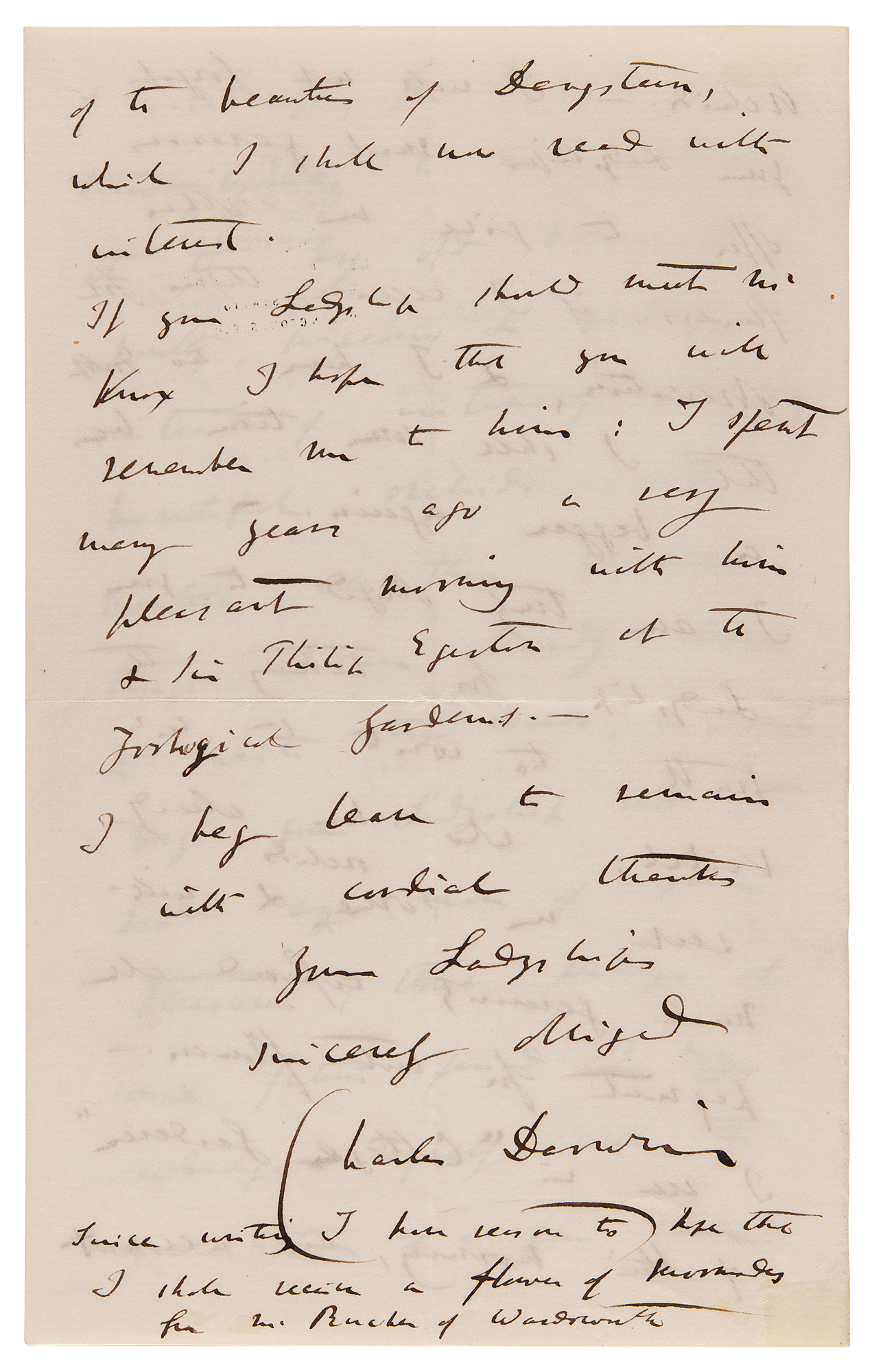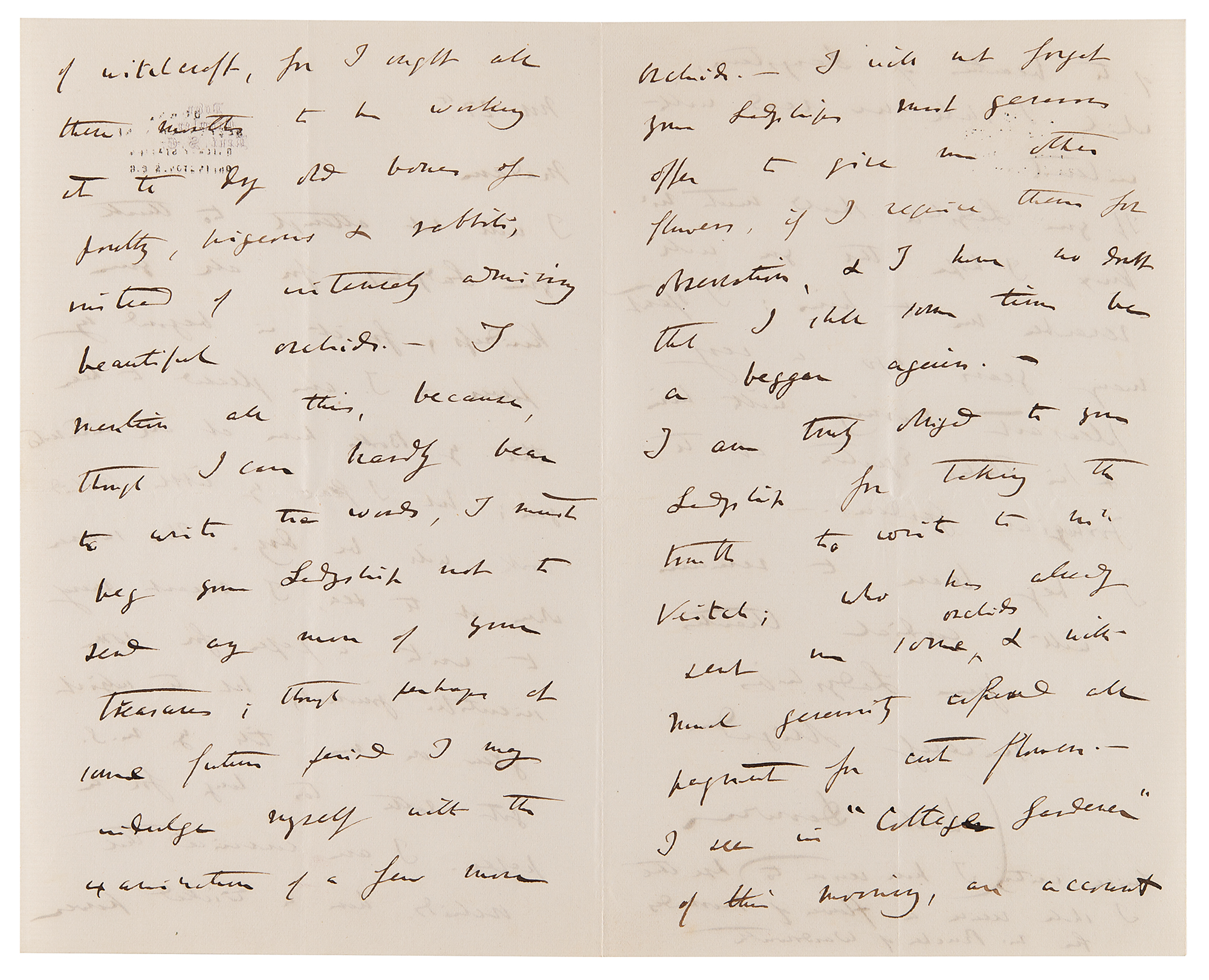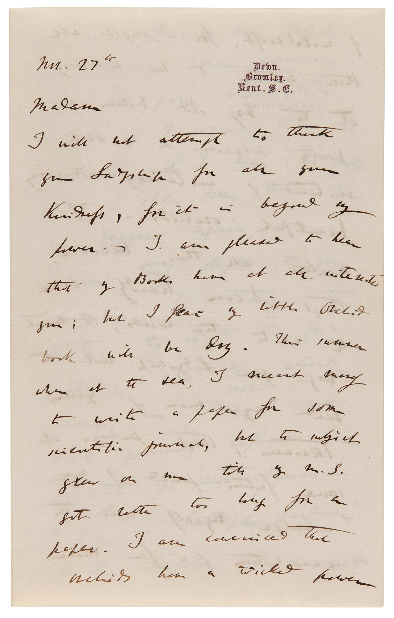 ALS signed “Charles Darwin,” four pages on two adjoining sheets, 5 x 8, Down letterhead, November 27, [1861]. Handwritten letter to horticulturalist Dorothy Fanny Nevill, who supplied Darwin with rare plants for his research and experimentation. In full: "I will not attempt to thank your Ladyship for all your kindness, for it is beyond my power—I am pleased to hear that my Books have at all interested you; but I fear my little Orchid book will be dry. This summer when at the sea, I meant merely to write a paper for some scientific journal, but the subject grew on me till my M.S. got rather too long for a paper. I am convinced that orchids have a wicked power of witchcraft, for I ought all these months to be working at the dry old bones of poultry, pigeons & rabbits, instead of intensely admiring beautiful orchids.—I mention all this, because, though I can hardly bear to write the words, I must beg your Ladyship not to send any more of your treasures; though perhaps at some future period I may indulge myself with the examination of a few more Orchids—I will not forget your Ladyship's most generous offer to give me other flowers, if I require them for observation, & I have no doubt that I shall some time be a beggar again.—