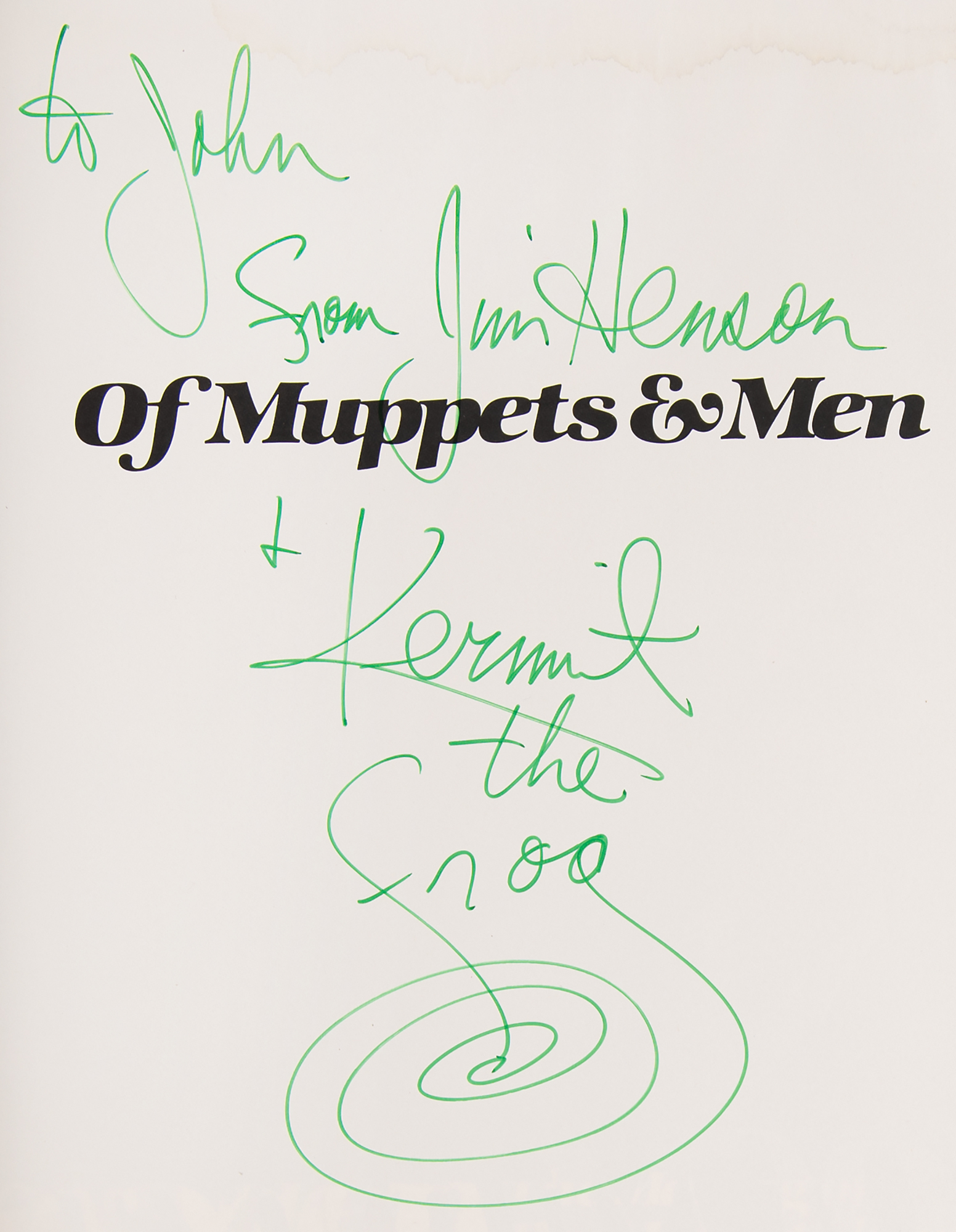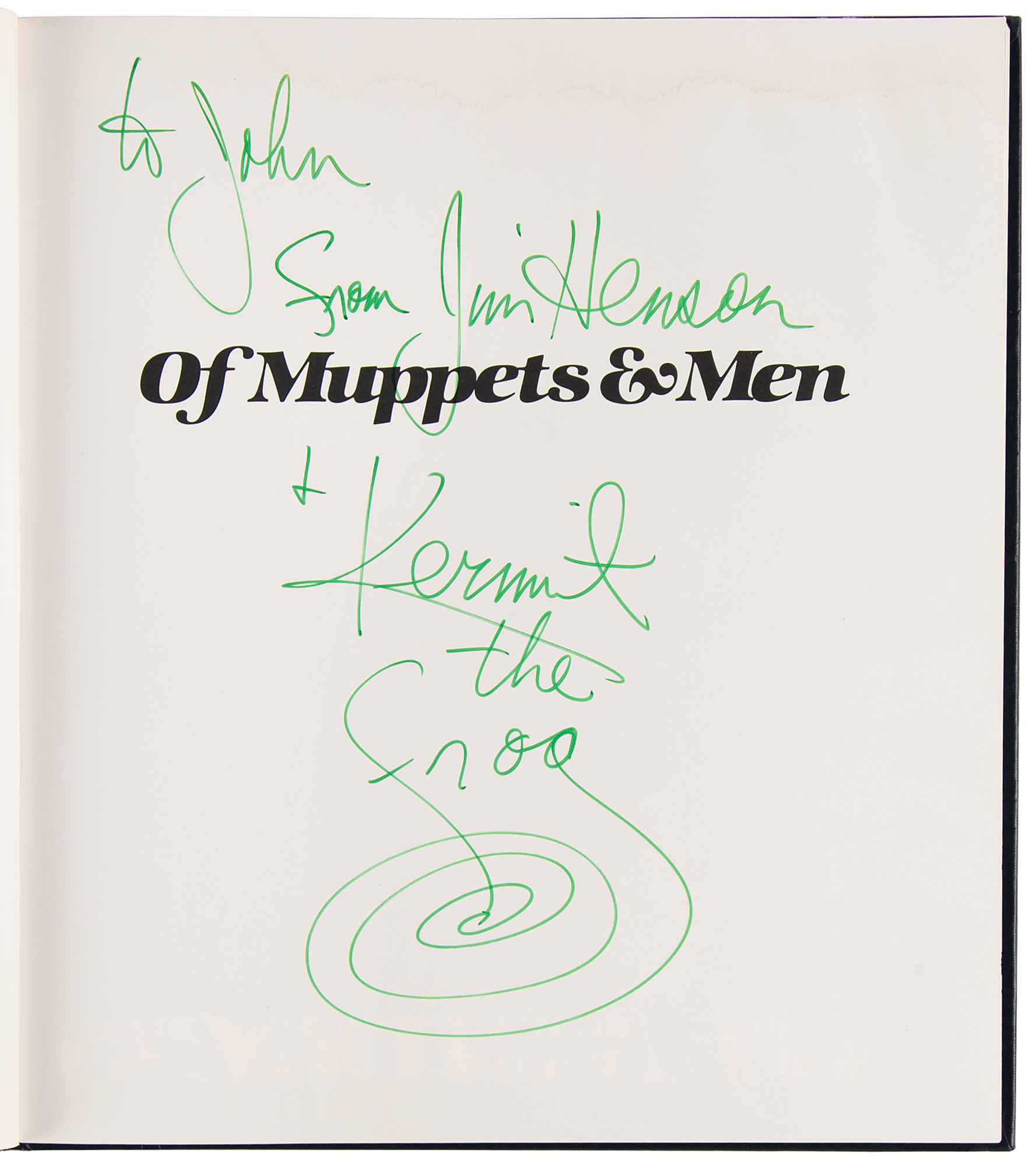 Signed book: Of Muppets & Men: The Making of the Muppet Show. First edition. NY: Alfred A. Knopf, 1981. Hardcover with dust jacket, 11.25 x 12.5, 179 pages. Signed and inscribed on the half-title page in green felt tip, "To John, from Jim Henson, & Kermit the Frog." In very good to fine condition, with light dampstaining, and associated light rippling, to the top edge of the signed page.