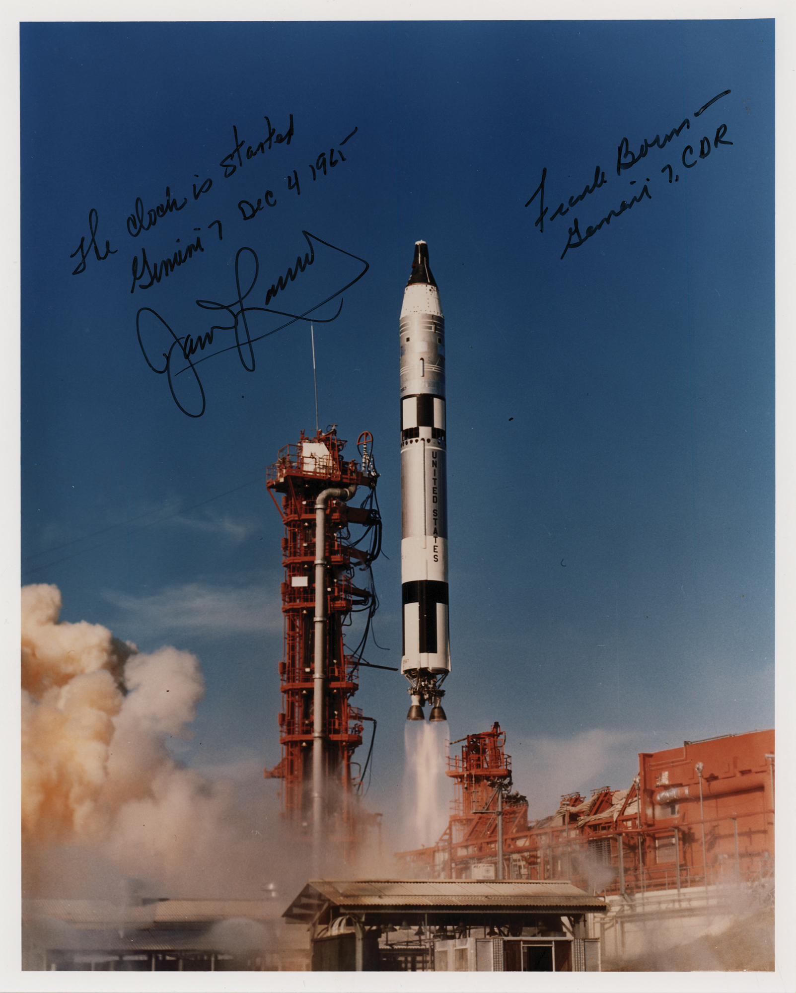 Color glossy 8 x 10 photo of the liftoff of Gemini 7, signed in black felt tip, "The clock has started, Gemini 7, Dec. 4, 1965, James Lovell," and "Frank Borman, Gemini 7, CDR." In very fine condition.
