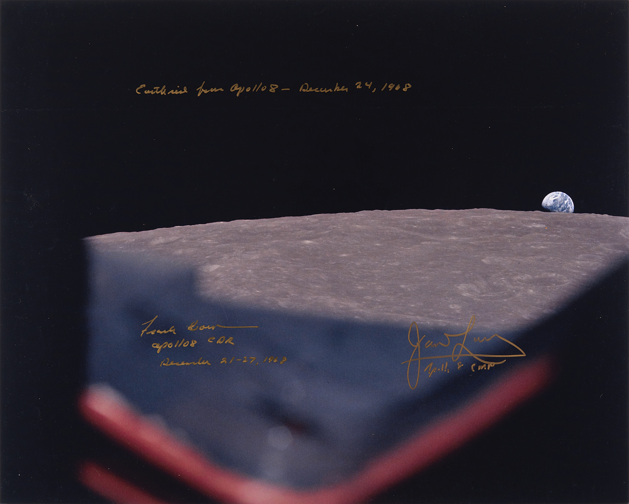 Color glossy 20 x 16 photo of the 'earthrise' taken from a window of the Apollo command module, signed in gold ink, "Earthrise from Apollo 8-December 24, 1968, Frank Borman, Apollo 8 CDR, December 21-27, 1968" and "James Lovell, Apollo 8 CMP." In fine condition.