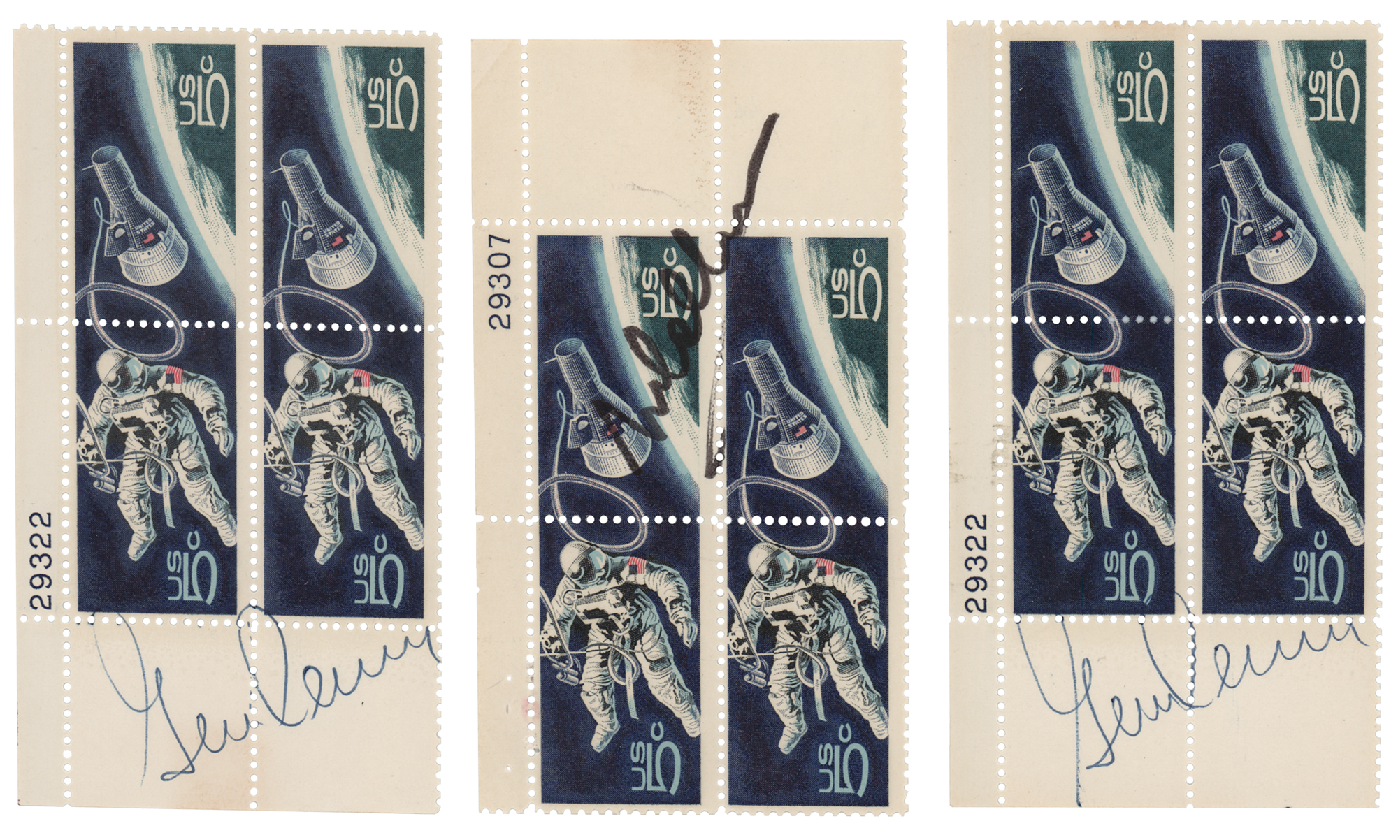 Three blocks of four five-cent US postage stamps honoring Ed White’s Gemini 4 spacewalk, 4 x 2.25, two signed in the blank left panel in blue ballpoint by Gene Cernan, and one signed over the image in black felt tip by Michael Collins. In fine condition.