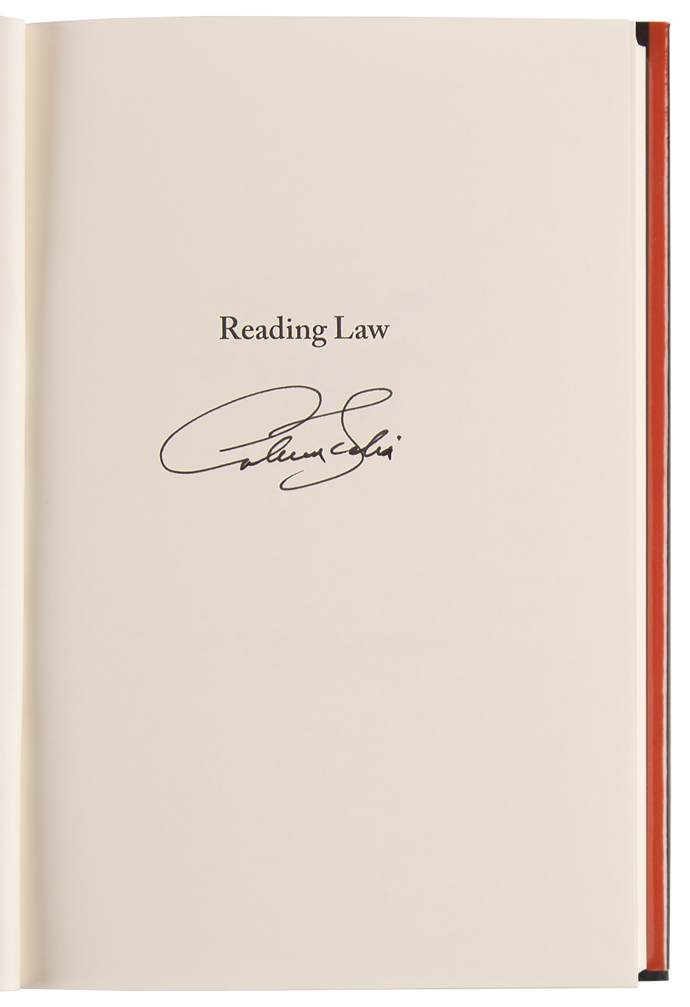 Signed book: Reading Law: The Interpretation of Legal Texts. First edition. St. Paul, MN: Thomson/West, 2012. Hardcover with dust jacket, 6.5 x 9.5, 567 pages. Signed on the half-title page in black felt tip by Antonin Scalia. In very fine condition.