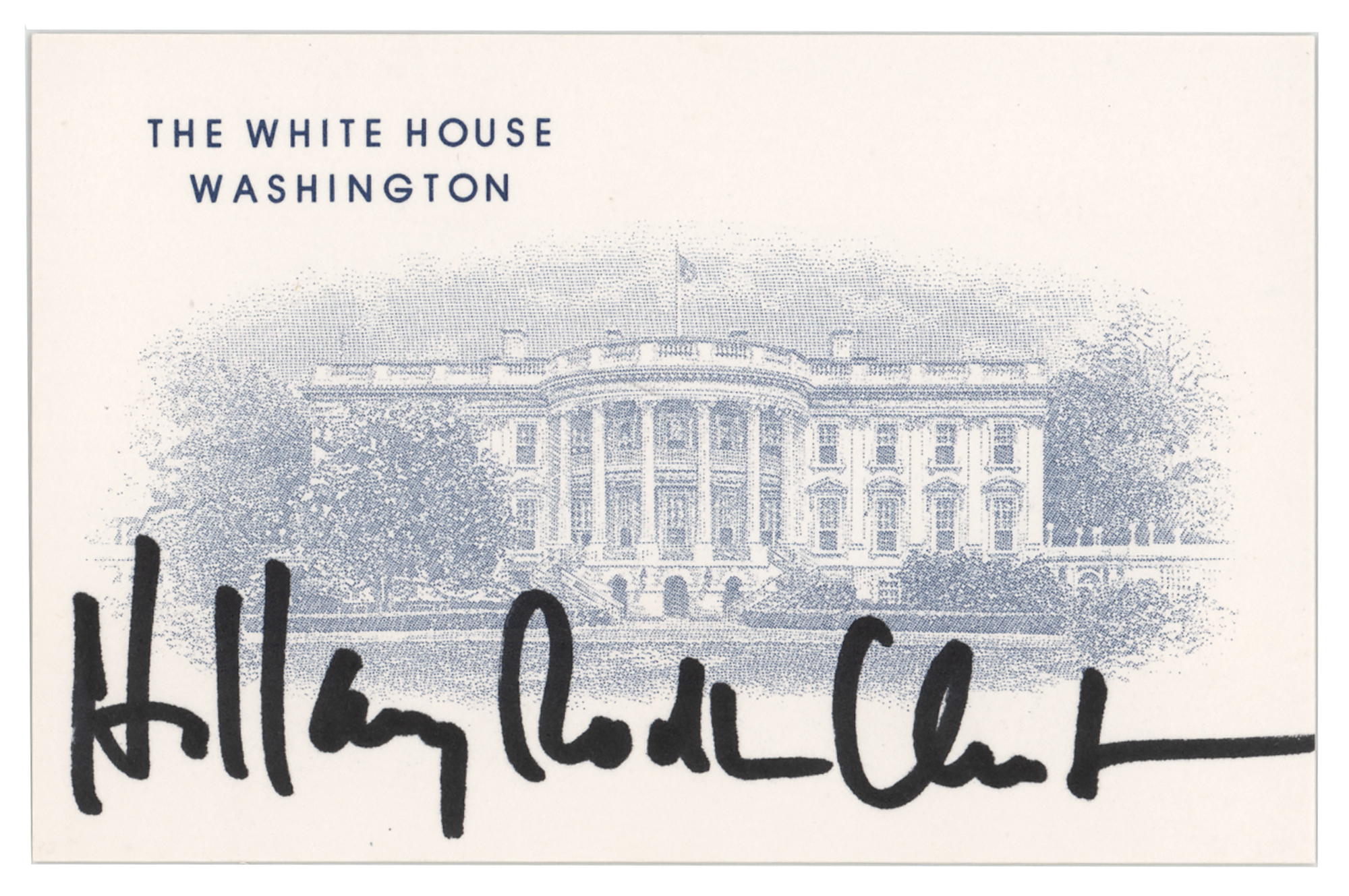 White House card with an attractive vignette, signed in black felt tip, "Hillary Rodham Clinton." In very fine condition. Consignor notes that the card was signed at a fundraiser in Alexandria, VA, June 30, 2005. Related Washington Post article about the event included.