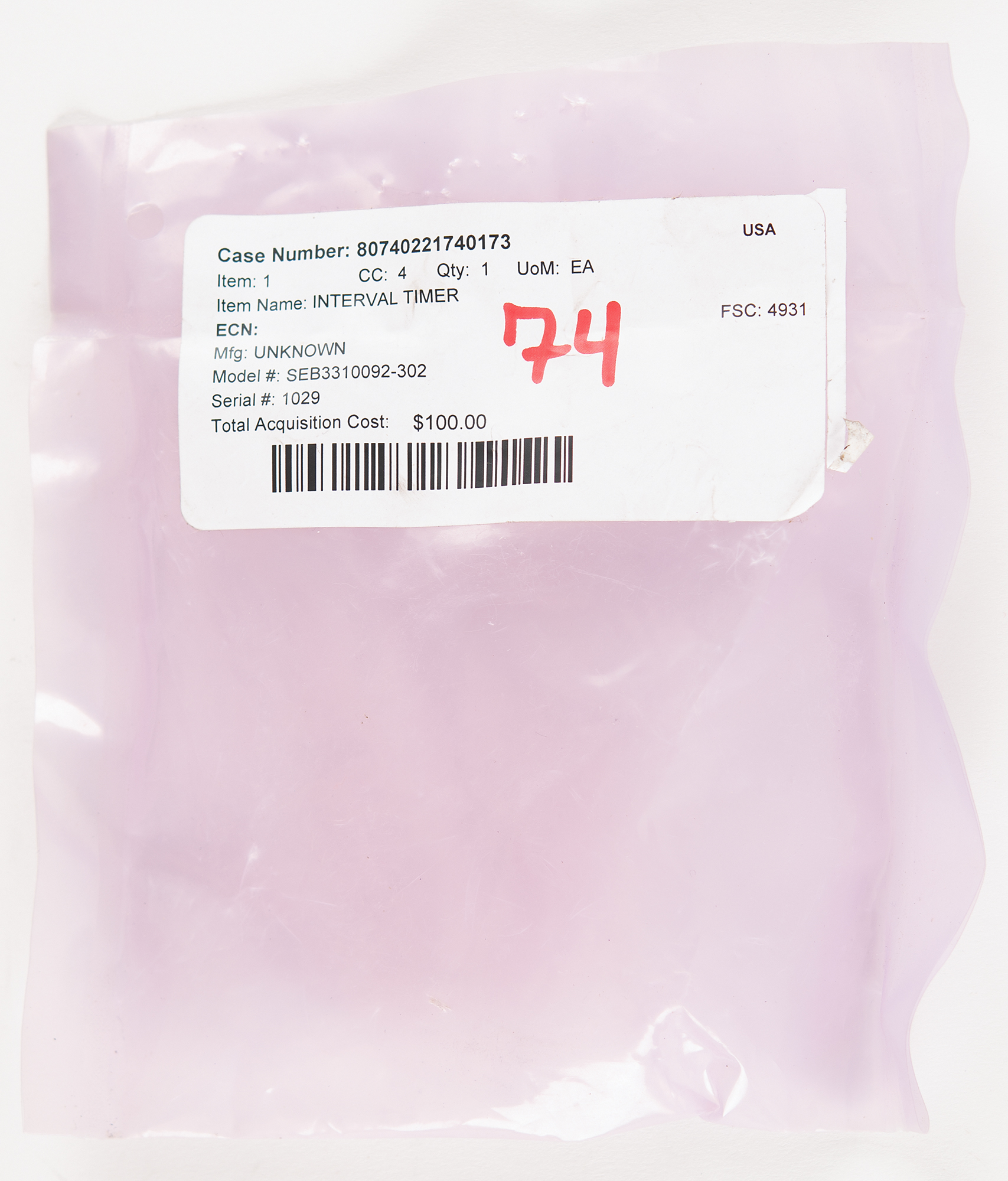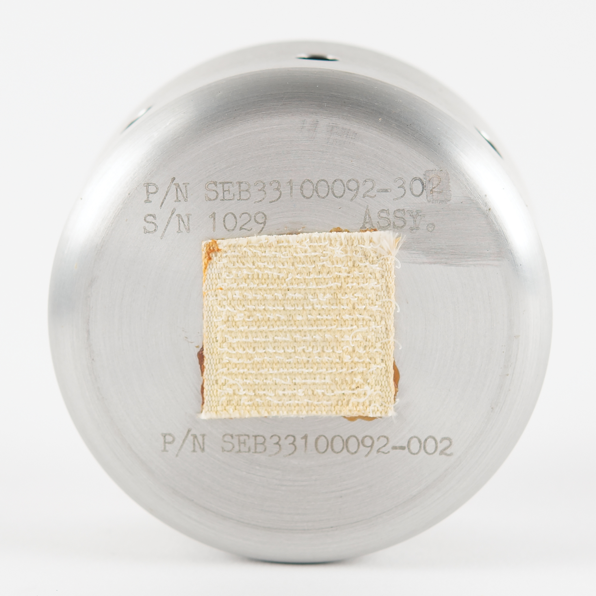 A stainless steel Apollo Interval Timer (also known as a two-speed timer) as used on Apollo 10–17, measuring 2.75˝ in diameter and 2˝ tall, engraved on the back with part numbers: "P/N SEB33100092-302, S/N 1029 Assy., P/N SEB33100092-002." Reverse also bears an affixed Velcro swatch. Timer is in fine cosmetic condition; while it does rotate when wound, it does not seem to sound its bell consistently. Accompanied by its plastic bag with deaccession label.